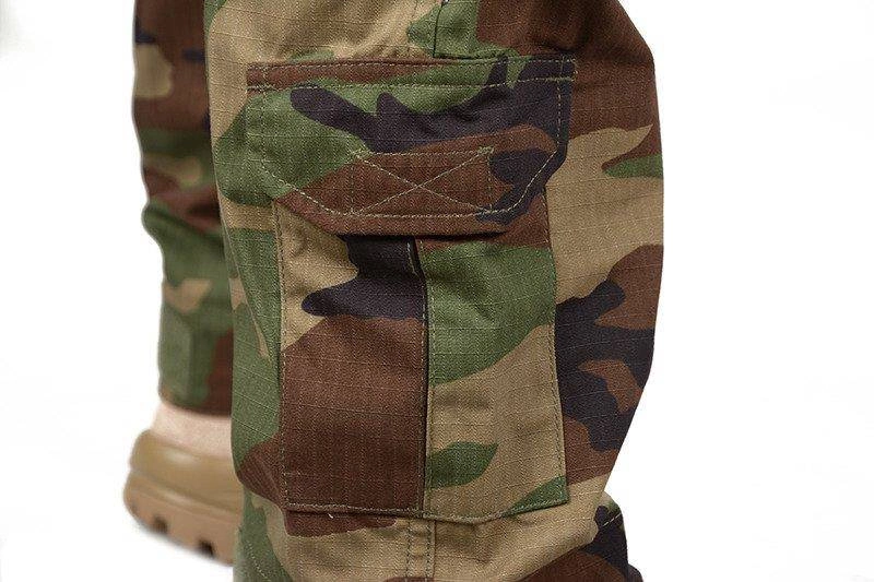 Spodnie posiadają aż 10 ergonomicznie rozmieszczonych kieszeni. Wokół zintegrowanych nakolanników oraz bezpośrednio pod pasem znajdują się wstawki z elastycznego materiału, co ma zwiększać komfort poruszania się w tym mundurze. Zarówno nakolanniki jak i nałokietniki można bez trudu wyjąć gdy zajdzie taka potrzeba. Obwód dolnej części nogawek można wyregulowac przy pomocy taśm z rzepem, podobnie regulatory znajdują się przy nakolannikach. Spodnie również zostały wykonane z tkaniny NYCO rip-stop o składzie 65/35.