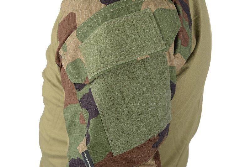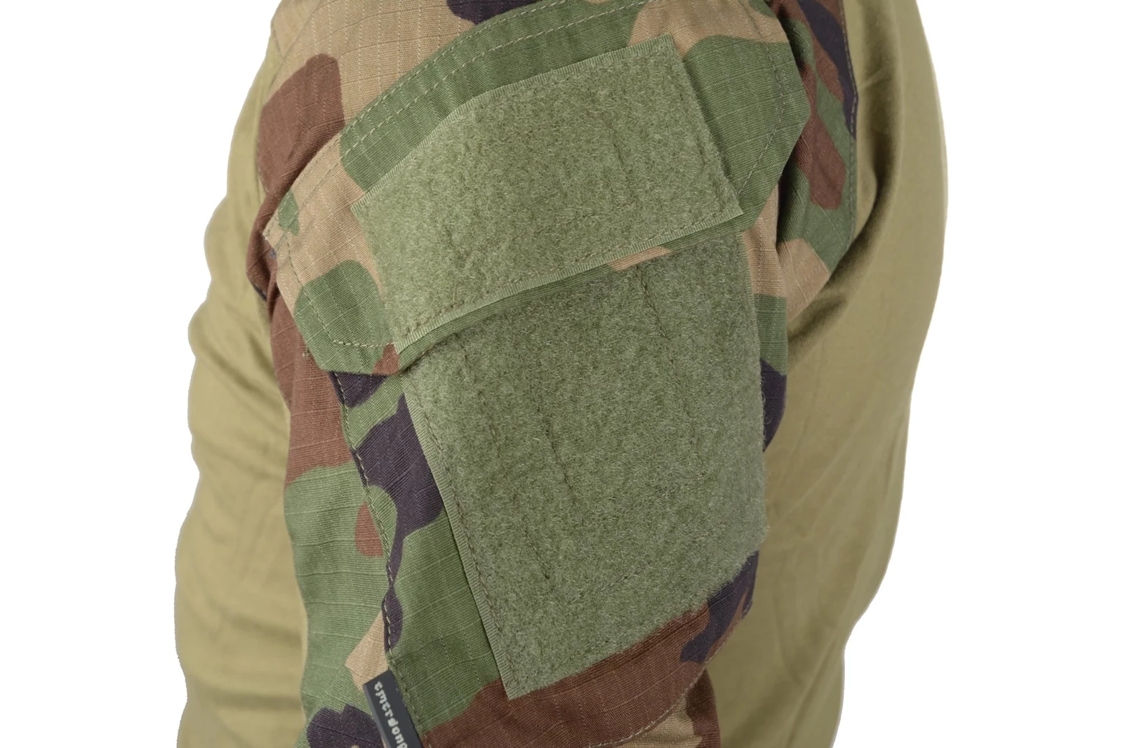 Bluza mundurowa typu combat shirt składa się w centralnej części z bawełny z domieszką materiału elastycznego. Ma to na celu zwiększenie komfortu oraz oddychalności podczas noszenia pod kamizelką taktyczną - np. typu plate carrier. Ramiona wraz z rękawami zostały natomiast uszyte z klasycznej tkaniny mundurowej NYCO o składzie 65/35. Zastosowanie wzmacniającego splotu rip-stop zwiększa wytrzymałość mechaniczną materiału i odporność na rozdarcia. Rękawy posiadają regulacje mankietów, kieszenie z taśmami na rzep oraz wbudowane nałokietniki. Kołnierz bluzy można postawić w stójkę i zapiąć przy pomocy zamka błyskawicznego.