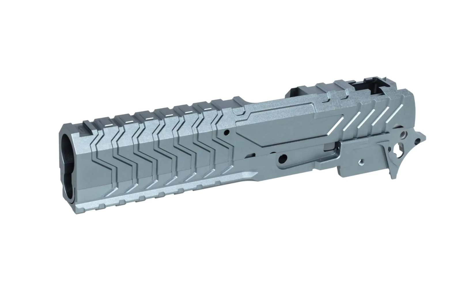 Model wykonany z aluminium (po procesie anodyzacji) przy pomocy narzędzi CNC, doskonale nada się jako upgrade pistoletów gazowych. Model cechuje się niewielką wagą a jednocześnie wytrzymałością, co przełoży się na lepsze osiągi replik. Szkielet został wyposażony w dolną szynę, która umożliwi mocowanie dodatkowych akcesoriów takich jak latarka czy laser. Zamek posiada nacięcia, umożliwiające sprawniejsze przeładowanie oraz nadające całości agresywnego charakteru.