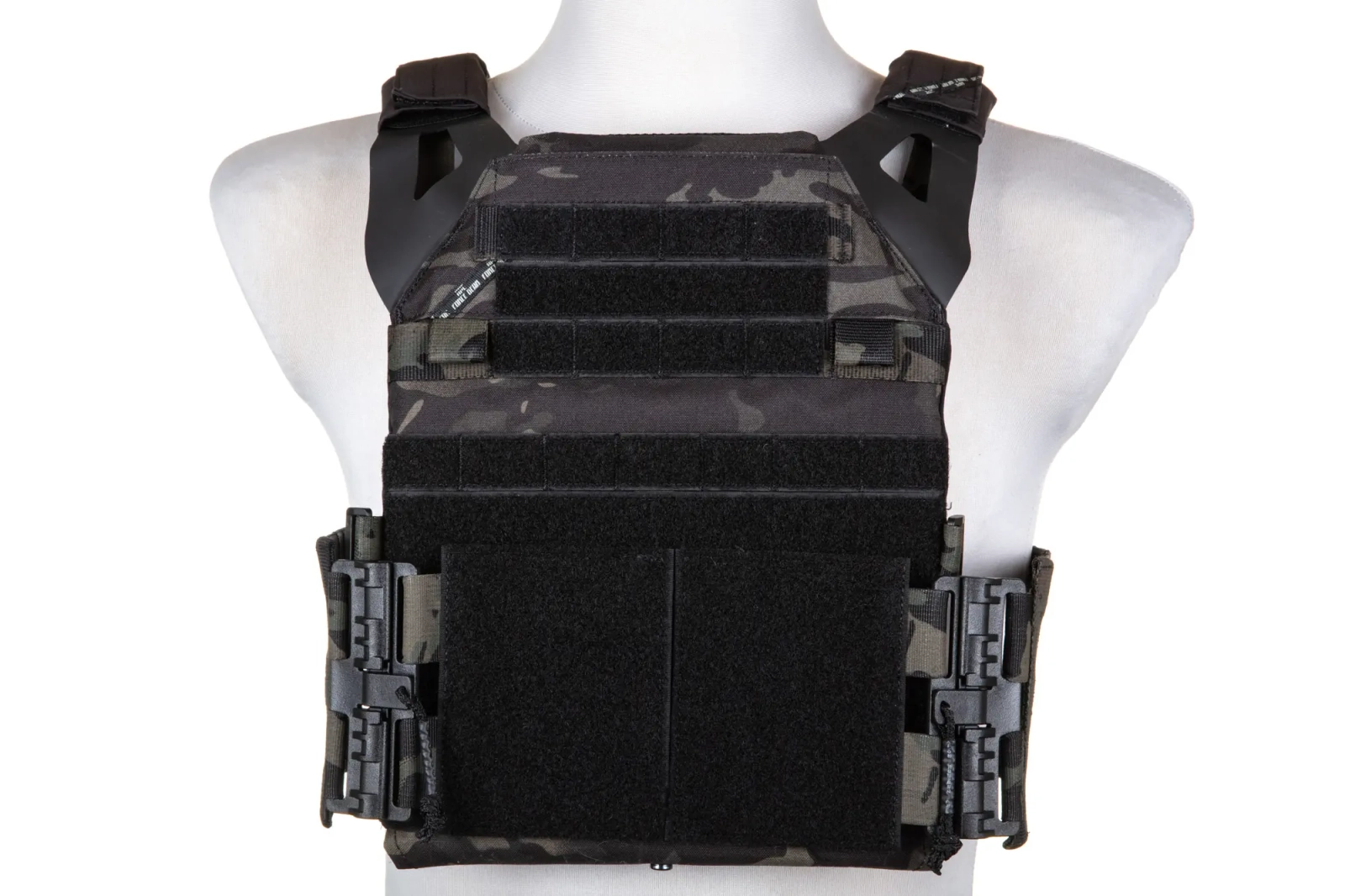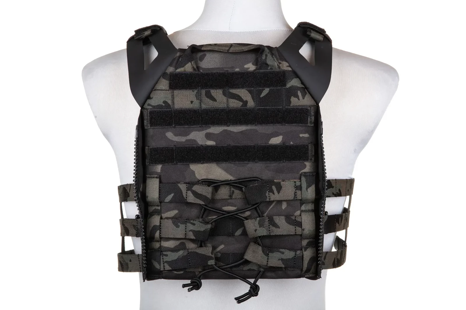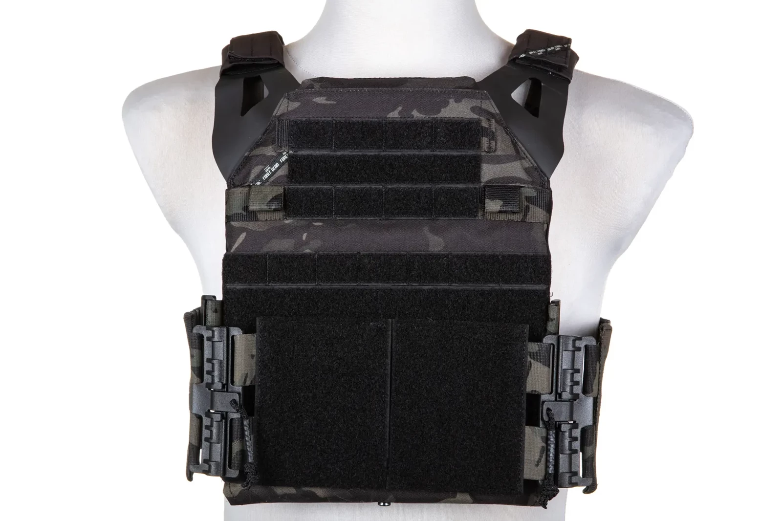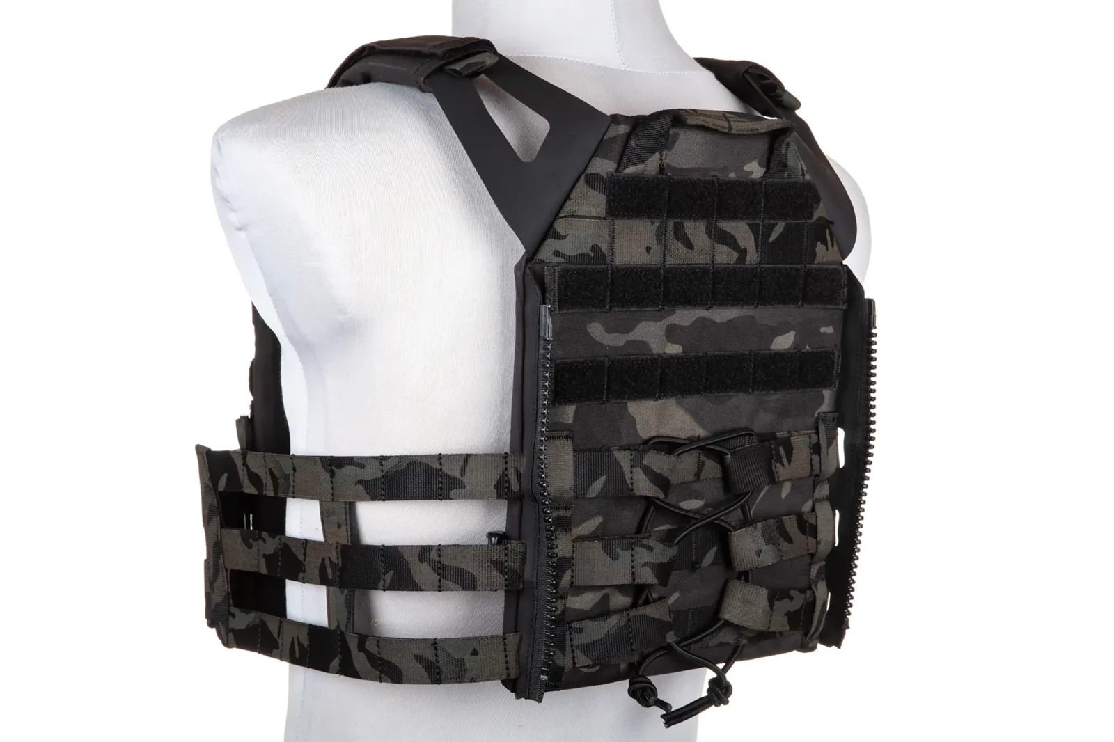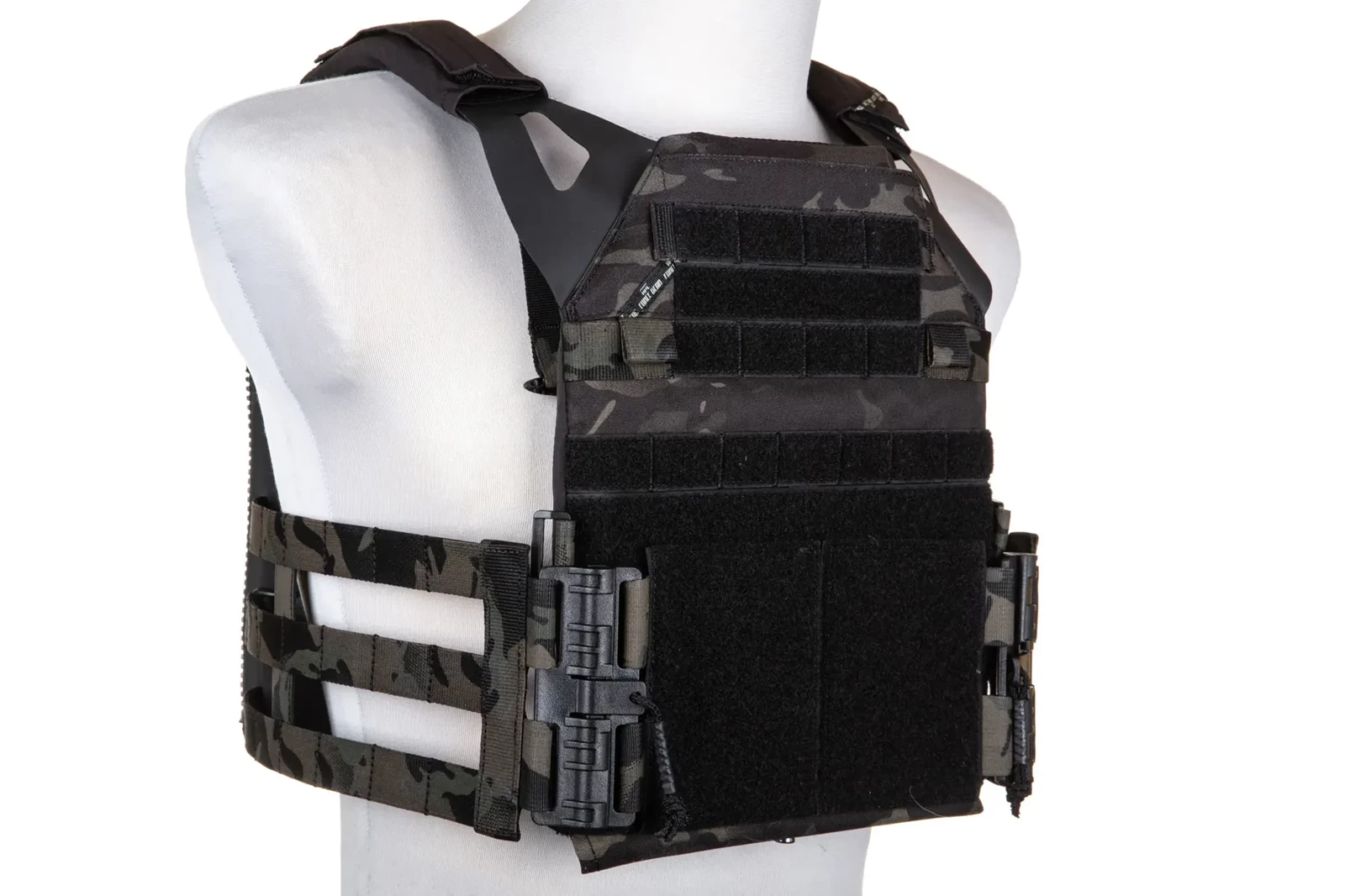 Bardzo lekka i funkcjonalna kamizelka typu plate carrier, uszyta z wytrzymałego nylonu 500D. Zbudowana z dwóch paneli - przedniego oraz tylnego, połączonych klamrami QD z lekkim, szkieletowym cummerbundem, który składa się jedynie z usztywnionych taśm. Nie ma problemu aby na tych taśmach zamocować dodatkowe kieszenie modułowe.