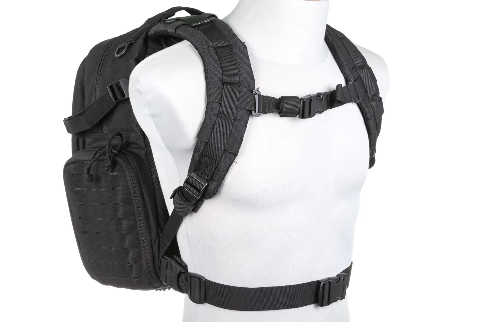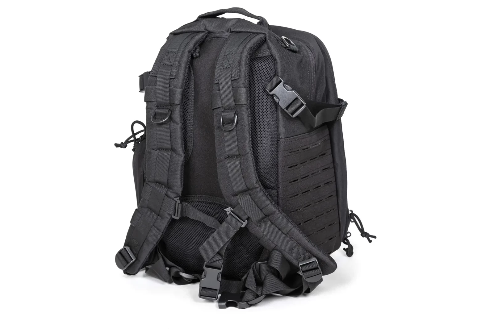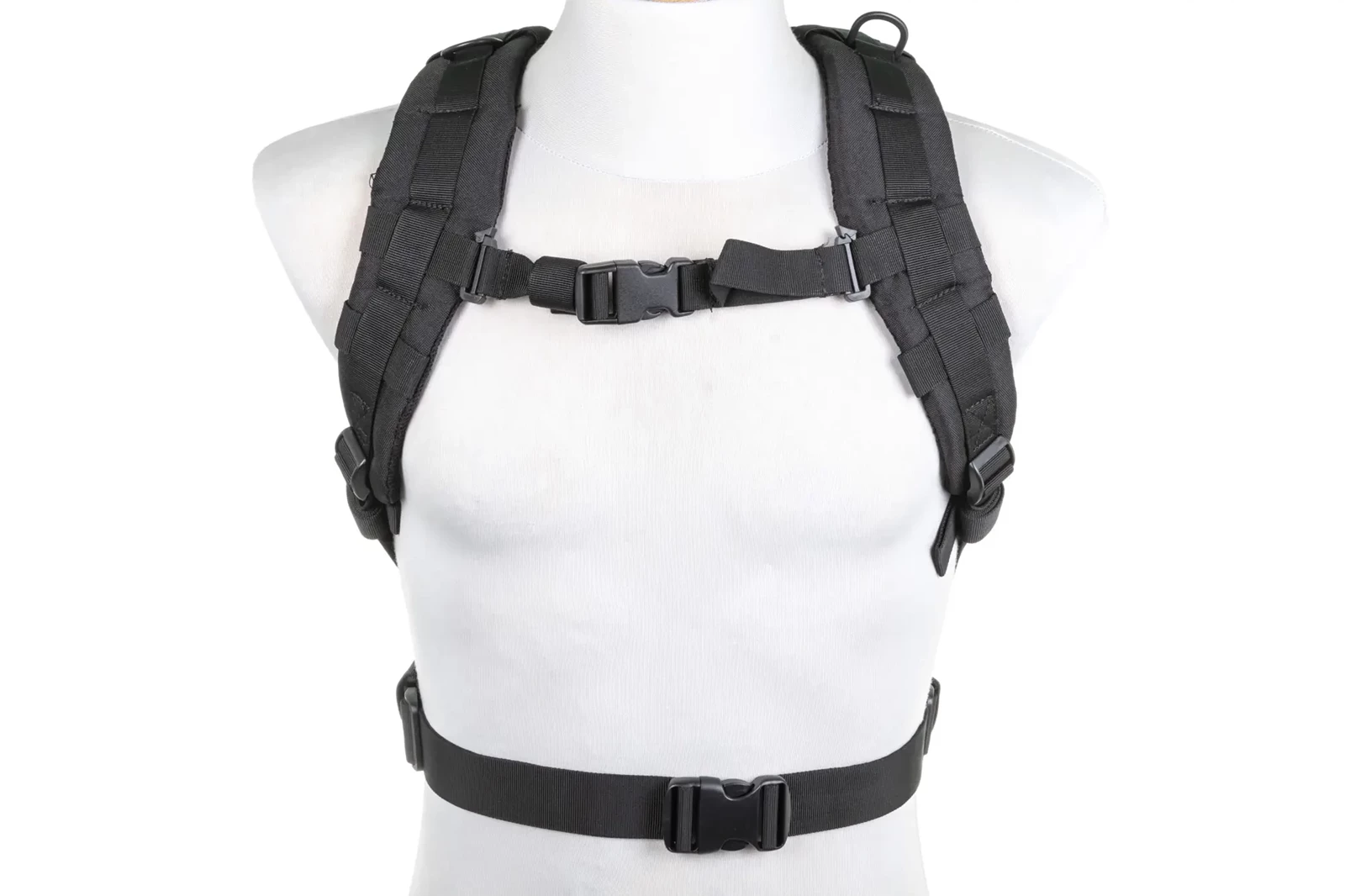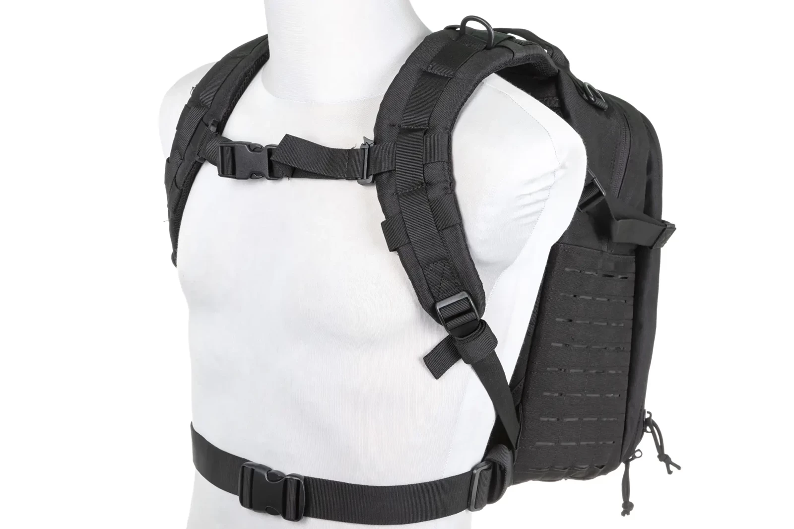 Boki plecaka są kompatybilne z systemem MOLLE dzięki wycięciom Laser-Cut (front i boki modelu). Za sprawny transport będą odpowiadać: chwyt transportowy oraz regulowane szelki wyposażone w pas biodrowy i piersiowy.