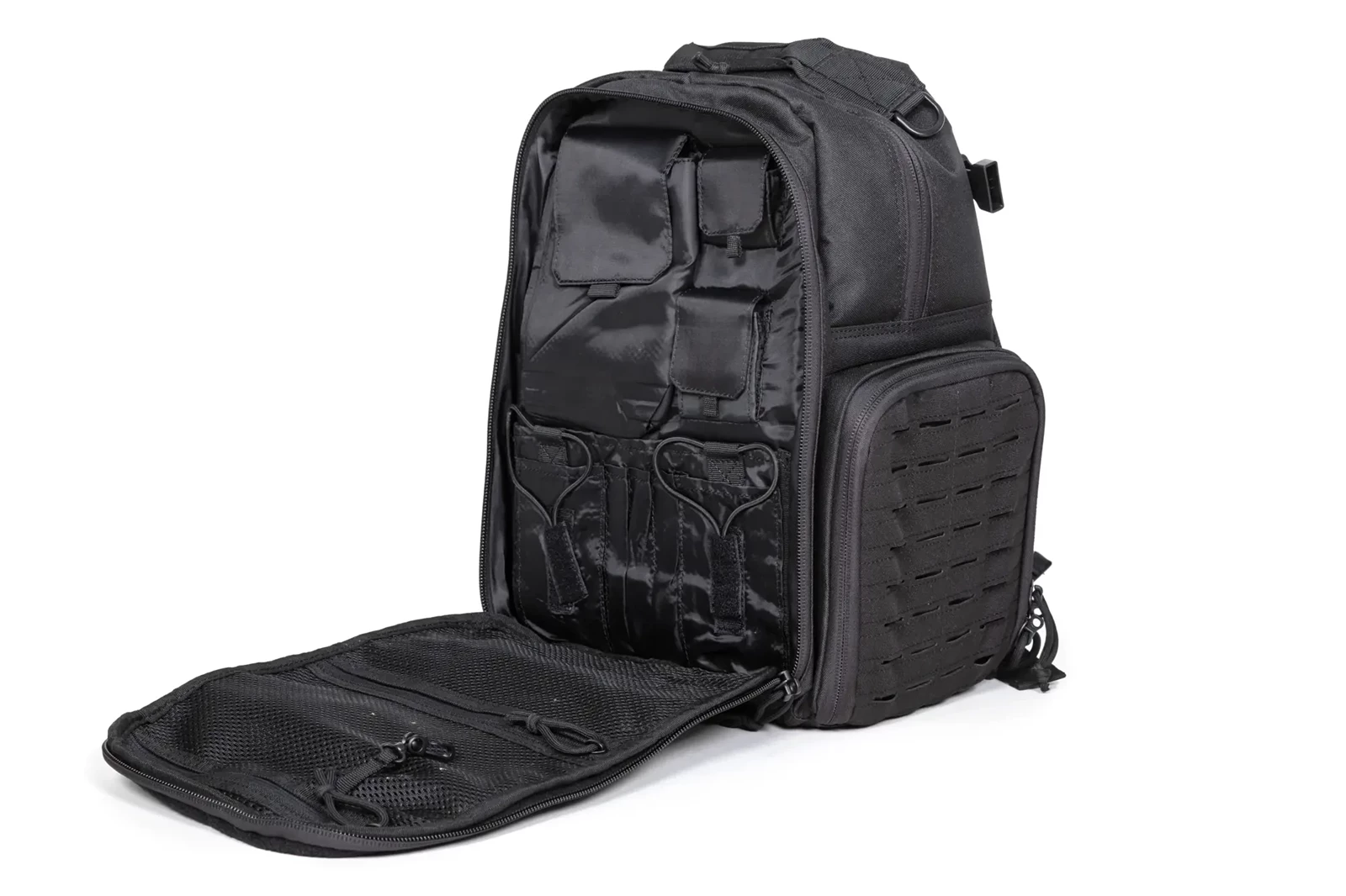 Model Mobile Arsenal Compact Protective Backpack to uniwersalny, rozbudowany plecak, który pozwoli zabrać na strzelnicę wszelkie niezbędne przedmioty. Oprócz 3 sztuk etui na pistolety, model cechuje się szerokim wachlarzem możliwości, które umożliwią transportowanie dodatkowej amunicji, słuchawek, apteczki, markerów itp. Łatwy dostęp do wnętrza oraz pogrubione ścianki chroniące broń to jedne z wielu zalet plecaka, który zapewni jednocześnie komfort użytkowy podczas przemieszczania się oraz bezpieczeństwo, dzięki możliwości dodatkowego zamknięcia przy pomocy kłódek (kłódki należy zakupić osobno).