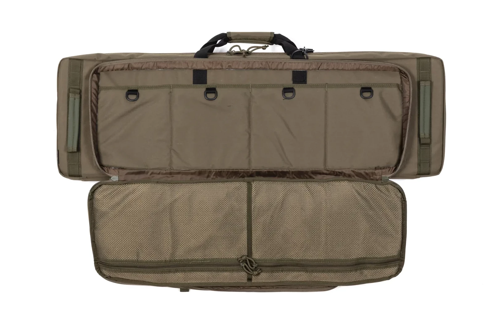 Najważniejszą cechą modelu jest główna komora podzielona na dwie przegrody, które umożliwią transport dwóch sztuk broni długiej o długości max. 106 cm. Obie przegrody posiadają taśmy, które ustabilizują transportowane karabinki. Główna komora zamykana jest na dwubiegunowe zamki błyskawiczne z opcją dodatkowego zabezpieczenia przy pomocy kłódki (kłódki należy zakupić osobno). Co ważne - zamki błyskawiczne otwierają się na całej długości pokrowca, więc po otwarciu, pokrowiec jest płaski, dając swobodny dostęp do wnętrza.