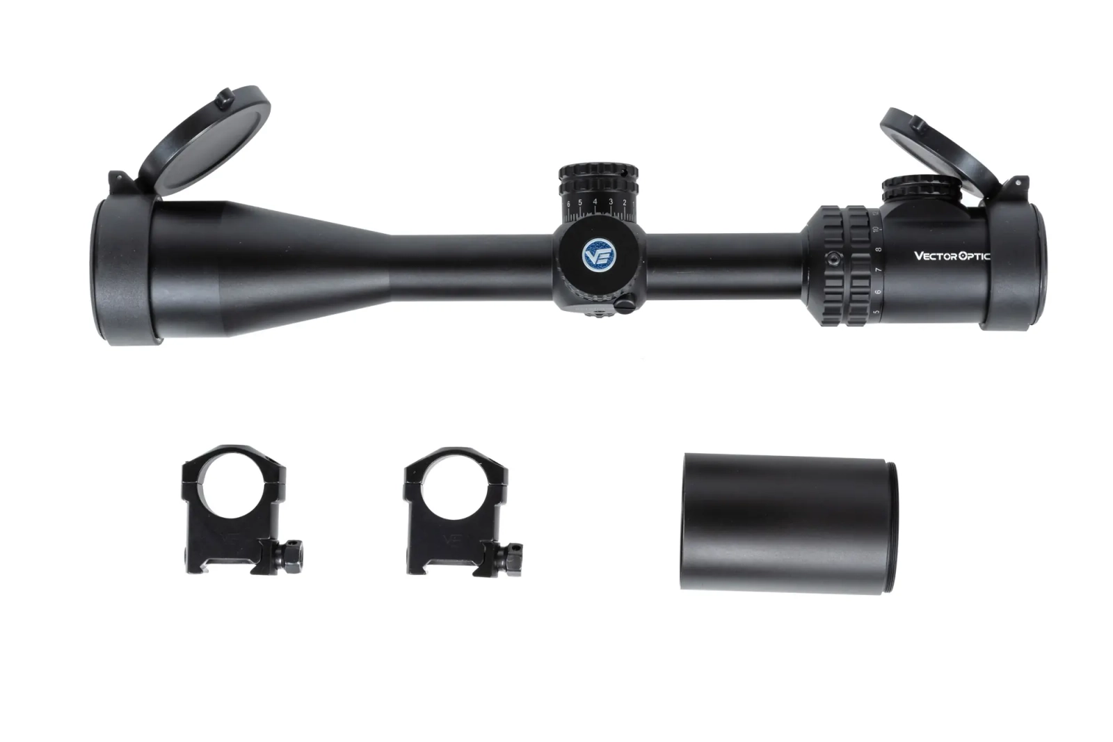 Luneta Hugo od firmy Vector Optics o powiększeniu x4-16 została wykonana z wytrzymałego aluminium 6061 T6. Jest wodoodporna na poziomie IPX4 oraz odporna na wstrząsy (750G). Zasilana jest baterią CR2032. Model wyposażony jest w tubus o średnicy 1 cala, (2.54 mm) oraz siatkę celowniczą VOI-10BDC