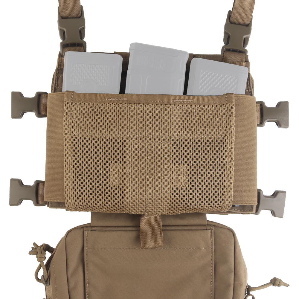 Kamizelka posiada również dodatkowy panel, który umożliwi transport kolejnych 3 magazynków oraz płytę typu SAPI w rozmiarze M. (PŁYTĘ NALEŻY ZAKUPIĆ OSOBNO)