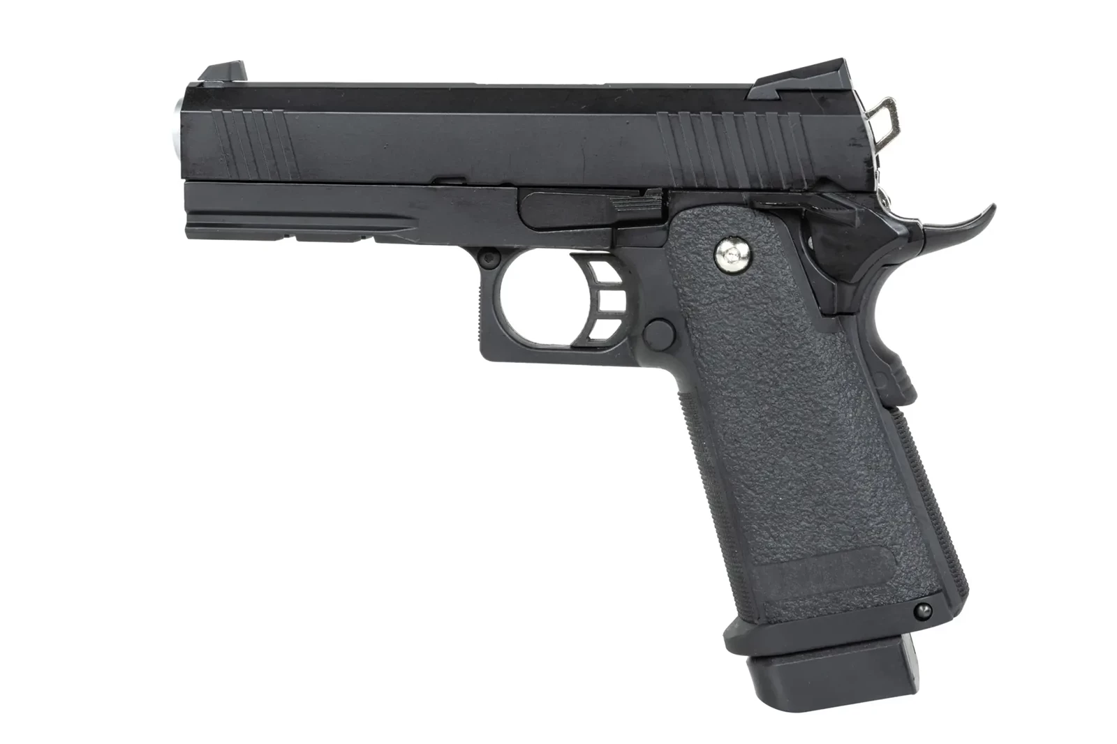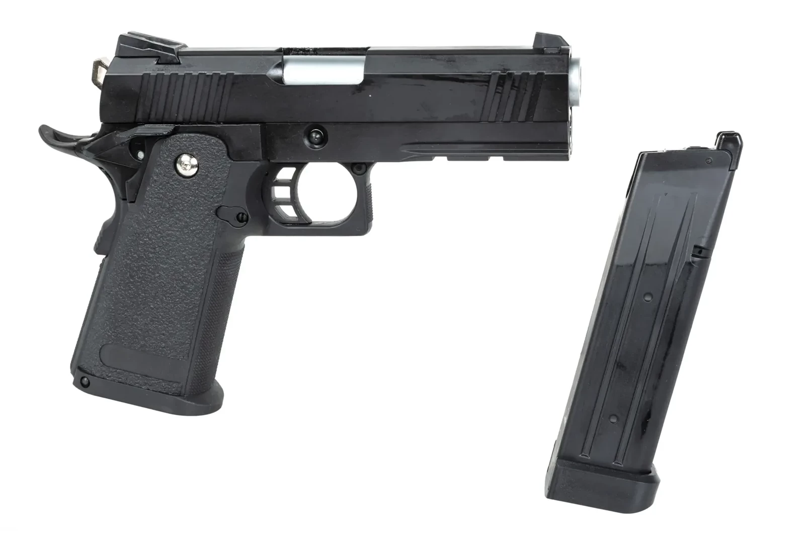 Pistolet ASG zasilany przy pomocy green gasu, został wykonany z metalu oraz tworzywa sztucznego. Metalowy zamek posiada chropowatą powierzchnie, która ułatwi przeładowanie modelu bez względu na warunki.