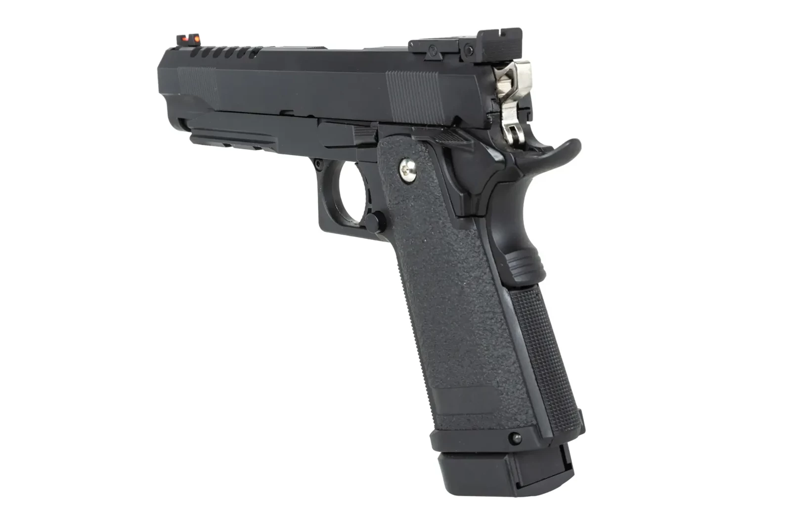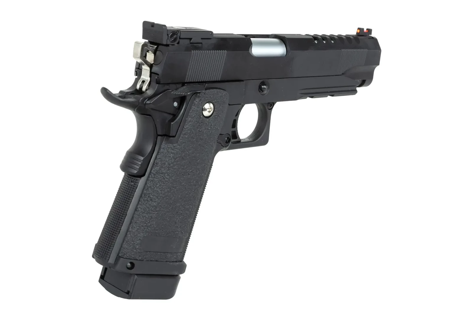 Pistolet ASG zasilany przy pomocy green gasu, został wykonany z metalu oraz tworzywa sztucznego. Metalowy zamek posiada nacięcia na grzbiecie, które dodają całości charakteru i ciekawego wyglądu (jednocześnie powodując, że zamek jest nieco lżejszy). Replika posiada chropowatą powierzchnie na zamku - ułatwi to przeładowanie w każdych warunkach. Szczerbinka w modelu posiada prostą, aczkolwiek skuteczną regulację góra-dół.