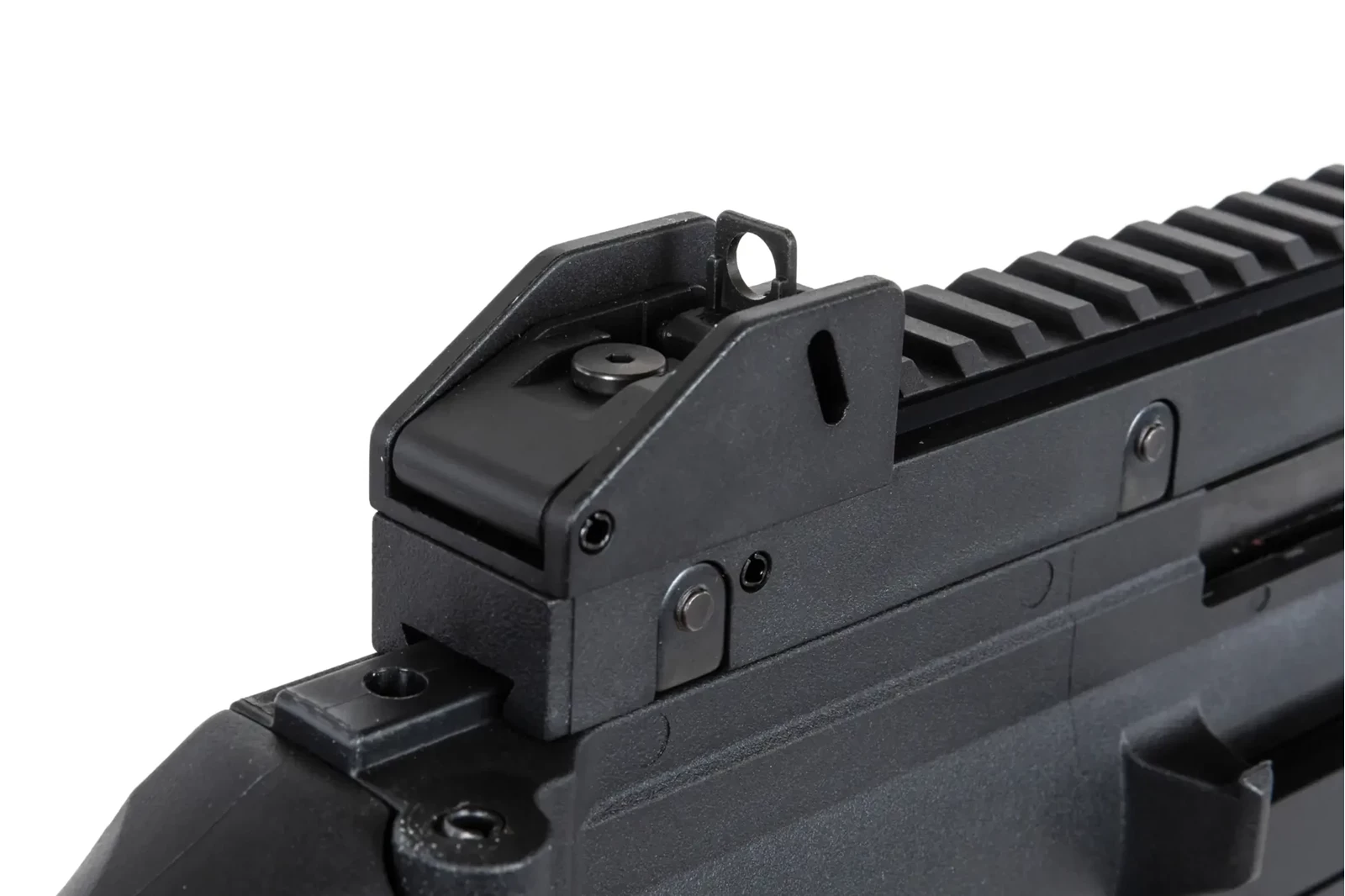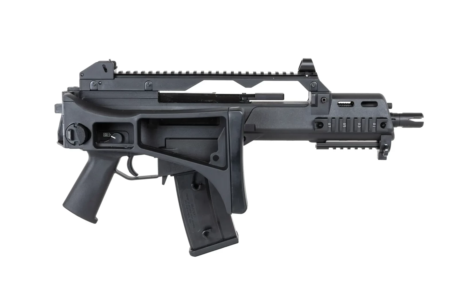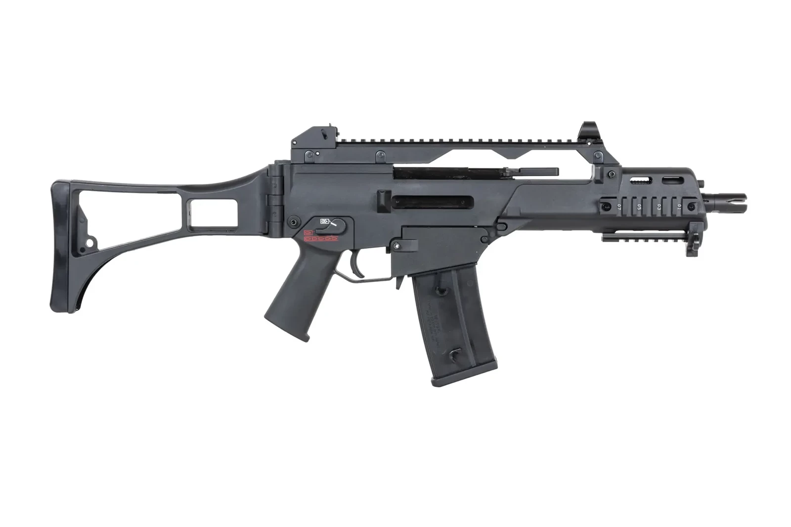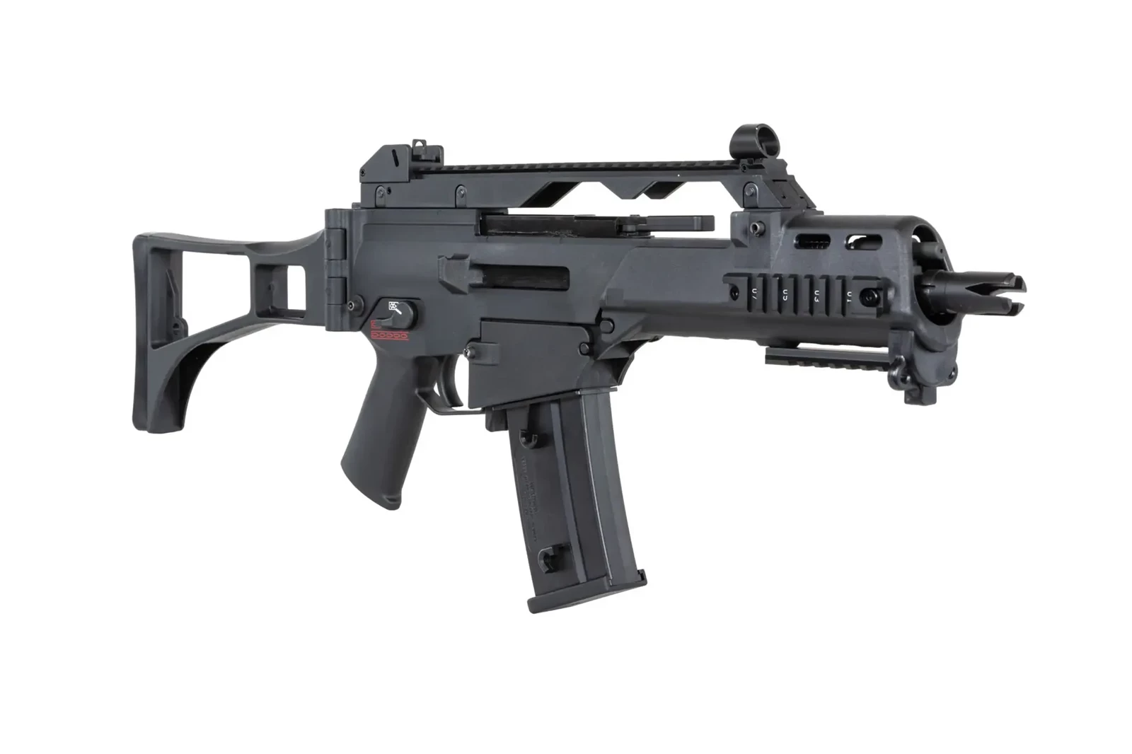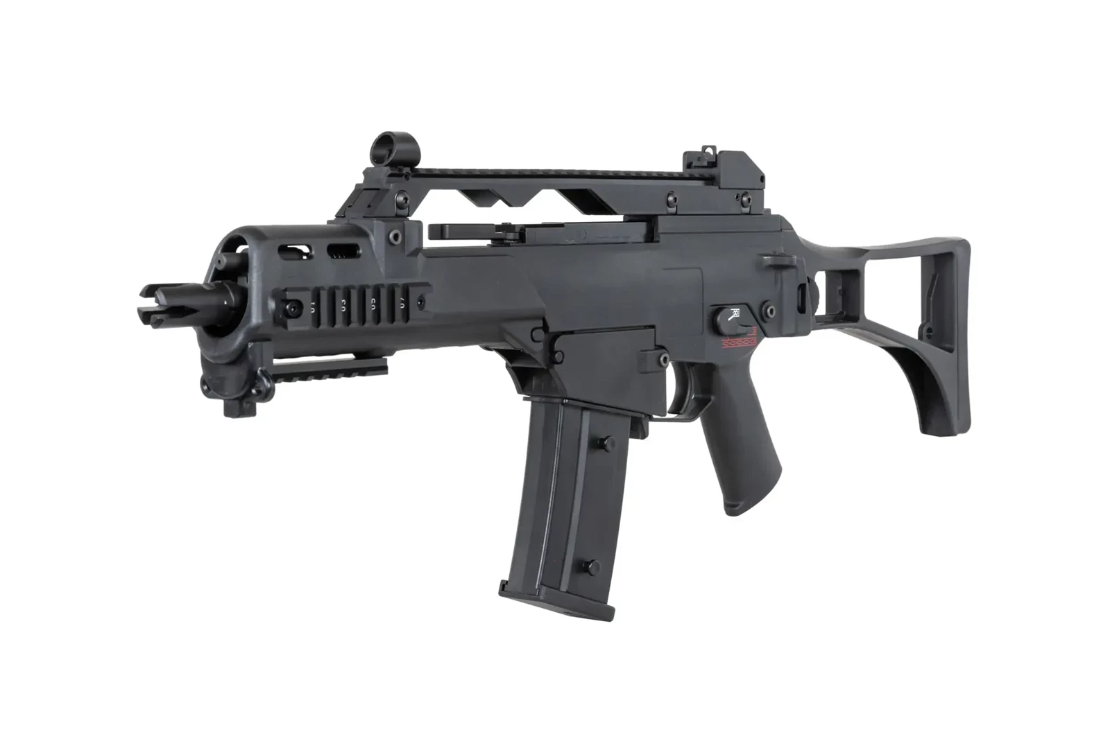 Karabinek ASG SRC DUAL POWER SR36C GB-306 wzorowany na słynnej konstrukcji posiada szynę grzbietową RIS, która umożliwi montaż np. optyki, ale jednocześnie 3 dodatkowe szyny RIS na łożu, które pozwolą na montaż chwytu pionowego, lasera, latarki itp. Replika posiada składaną na bok kolbę - jest to o tyle istotne, iż pozwoli to na skrócenie karabinka podczas np. transportu - oraz obustronne: dźwignie przeładowania oraz selektor ognia.