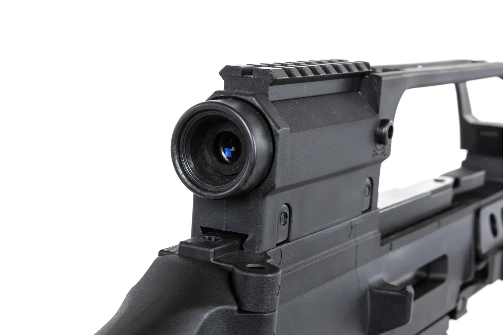 Karabinek ASG od firmy SRC Dual Power SR36 KSK GB-303 został wyposażony w lunetę zintegrowaną z chwytem transportowym.