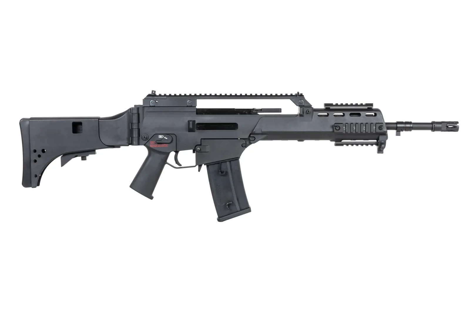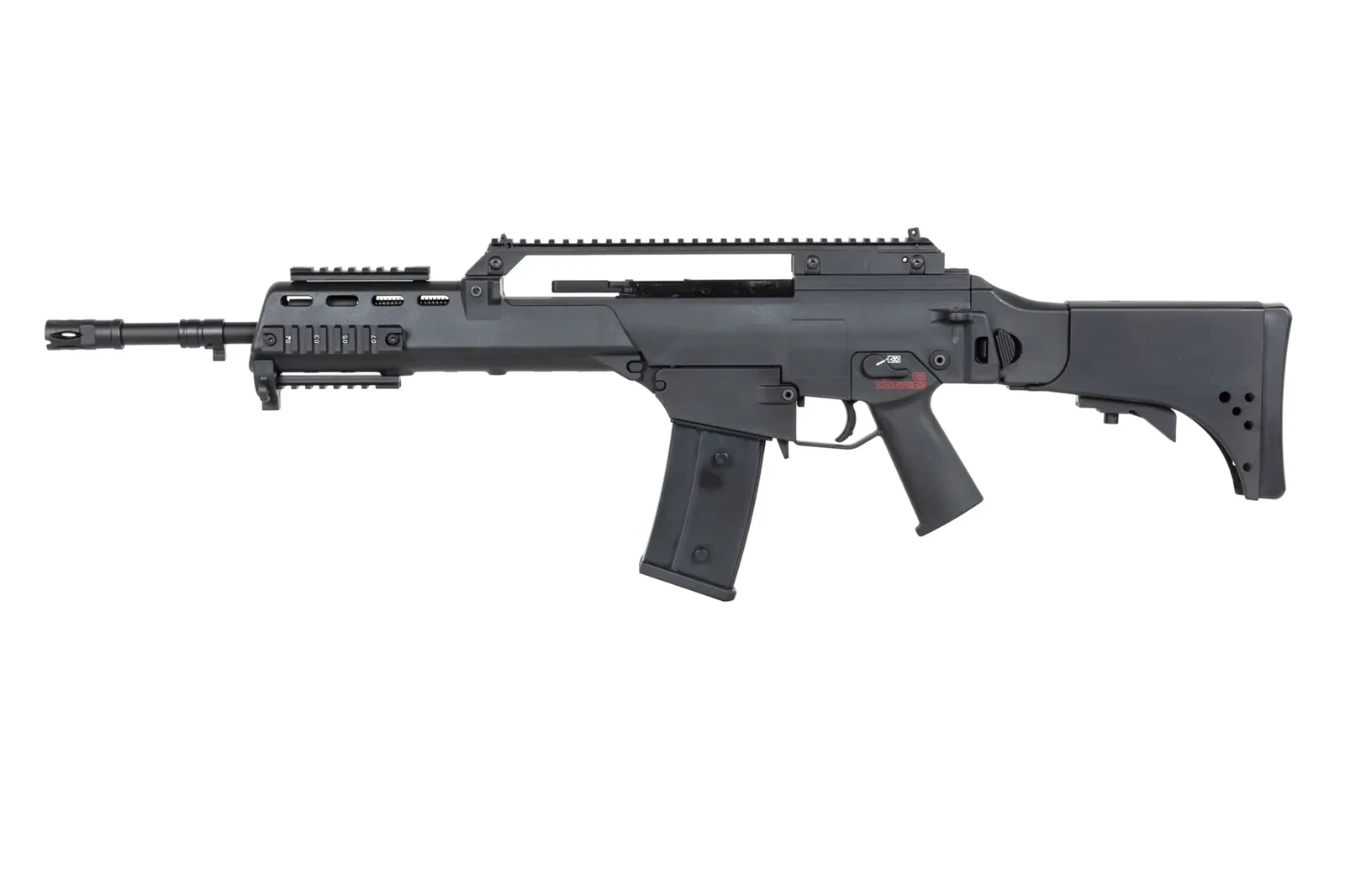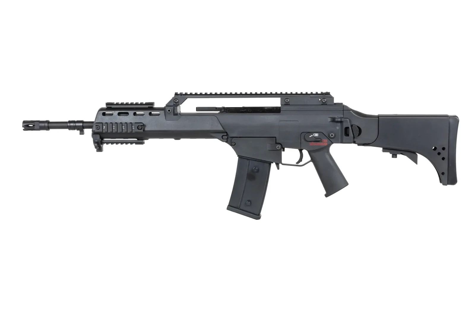 Karabinek ASG SRC DUAL POWER SR36KV GB-305 wzorowany na słynnej konstrukcji posiada szynę grzbietową RIS, która umożliwi montaż np. optyki, ale jednocześnie 4 dodatkowe szyny RIS na łożu, które pozwolą na zamocowanie lasera, latarki, chwytu pionowego itp.