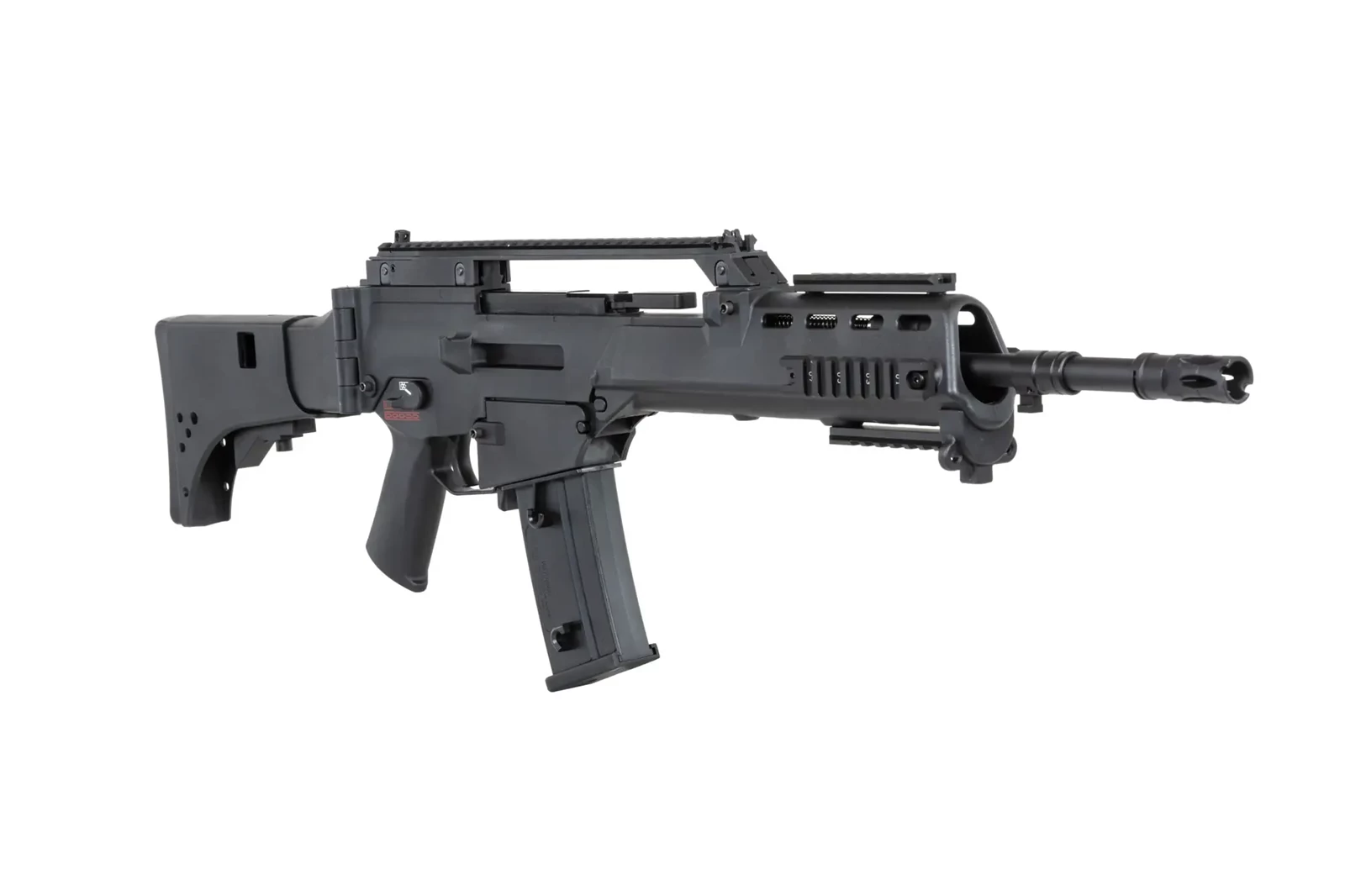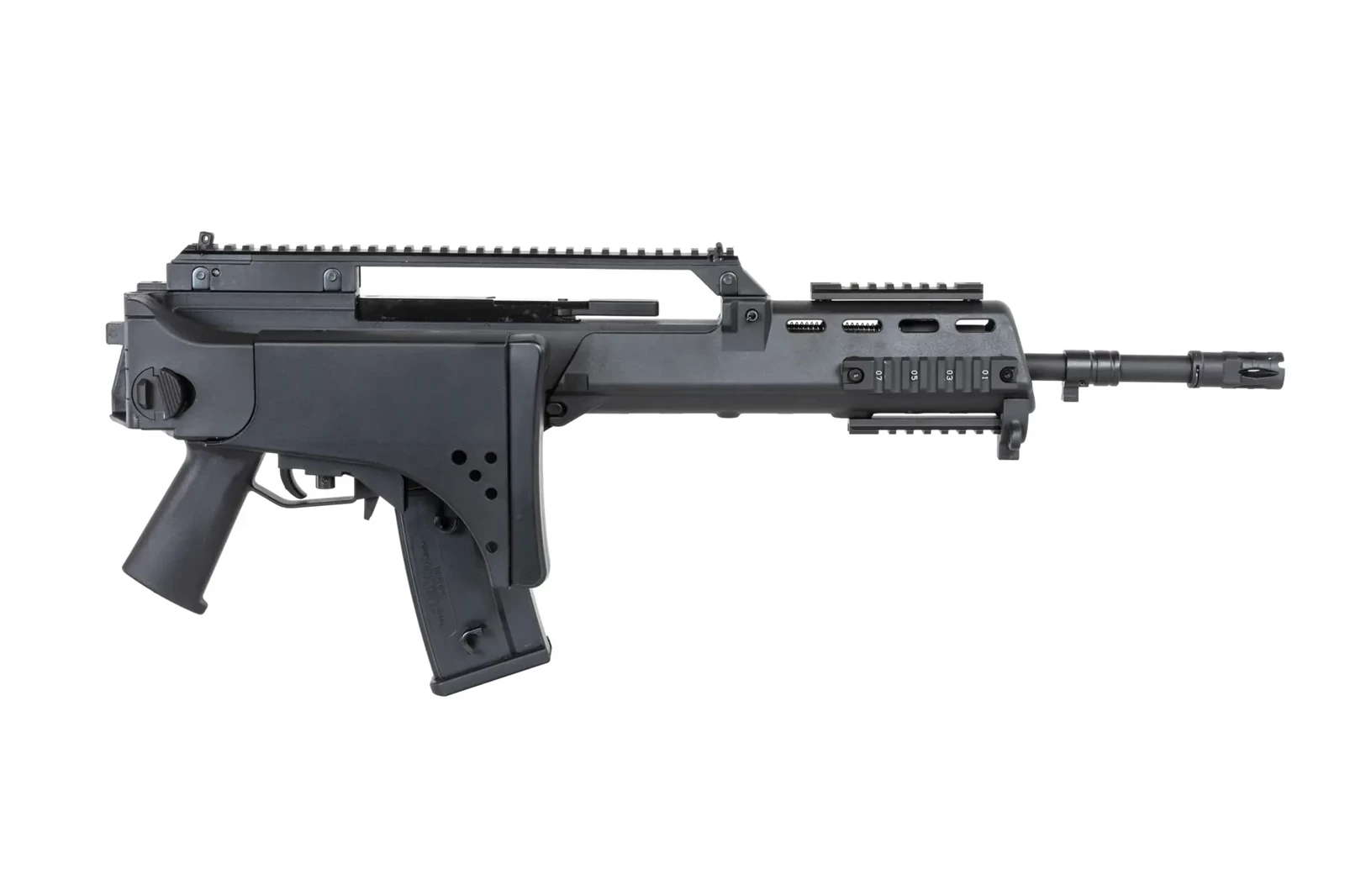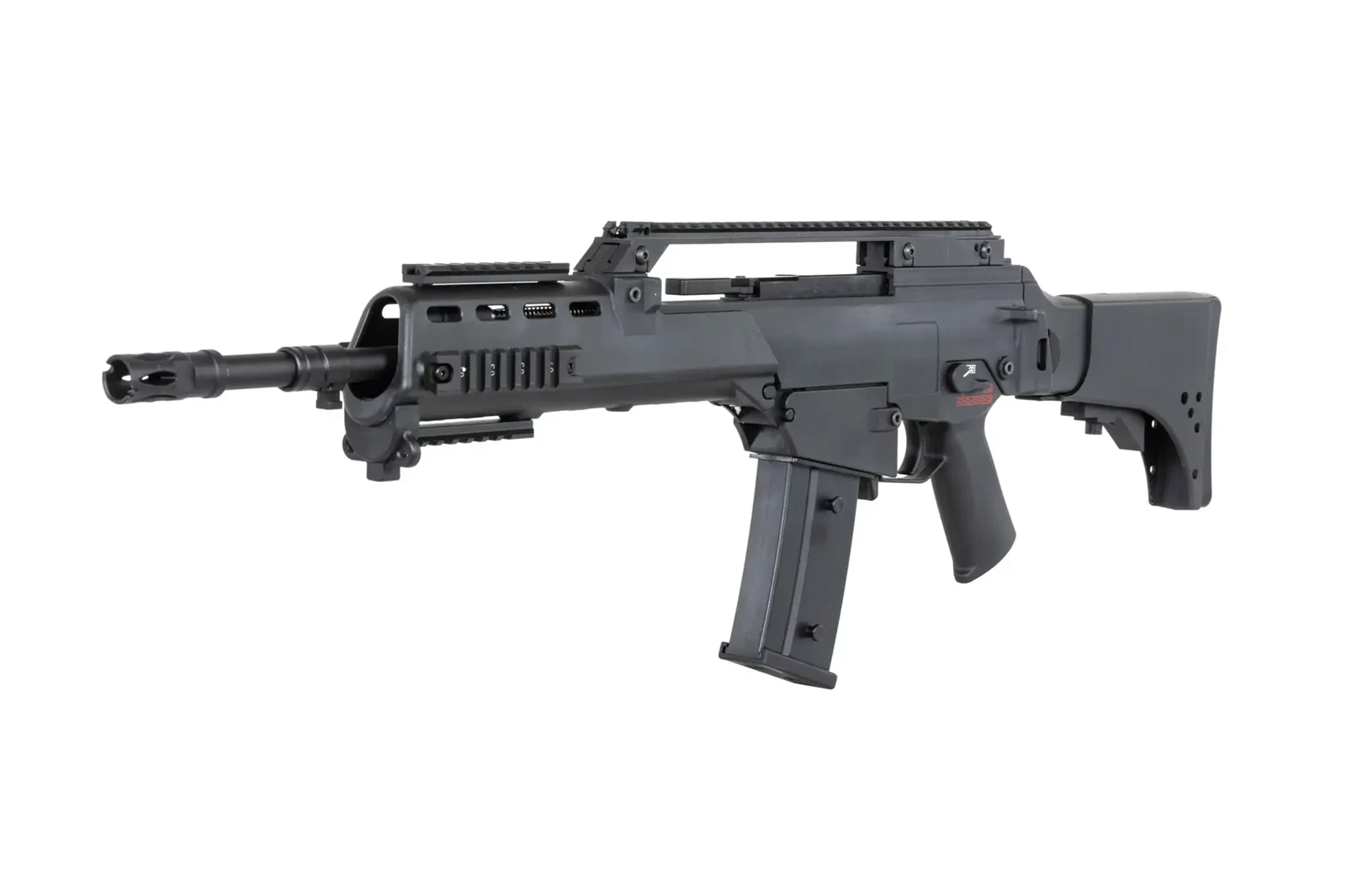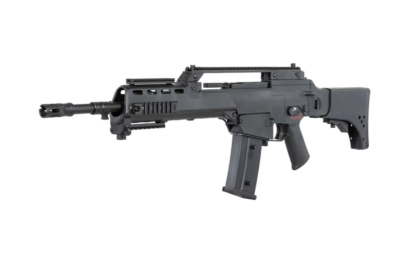 Karabinek ASG SRC DUAL POWER SR36KV GB-305 wzorowany na słynnej konstrukcji posiada szynę grzbietową RIS, która umożliwi montaż np. optyki, ale jednocześnie 4 dodatkowe szyny RIS na łożu, które pozwolą na zamocowanie lasera, latarki, chwytu pionowego itp.