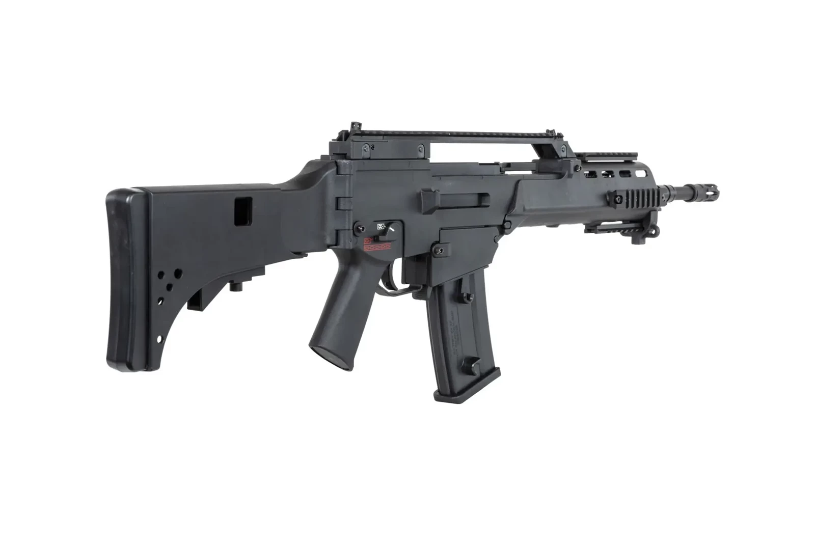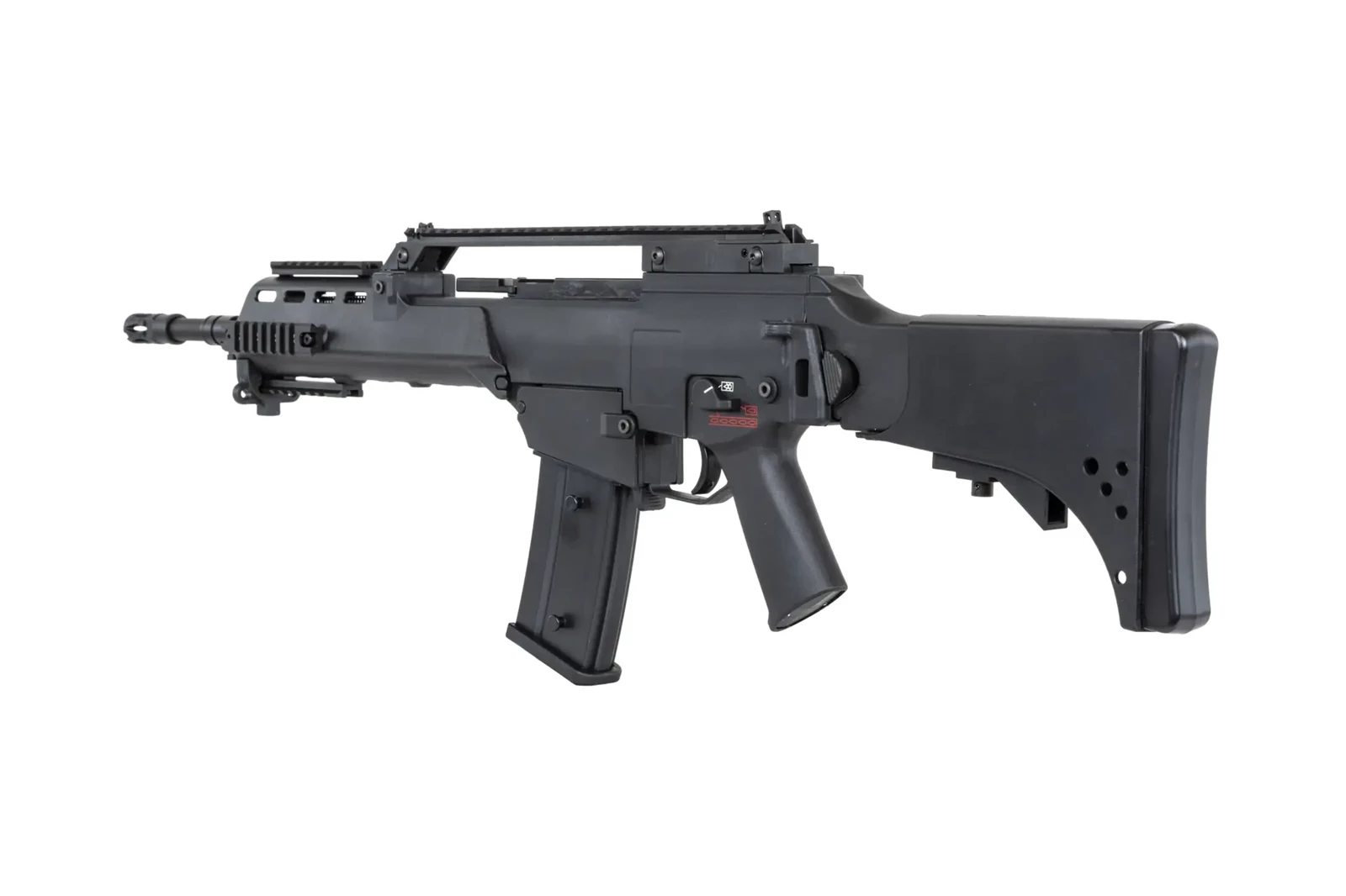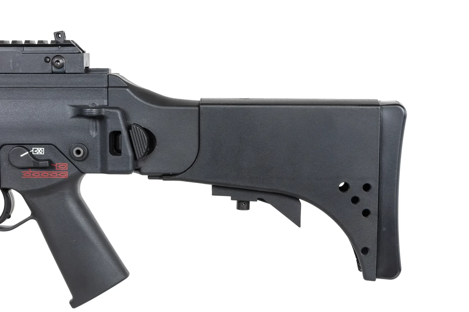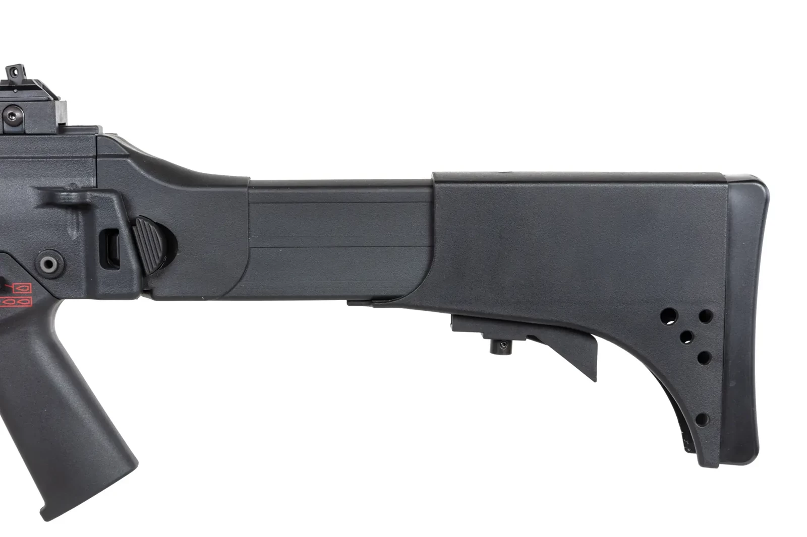 Replika posiada regulowaną kolbę teleskopową, która może być zablokowana w 4 pozycjach a jednocześnie złożona na bok, obustronną dźwignię przeładowania oraz obustronny selektor ognia.