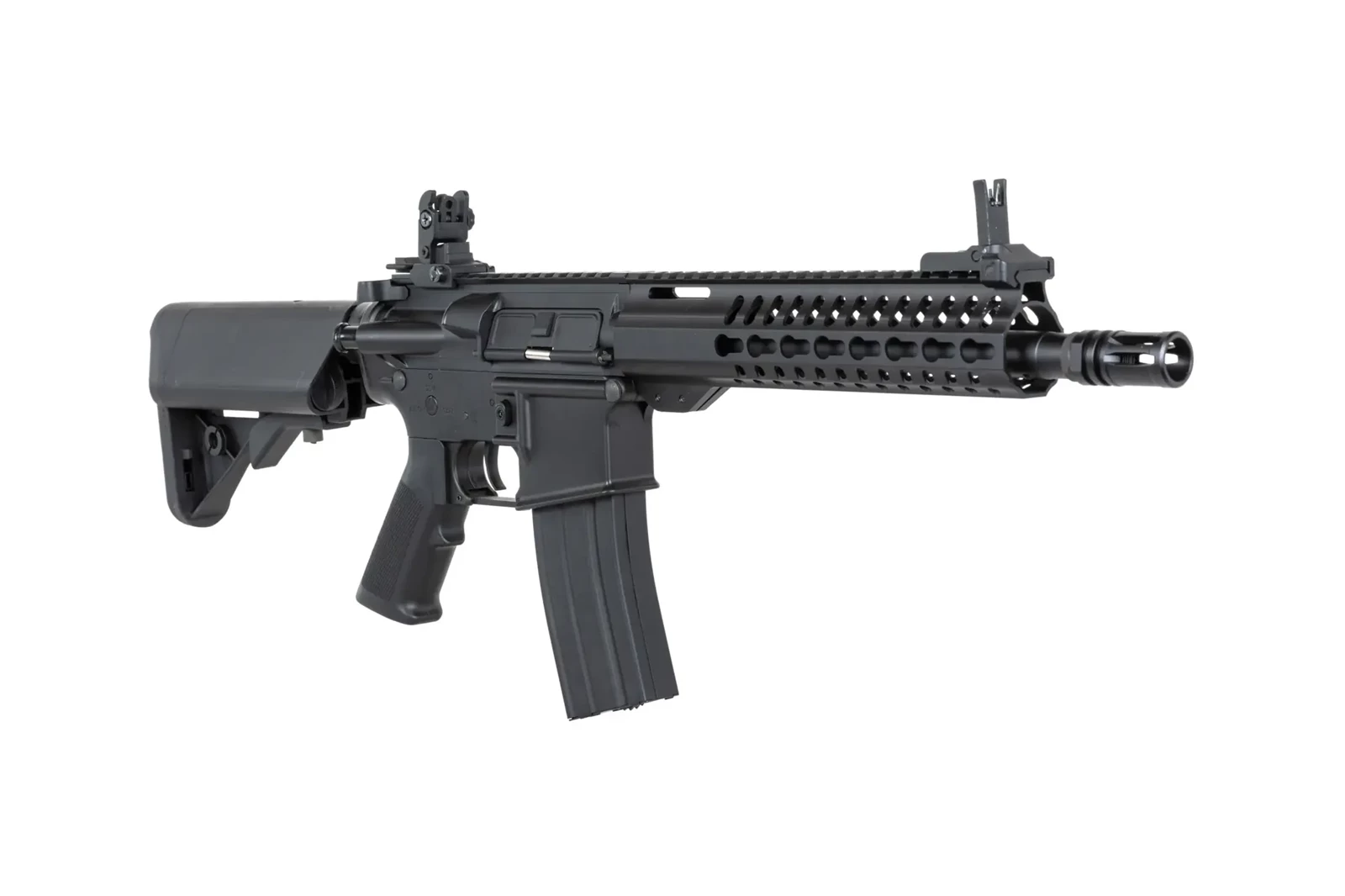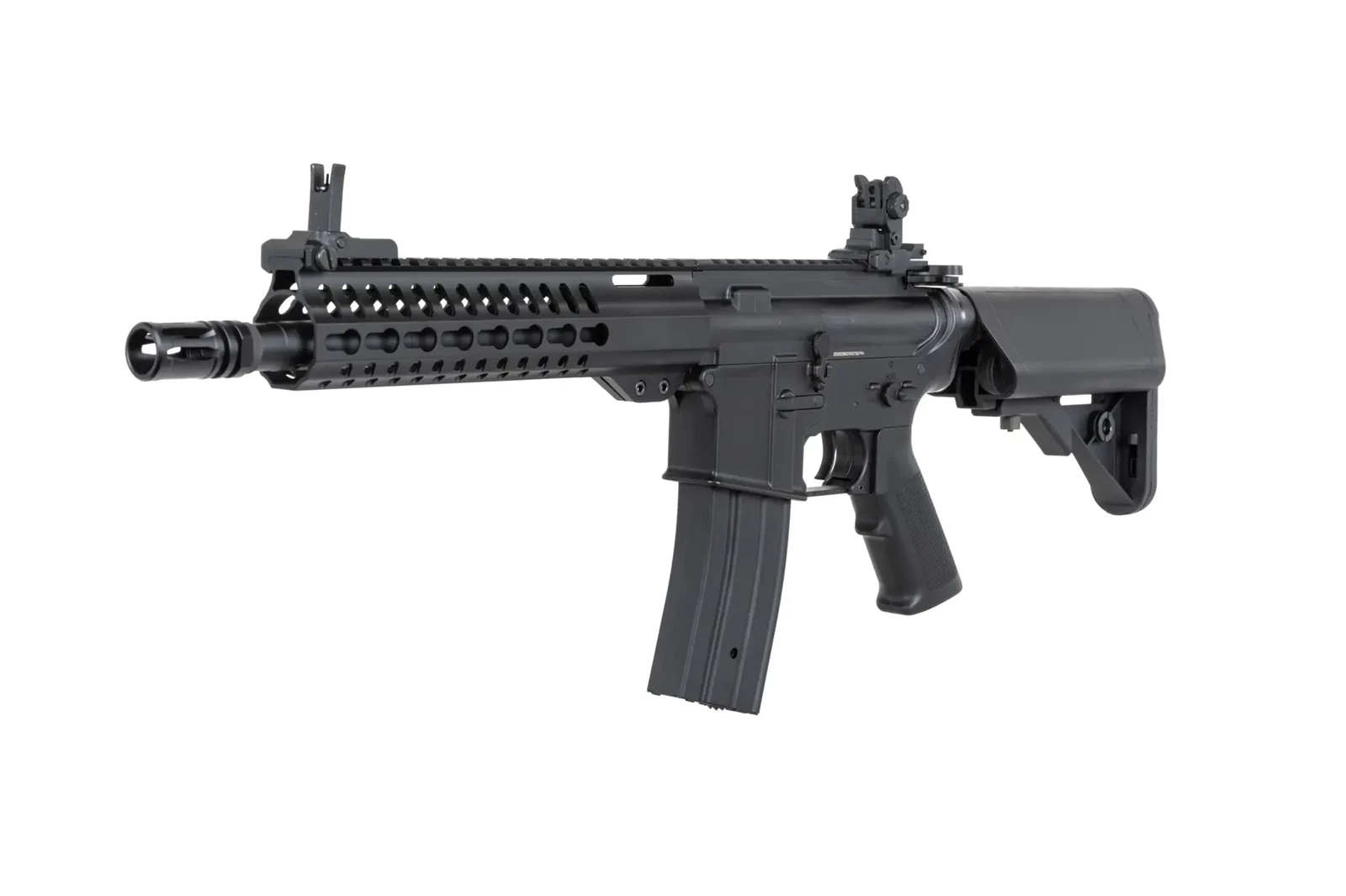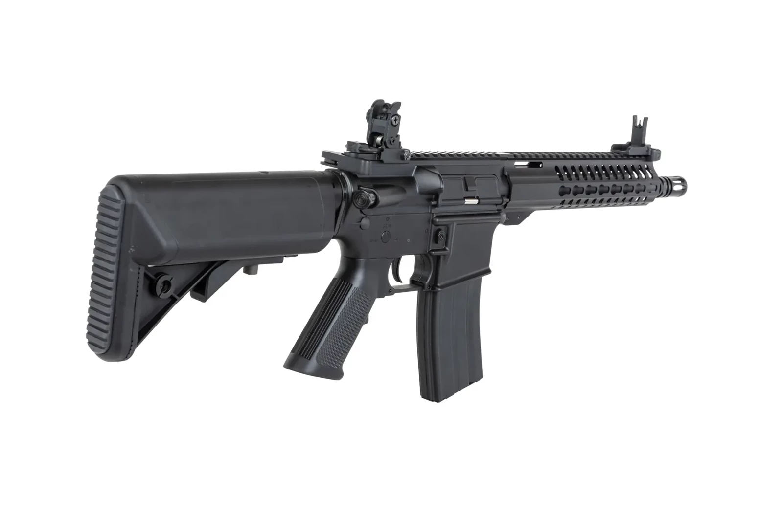 Karabinek ASG od firmy Golden Eagle został wykonany przy wykorzystaniu przede wszystkim polimeru oraz metalu. Replika posiada polimerowy korpus, chwyt pistoletowy oraz regulowaną kolbę typu SF. Z metalu wykonano lufę zewnętrzną, tłumik płomienia, łoże KeyMod o długości 9 cali, magazynek typu Hi-Cap, prowadnice kolby, wszystkie piny oraz śruby. Dodatkowo replika została wyposażona w szyny RIS/Picatinny, które umożliwią montaż dodatkowych akcesoriów.