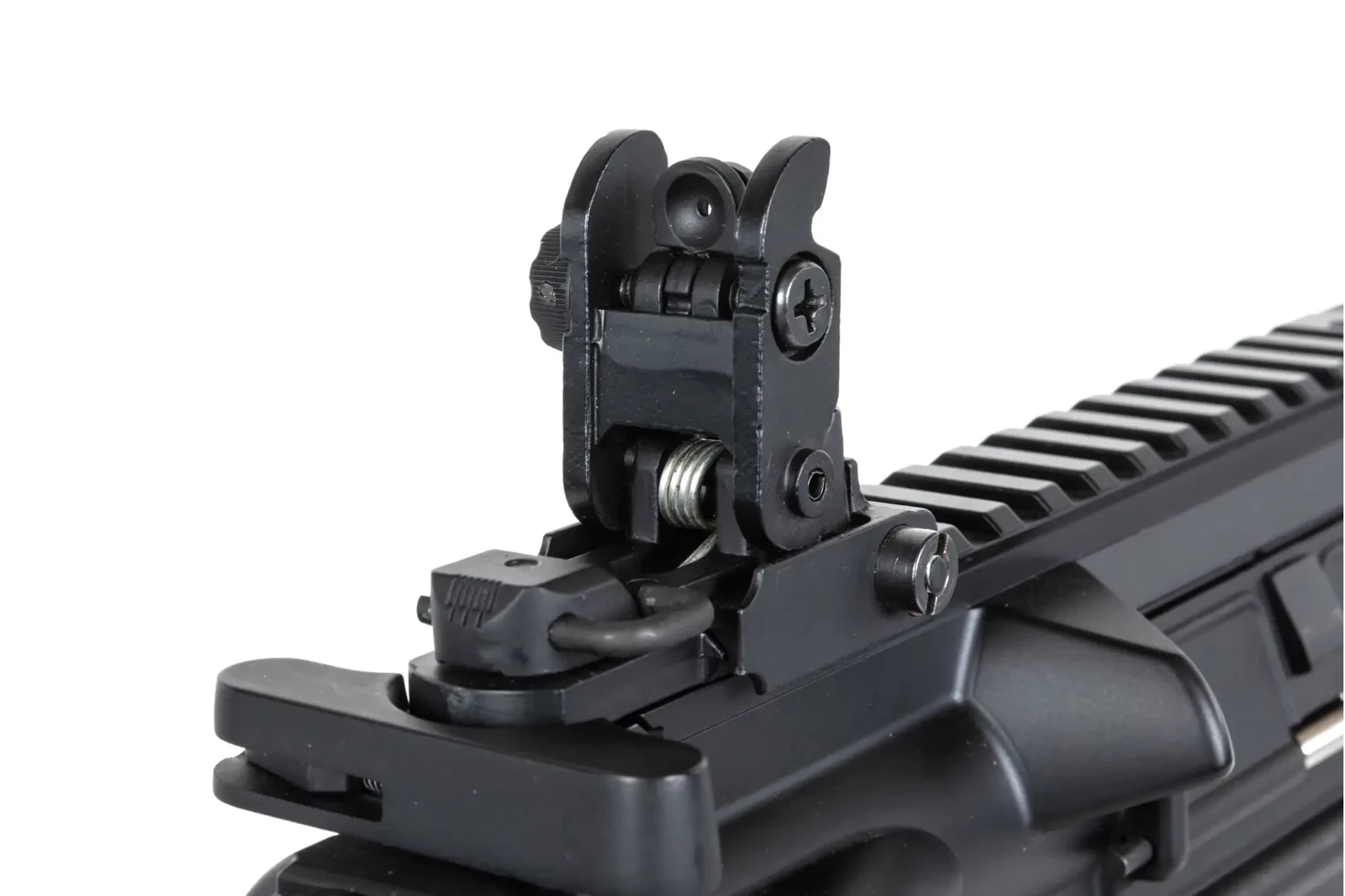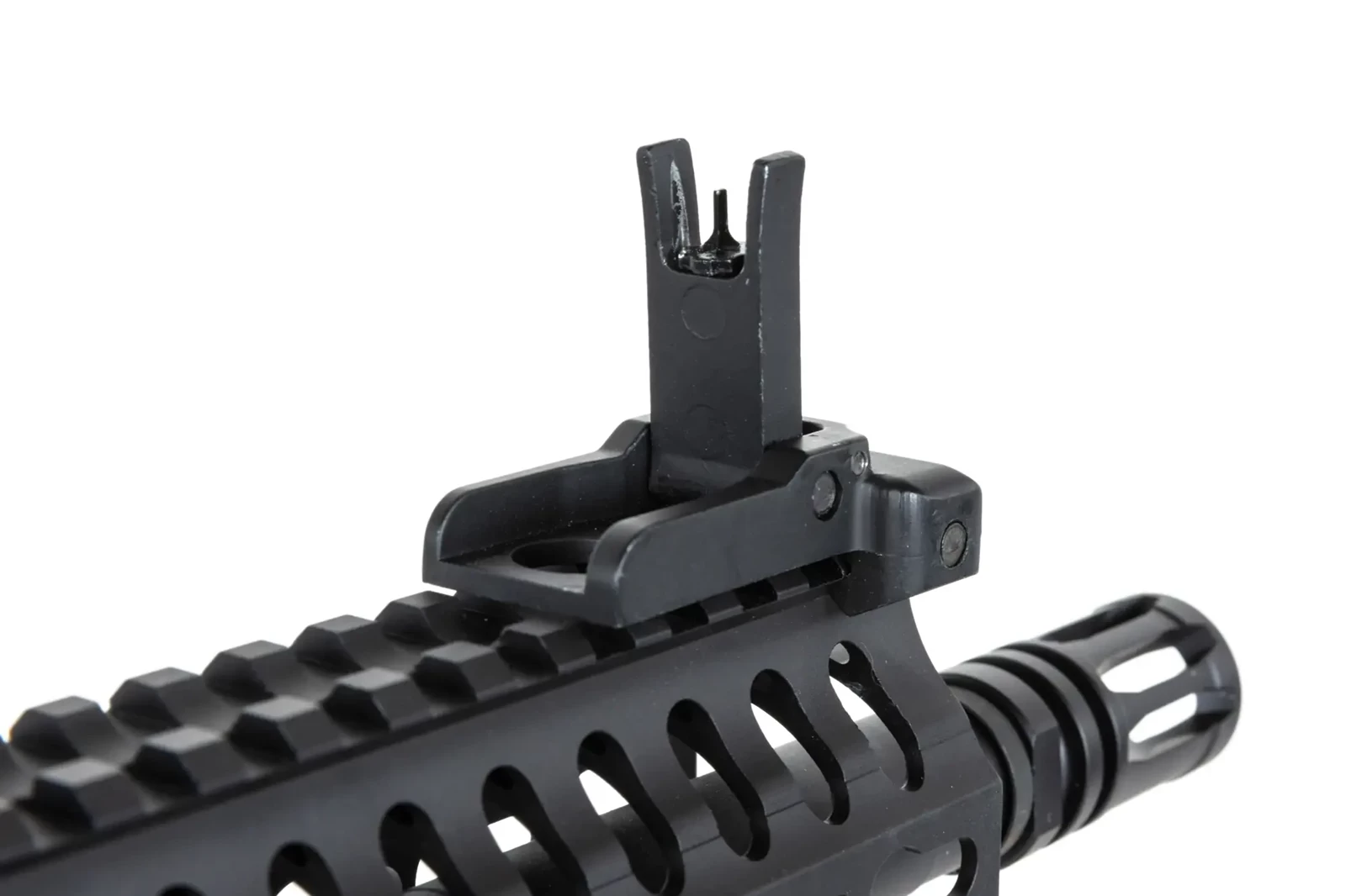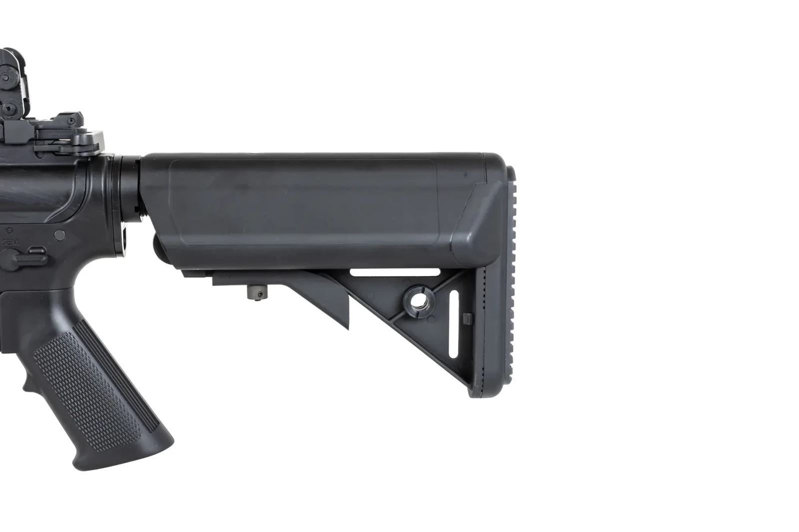Karabinek ASG od firmy Golden Eagle został wykonany przy wykorzystaniu przede wszystkim polimeru oraz metalu. Replika posiada polimerowy korpus, chwyt pistoletowy oraz regulowaną kolbę typu SF. Z metalu wykonano lufę zewnętrzną, tłumik płomienia, łoże KeyMod o długości 9 cali, magazynek typu Hi-Cap, prowadnice kolby, wszystkie piny oraz śruby. Dodatkowo replika została wyposażona w szyny RIS/Picatinny, które umożliwią montaż dodatkowych akcesoriów.