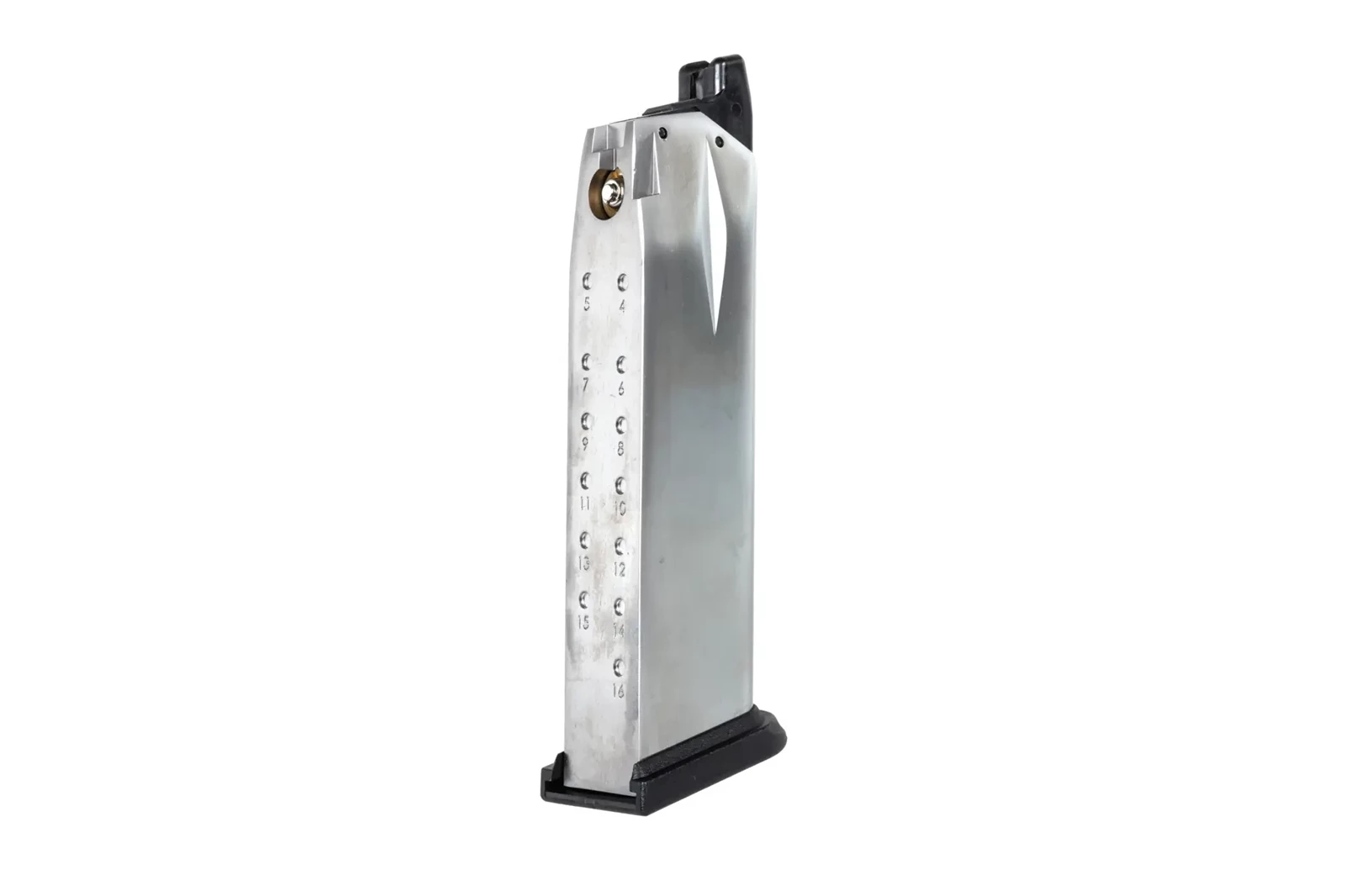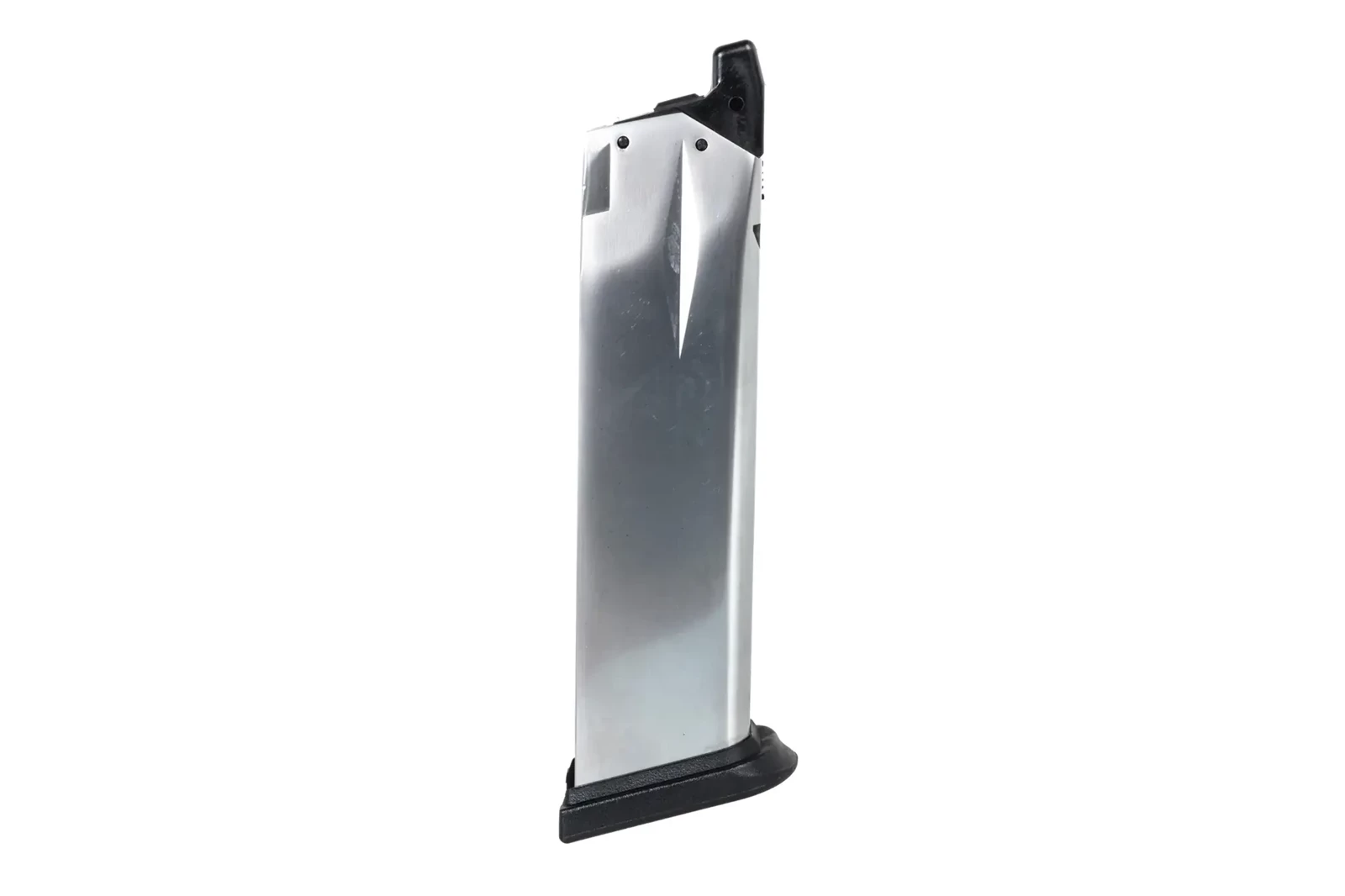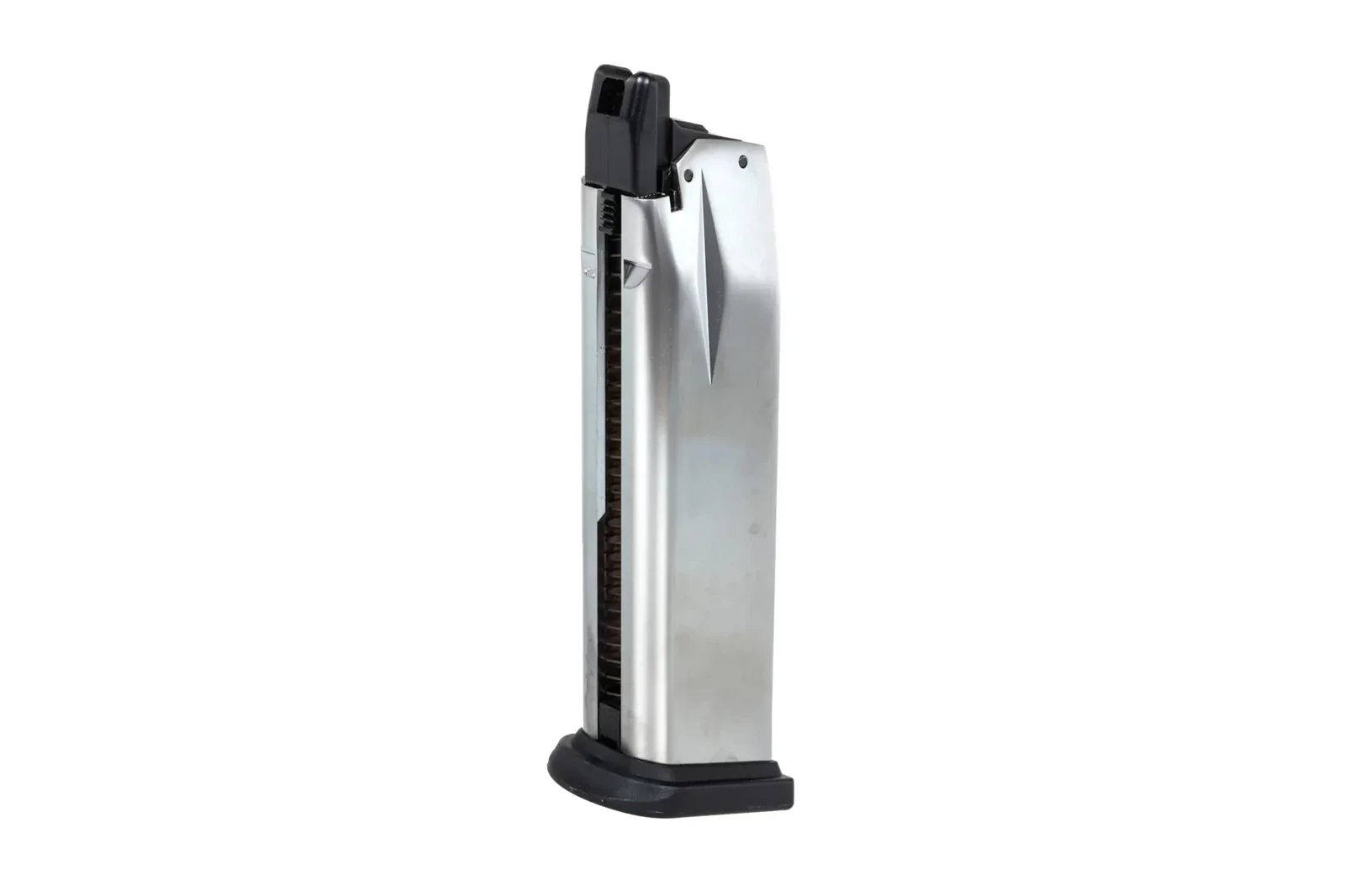 Metalowy i jednocześnie wytrzymały magazynek airsoftowy zasilany green gasem o pojemności 25 kulek.