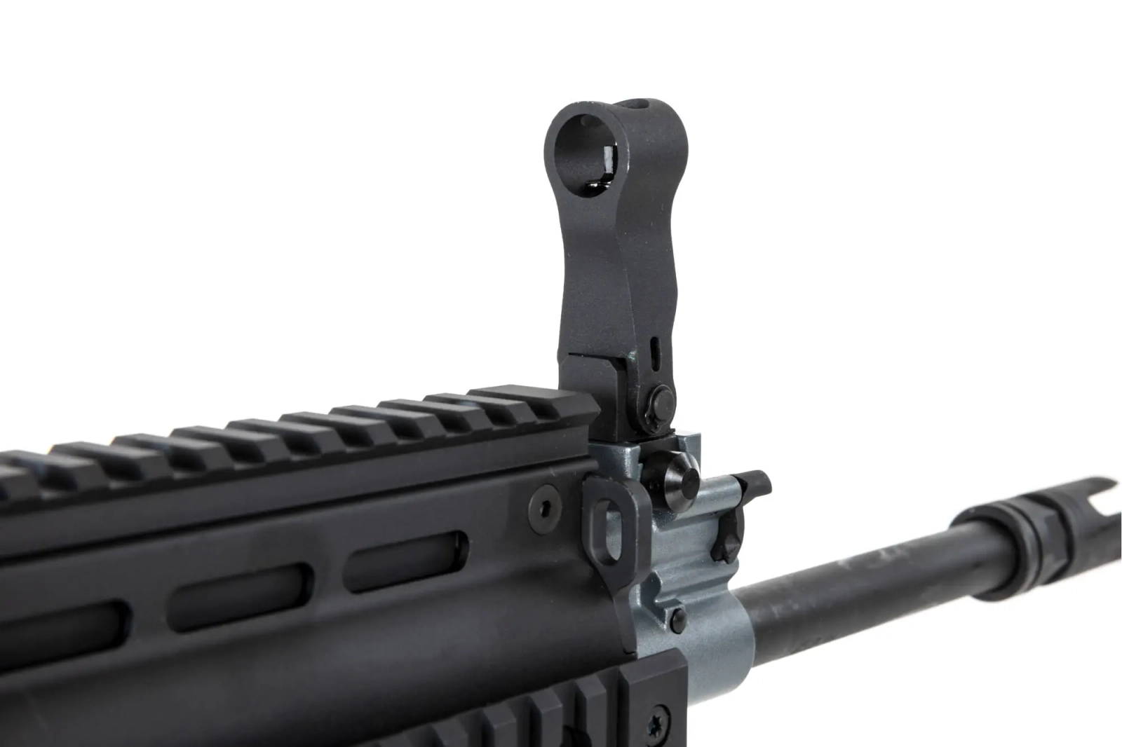 Ze stali wykonano: tłumik płomienia, lufę zewnętrzną, rączkę przeładowania, bolt-catch, przeziernik, piny oraz śruby. Z aluminium uświadczymy korpus repliki (górną część), atrapę bloku gazowego, górną i dolną szynę RIS (które umożliwią montaż np. optyki czy chwytu pionowego), manipulatory tj. selektor ognia oraz dźwignia blokady magazynka, magazynek oraz muszkę. Z tworzywa wykonano korpus (dolną część), boczne szyny RIS, chwyt pistoletowy oraz regulowaną kolbę (którą można złożyć na bok). Kolba została wyposażona w bakę paliczkową, której wysokość można dostosować do preferencji strzelca.