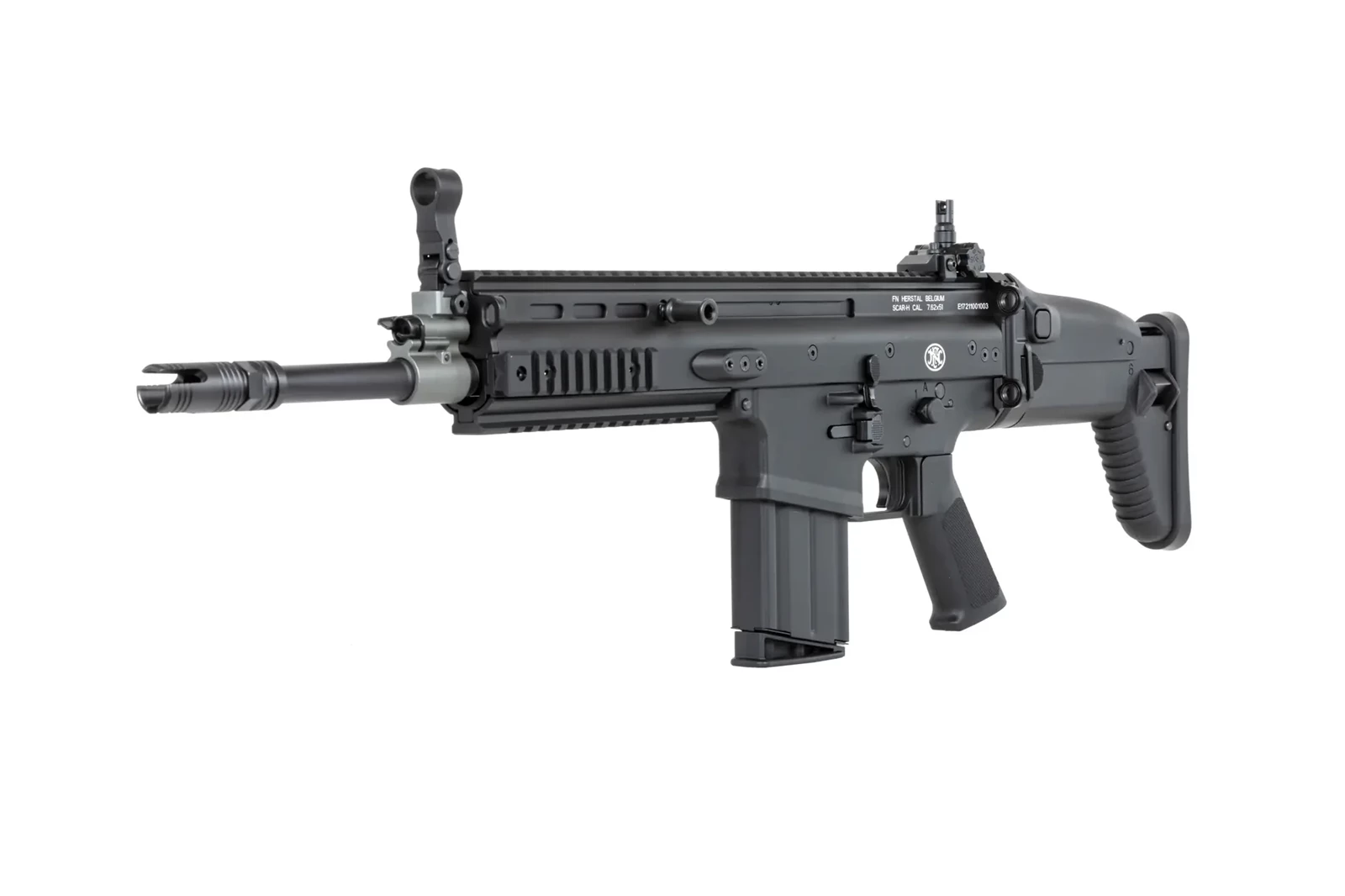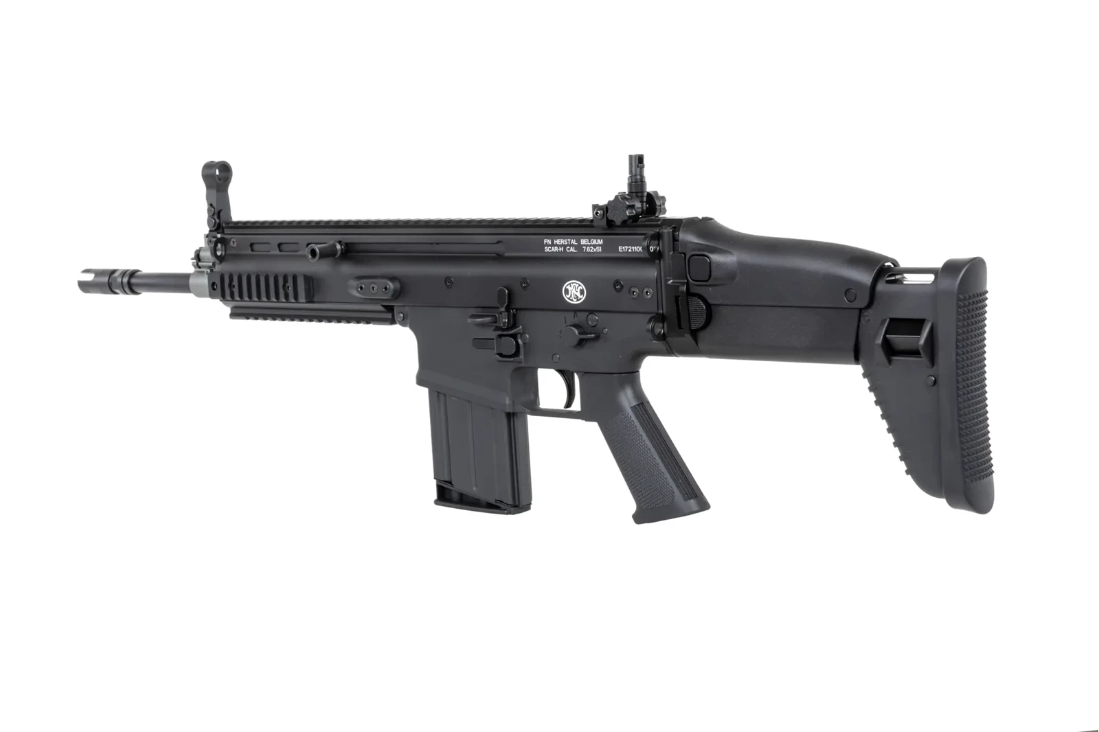 Karabinek szturmowy ASG od firmy Cybergun na licencji udzielonej przez FN HERSTAL - belgijskiego producenta broni palnej - co przełoży się na odpowiednie oznaczenia na korpusie karabinka - tj. logo belgijskiego producenta FN HERSTAL oraz nazwę FN HERSTAL BELGIUM. Dodatkowo na korpusie widnieje nazwa modelu FN SCAR-H Cal. 7.62x51.
