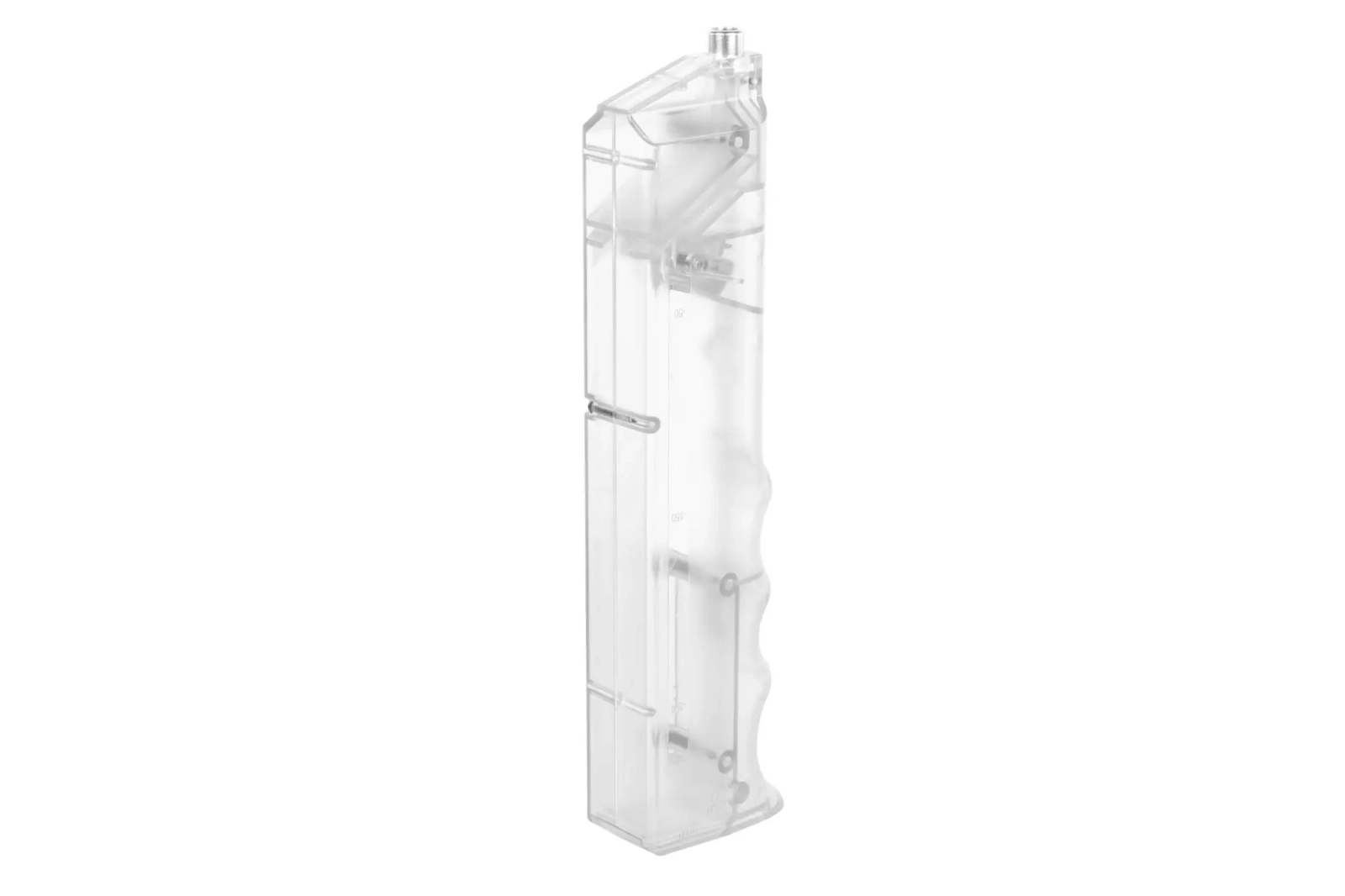 Wykonana z wytrzymałego i przeźroczystego tworzywa szybkoładowarka od producenta Wosport. Jednorazowo model jest w stanie pomieścić ok. 300 kulek. Bez problemu będzie w stanie naładować magazynki typu real/low/mid-cap. W zestawie dołączono dodatkowe przejściówki. Szybkoładowarka ma kształt magazynka do PMu, więc będzie można ją przenosić w odpowiednich ładownicach.