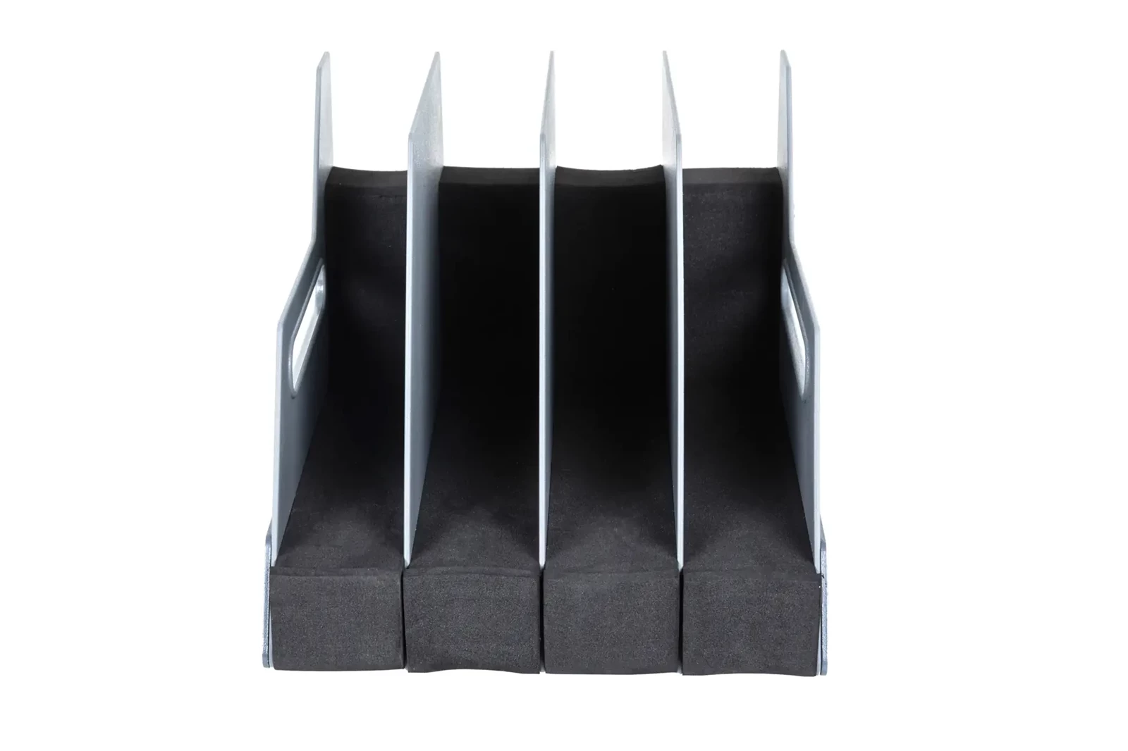 Ścianki modelu zostały wykonane z ABSu, jednocześnie projekt przewidział wygodne uchwyty, które pozwolą w bezpieczny sposób przenieść stojak z jednego miejsca na drugi. Co więcej, dno zostało wyścielone miękkim materiałem, który zapobiegnie ewentualnemu porysowaniu replik.