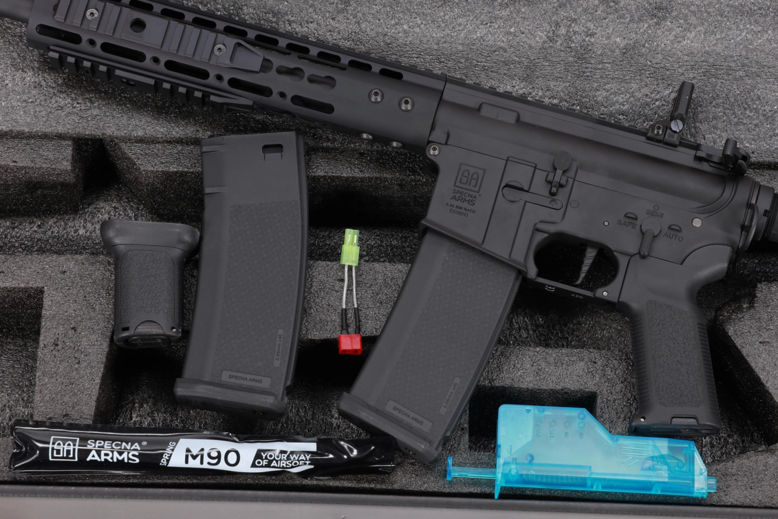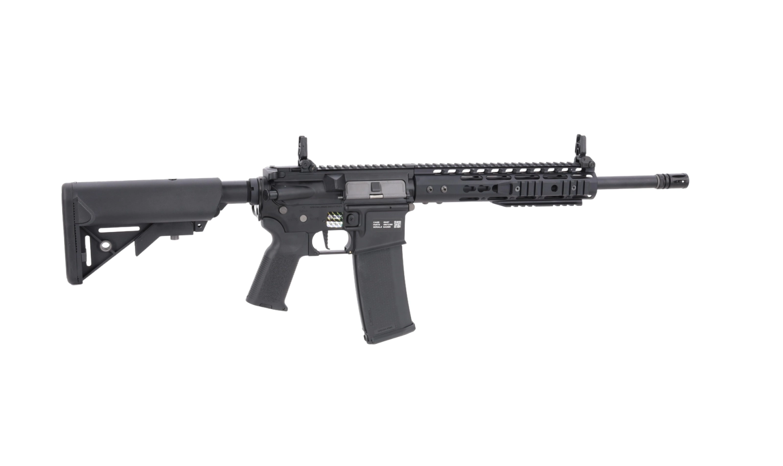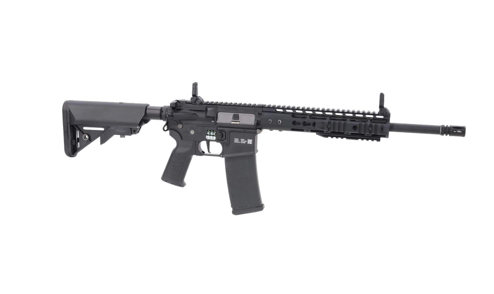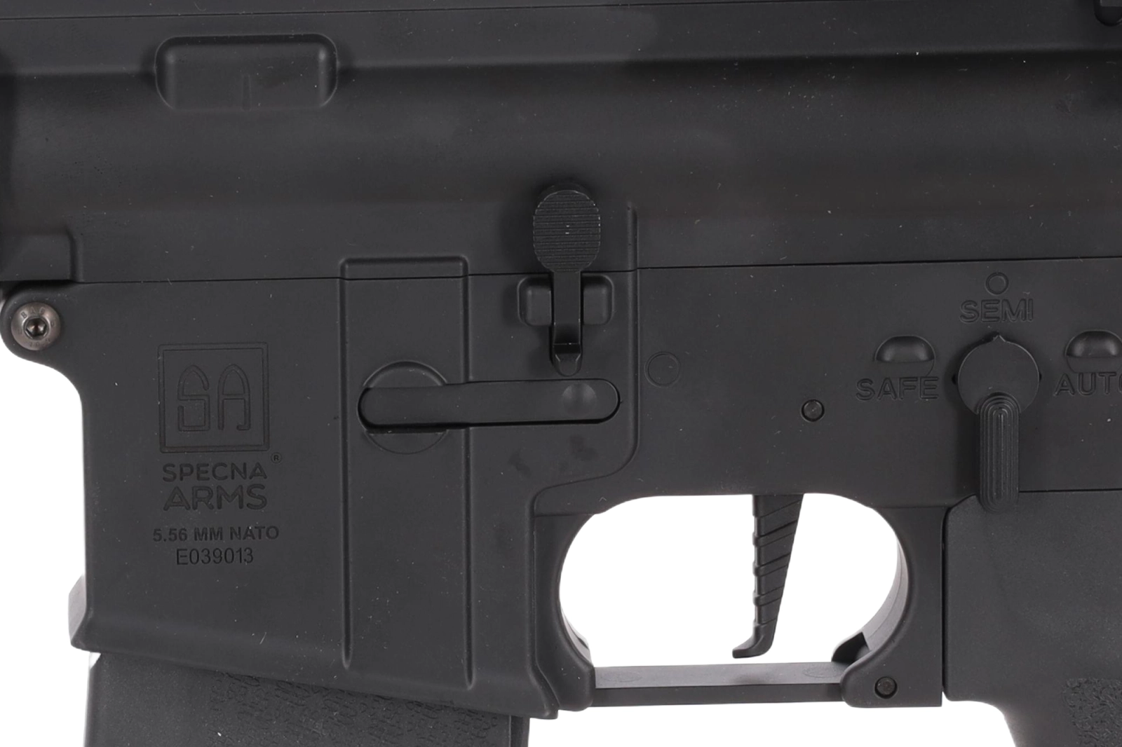 Na korpusie umieszczono oznaczenia Specna Arms oraz indywidualny numer seryjny. Warte uwagi detale to chwyt pistoletowy QD, zapewniający łatwy i szybki dostęp do silnika bez konieczności użycia narzędzi oraz obustronne ucho do montażu zawieszenia taktycznego.