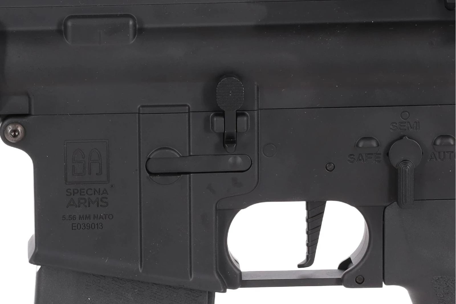 Na korpusie umieszczono oznaczenia Specna Arms oraz indywidualny numer seryjny. Warte uwagi detale to chwyt pistoletowy QD, zapewniający łatwy i szybki dostęp do silnika bez konieczności użycia narzędzi oraz obustronne ucho do montażu zawieszenia taktycznego.