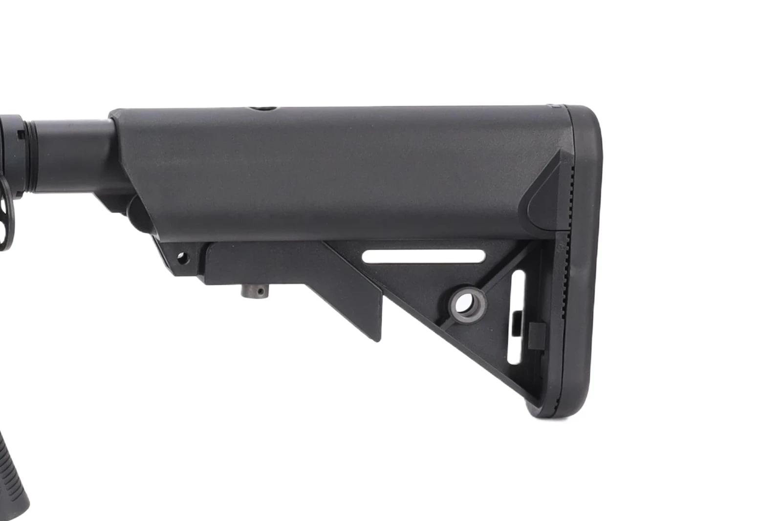 Model został wykonany głównie z metalu. Z wytrzymałego polimeru uświadczymy tu jedynie: pistoletowy chwyt QD zapewniający łatwy i szybki dostęp do silnika bez konieczności użycia narzędzi, ergonomiczną, regulowaną kolbę, w której pomieścimy akumulator, składane przyrządy celownicze oraz dodatkowe szyny RIS na łożu.