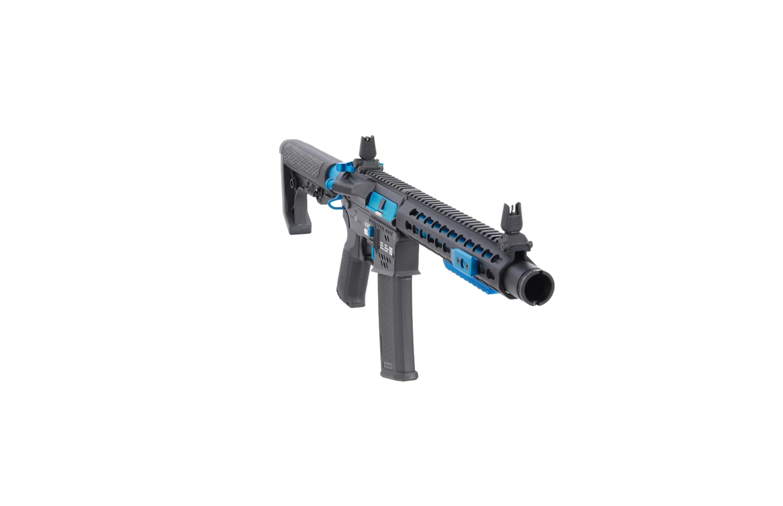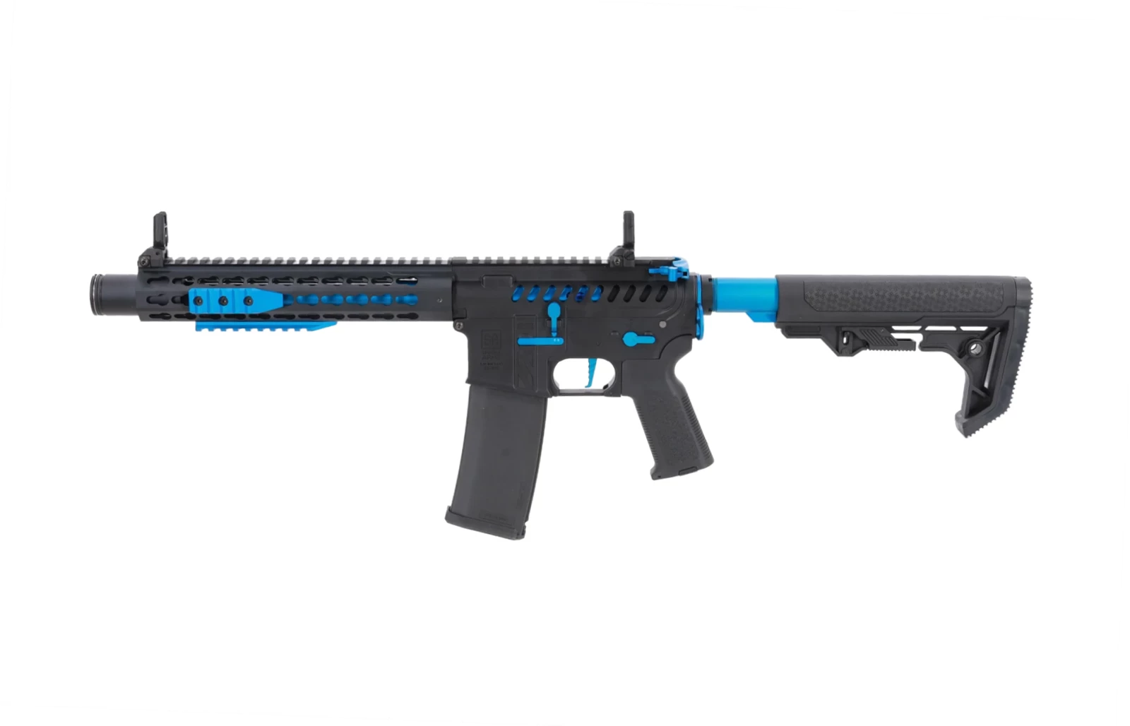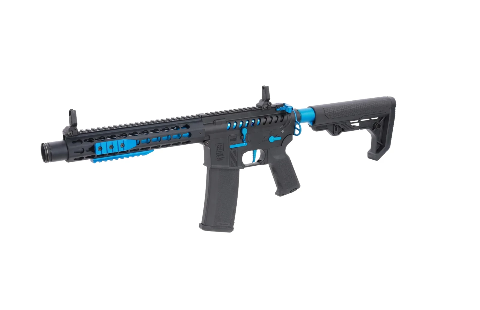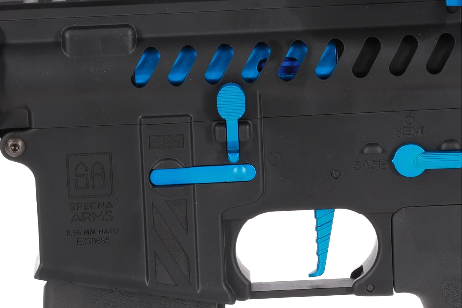 Na korpusie umieszczono indywidualny numer seryjny, grawer marki Specna Arms oraz specjalne nacięcia, które w połączeniu z niebieskimi elementami, dają bardzo ciekawy, estetyczny i rzadko spotykany wygląd.