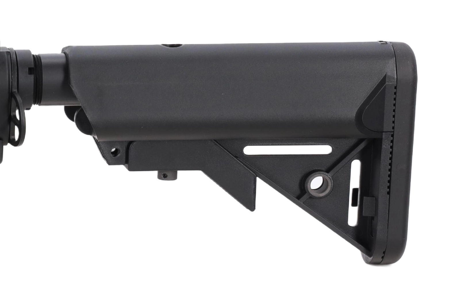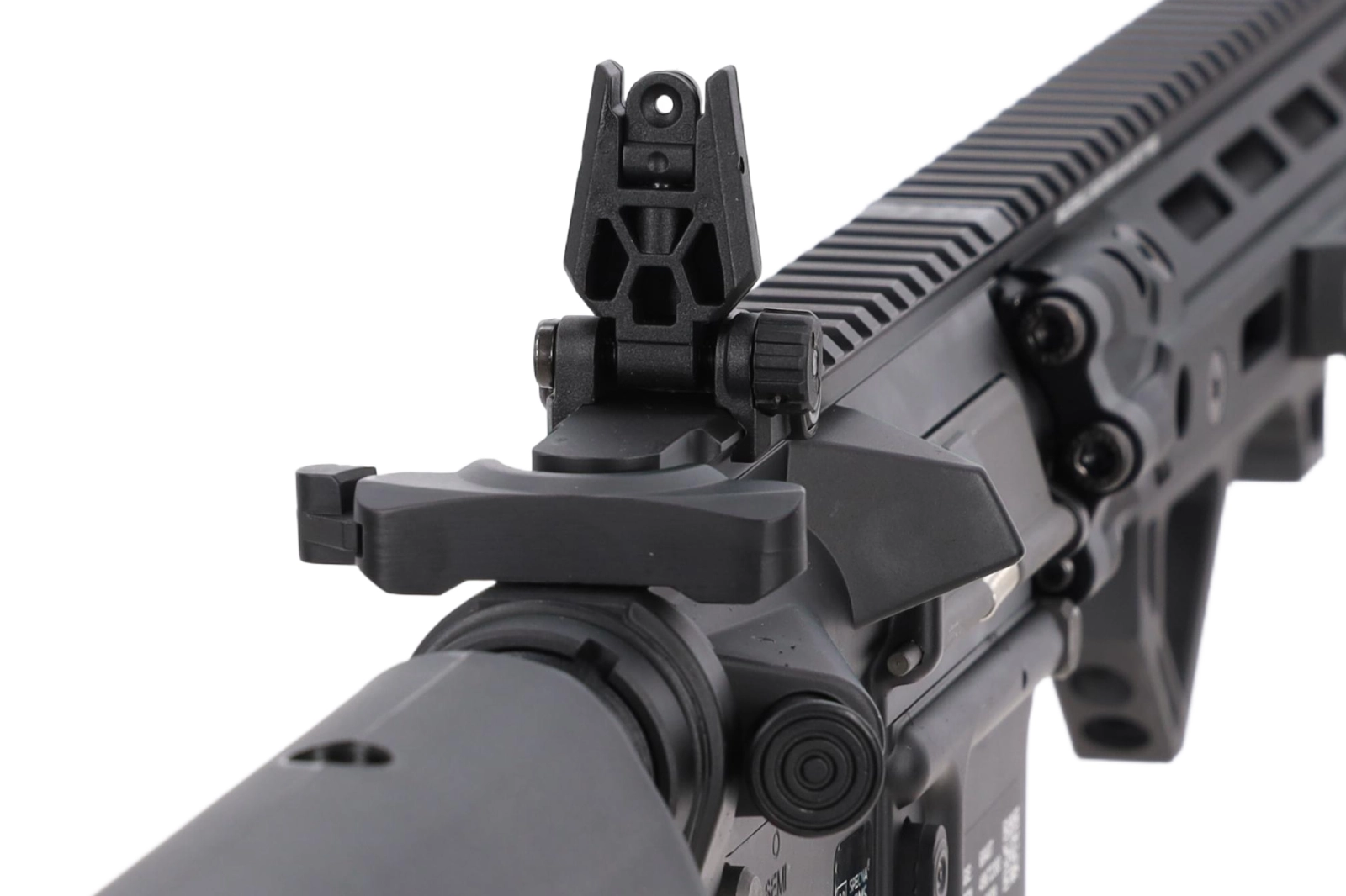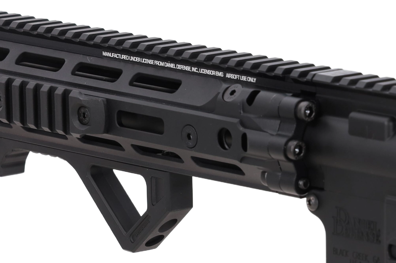 Chwyt pistoletowy QD, zapewniający łatwy i szybki dostęp do silnika bez konieczności użycia narzędzi, obustronne ucho do montażu zawieszenia taktycznego, front RIS III (również z oznaczeniami Daniel Defense®), który jest kompatybilny zarówno z systemem RIS jak i M-LOK - na chwycie znajduje się poprzednio zamontowany chwyt kątowy, a pozostała przestrzeń umożliwi montaż sporej ilości dodatkowych akcesoriów; lasery, latarki, kolimatory itp. Replika posiada mieszczącą akumulator powiększoną kolbę typu SF, składane przyrządy celownicze, powiększoną rączkę przeładowania, dodatkowe szyny RIS po obu stronach łoża. Replika w większości wykonana została z metalu, jedyne polimerowe elementy to kolba, chwyt pistoletowy, przyrządy celownicze, dodatkowe szyny RIS, co przełoży się na jej dużą wytrzymałość i odporność na niesprzyjające warunki w terenie.