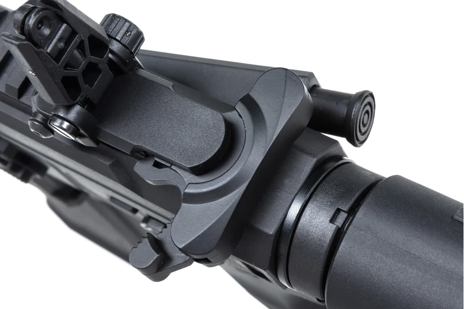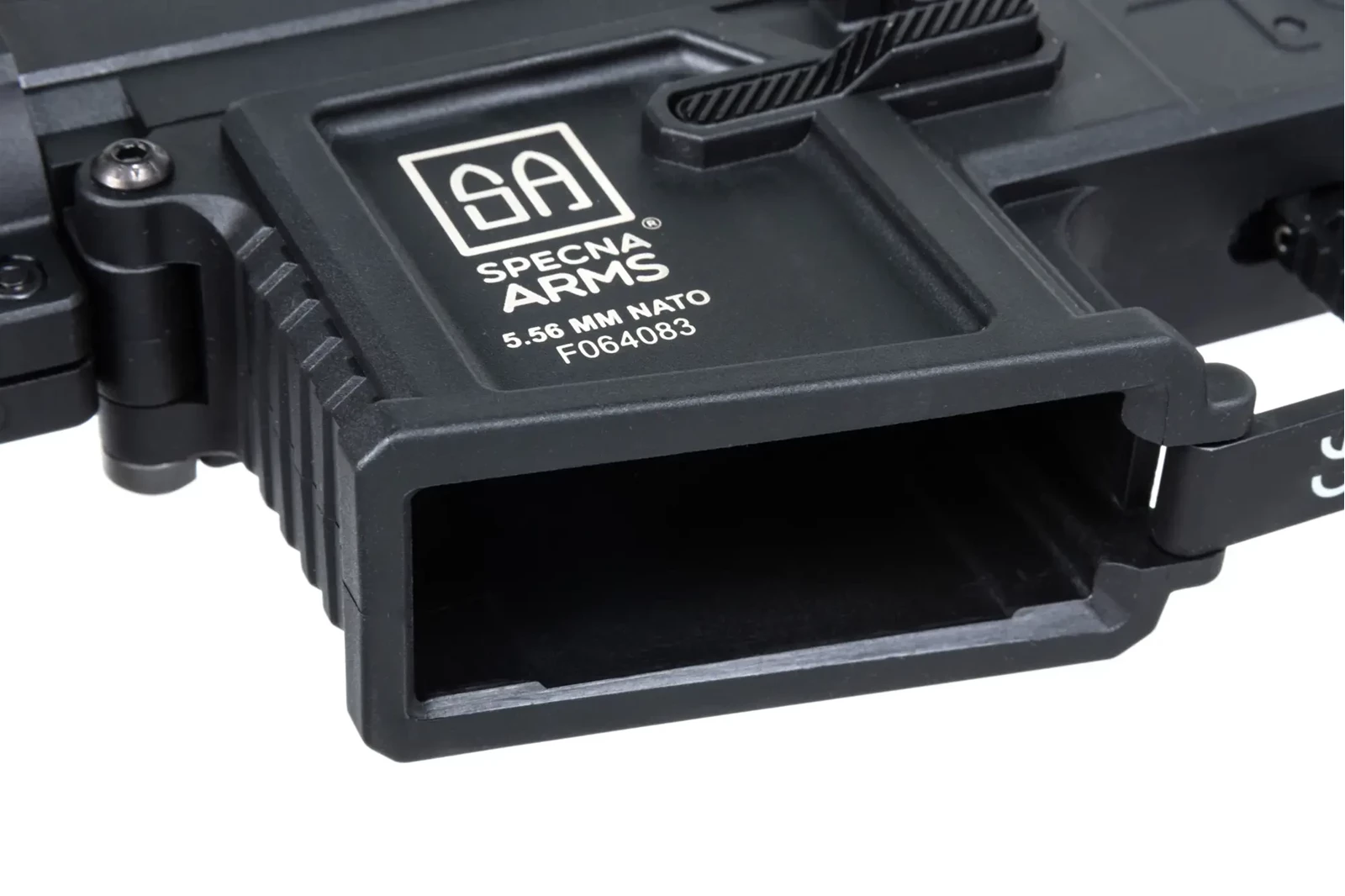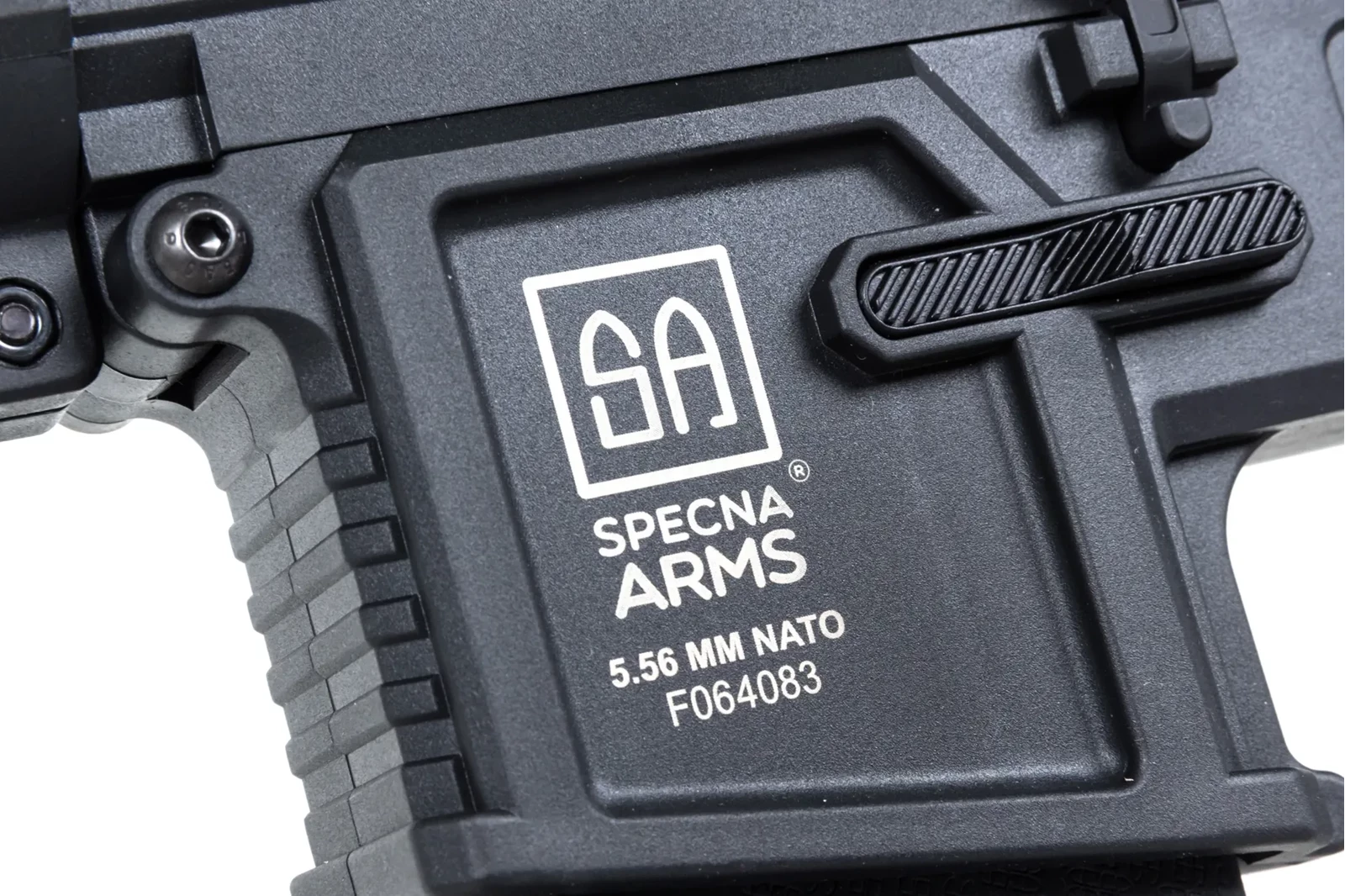 Korpus to autorski projekt Specna Arms łączący w sobie walory estetyczne oraz wysoką ergonomię. Każdy element został wykonany oraz spasowany z dbałością o szczegóły. Model posiada obustronne powiększone manipulatory (selektor oraz zwalniacz magazynka) oraz funkcjonalny bolt-catch.