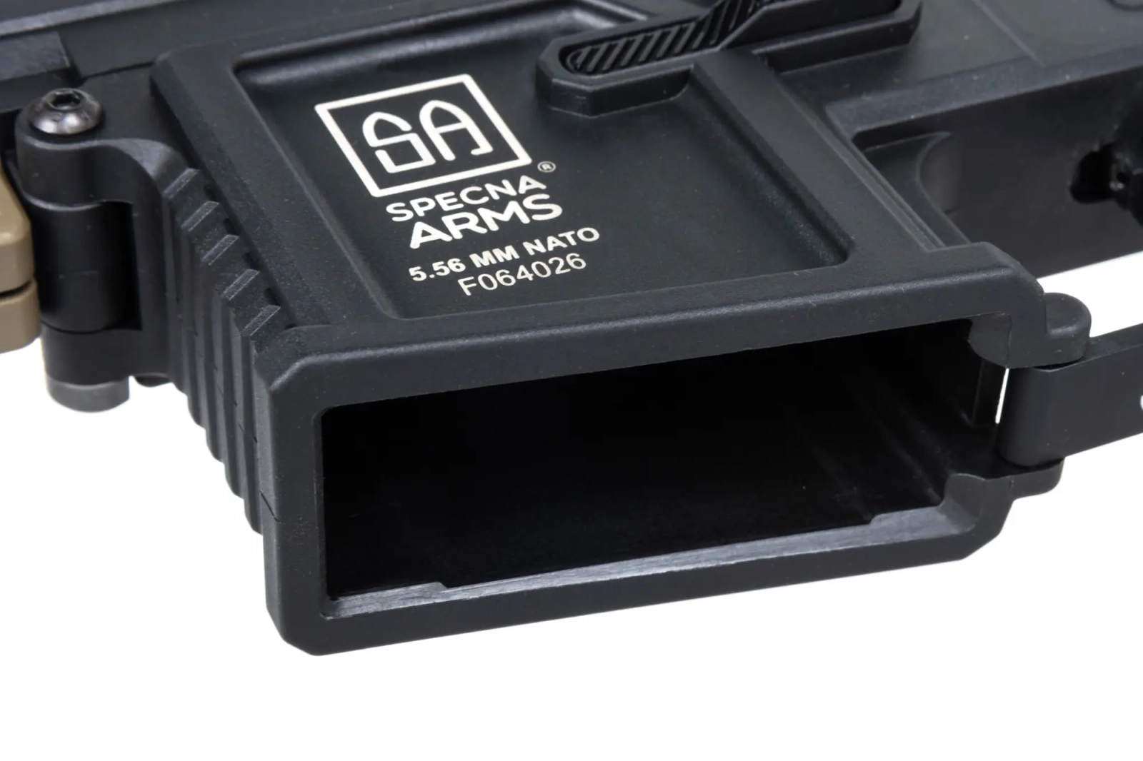 Korpus to autorski projekt Specna Arms łączący w sobie walory estetyczne oraz wysoką ergonomię. Każdy element został wykonany oraz spasowany z dbałością o szczegóły. Model posiada obustronne powiększone manipulatory (selektor oraz zwalniacz magazynka) oraz funkcjonalny bolt-catch.