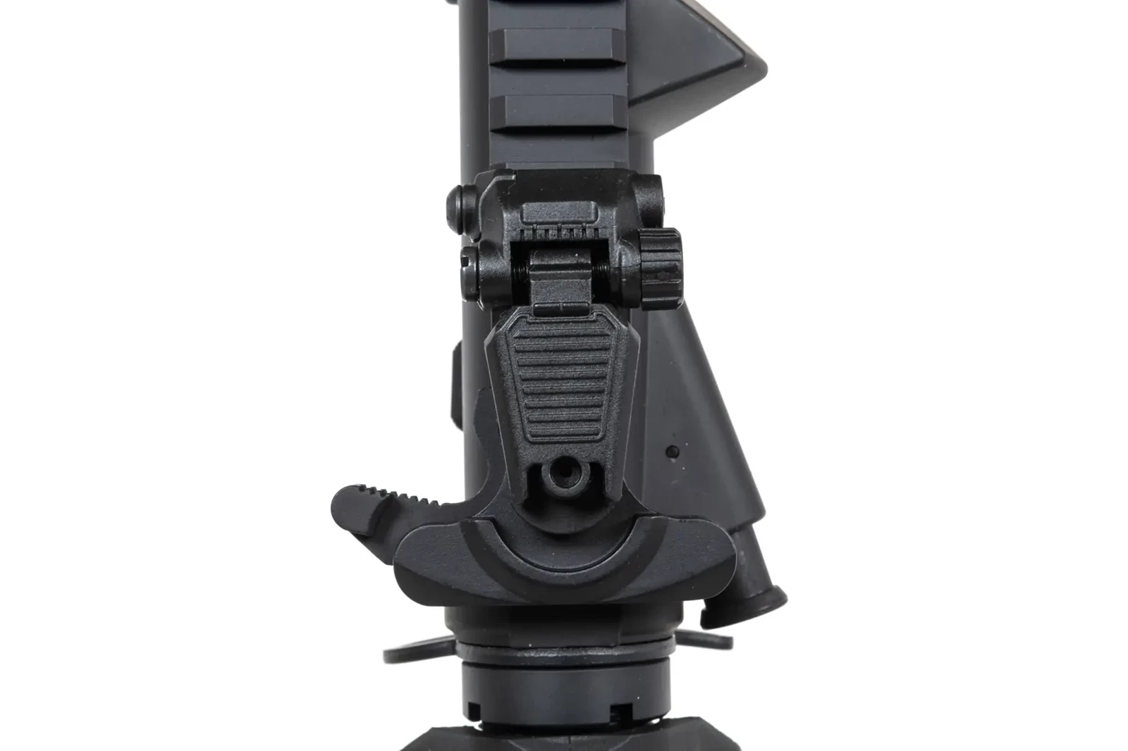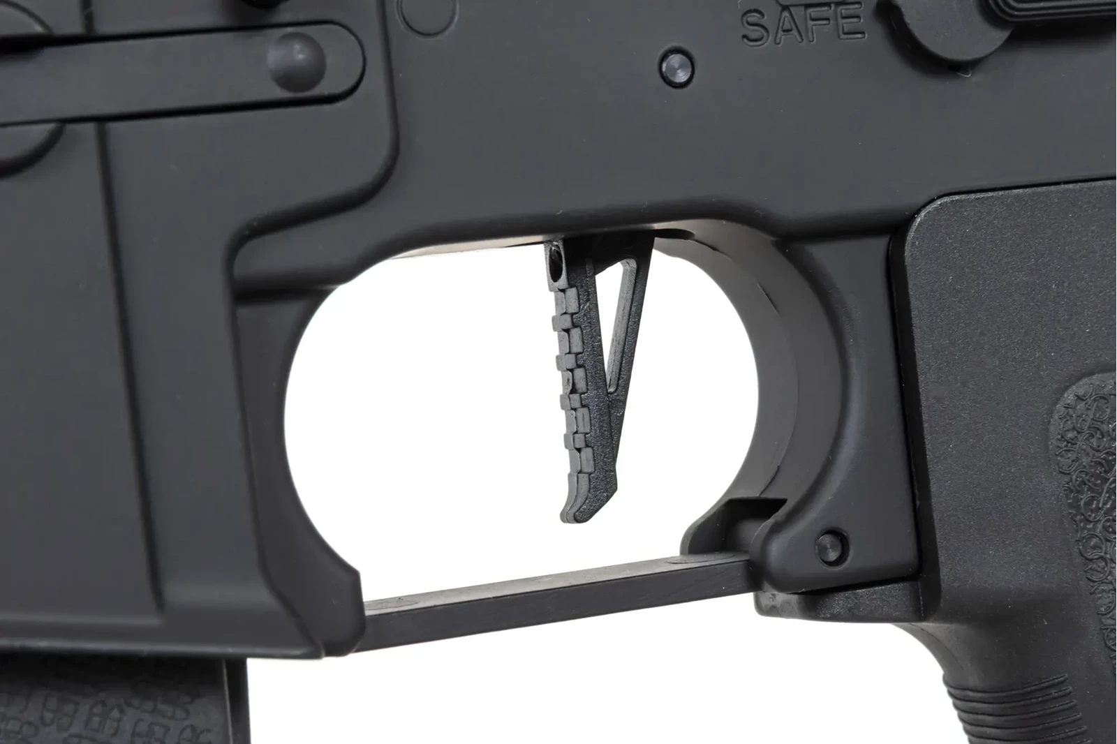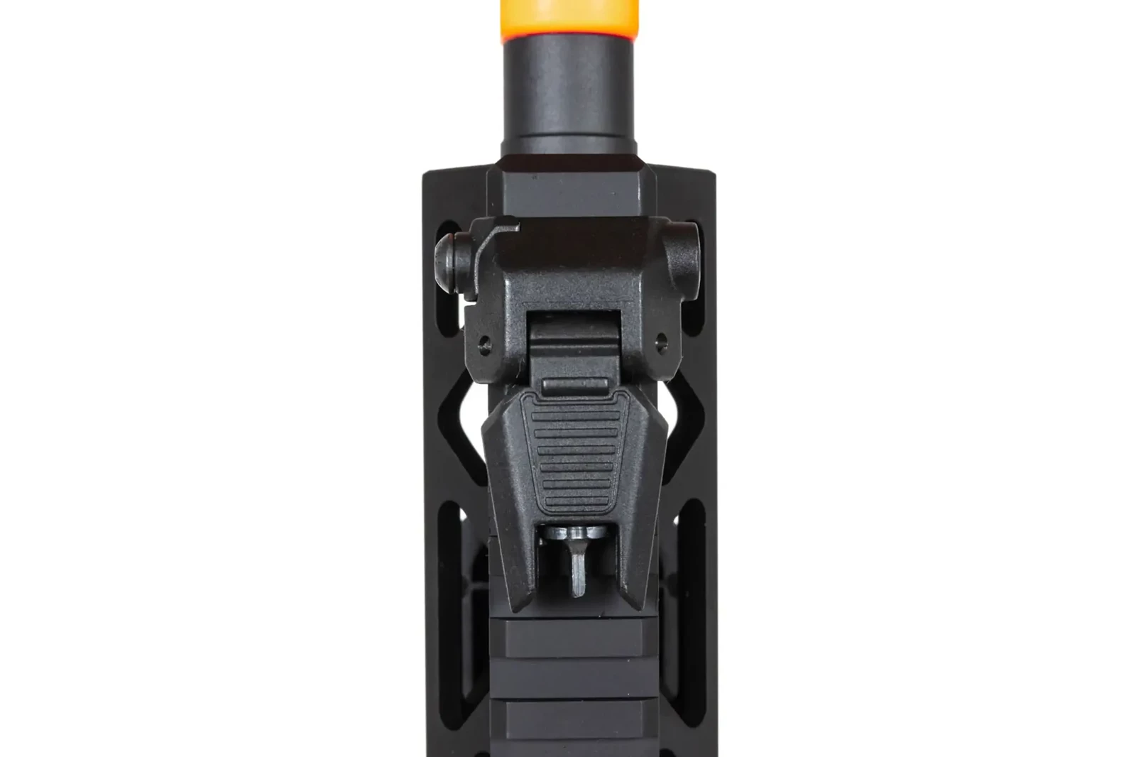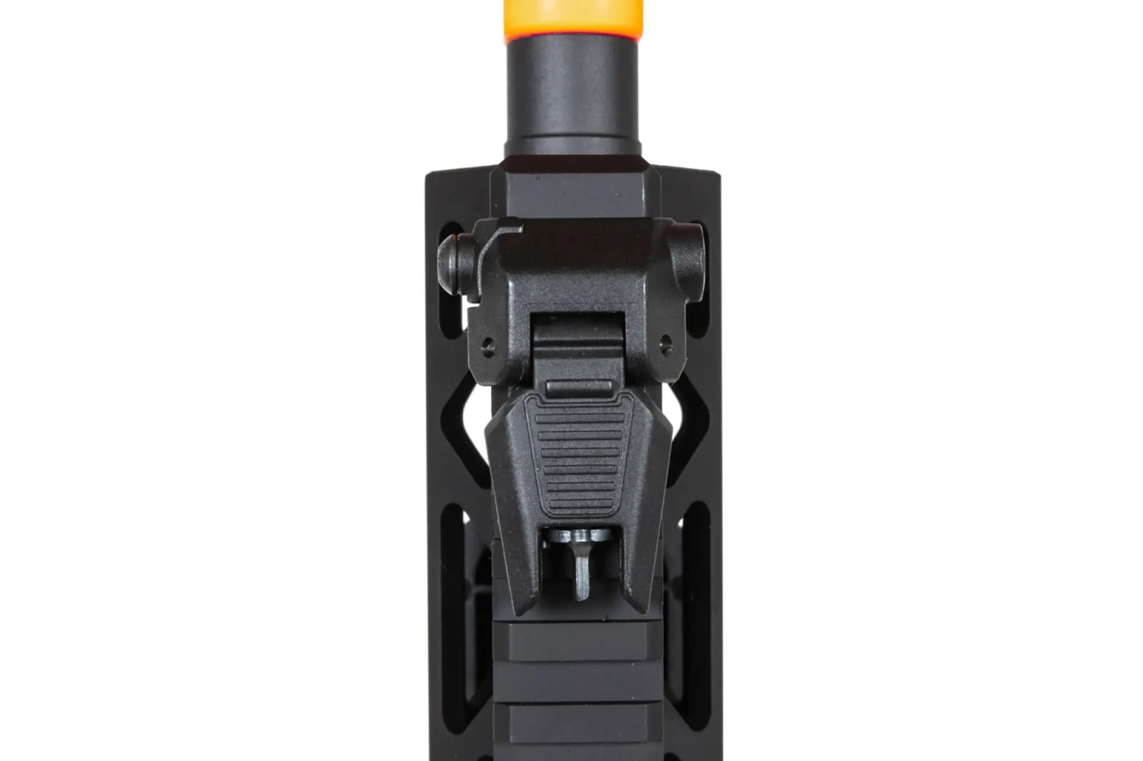 Replika wyposażona jest we frontową szynę RRA Lightweight Free Float Rail w standardzie M-LOK licencjonowaną przez Rock River Arms®. Lufa zakończona jest pomarańczowym urządzeniem wylotowym osadzonym na gwincie 14mm CCW. Na grzbiecie repliki umieszczono składane przyrządy celownicze.