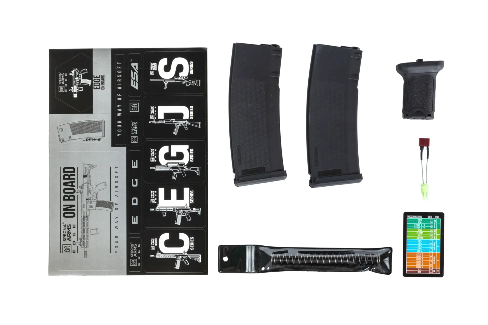 W pudełku z repliką znajdują się dwa magazynki mid-cap S-MAG o pojemności 125 kulek każdy. S-MAG to ekskluzywny magazynek polimerowy zaprojektowany przez Specna Arms. Na uwagę zwraca charakterystyczna faktura złożona z logotypów Specna Arms. S-mag zapewnia bezproblemowe podawanie kulek, nawet przy wysokim ROF.