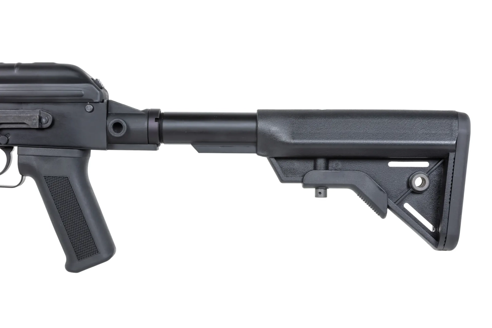 Z wytrzymałego tworzywa wykonano: chwyt pistoletowy, magazynek, taktyczną kolbę, łoże oraz osłonę rury gazowej