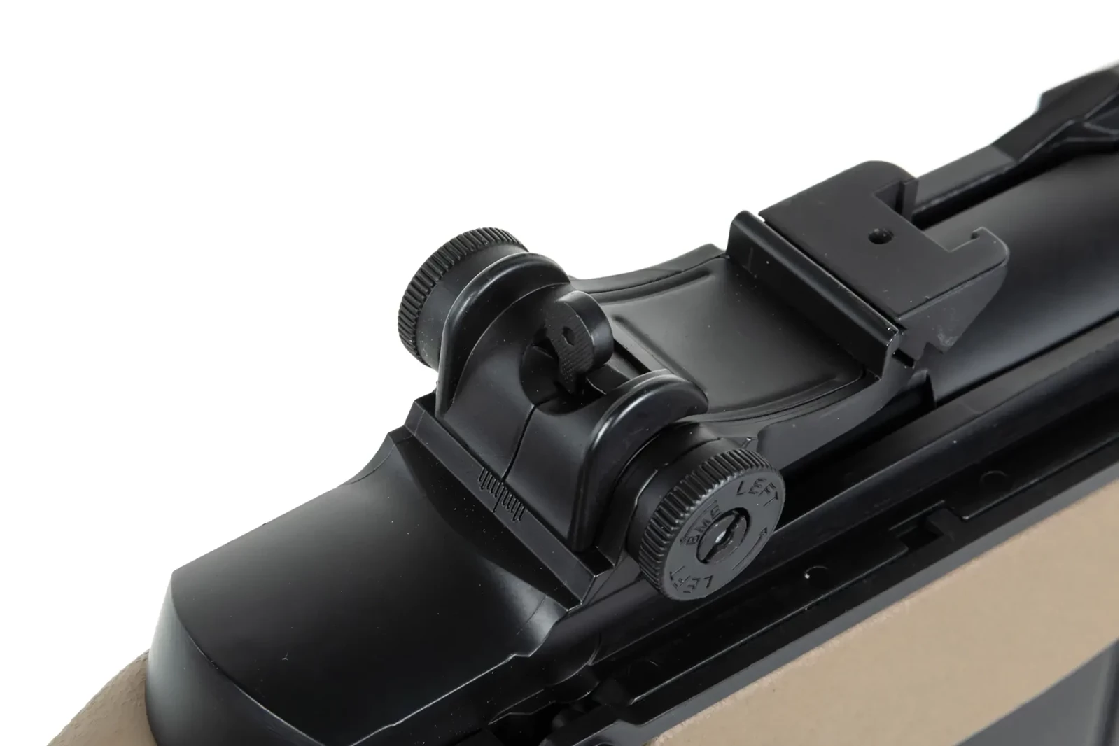 Replika została wyposażona w górną szynę montażową RIS 22mm, która pozwoli na mocowanie wszelkiej maści celowników optycznych. CM032A posiada wygodny bezpiecznik umieszczony zaraz przy kabłąku spustowym, obsługiwany kciukiem przełącznik trybu ognia, a także komplet regulowanych, mechanicznych przyrządów celowniczych. Akumulator mieści się wewnątrz stałej kolby repliki.