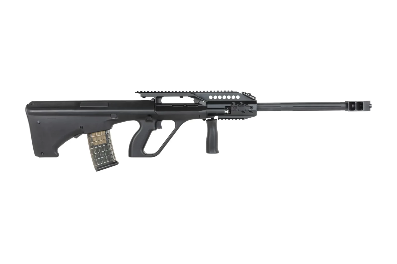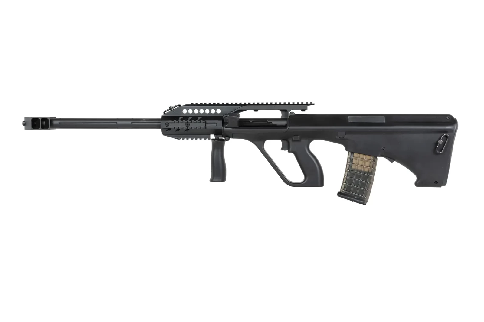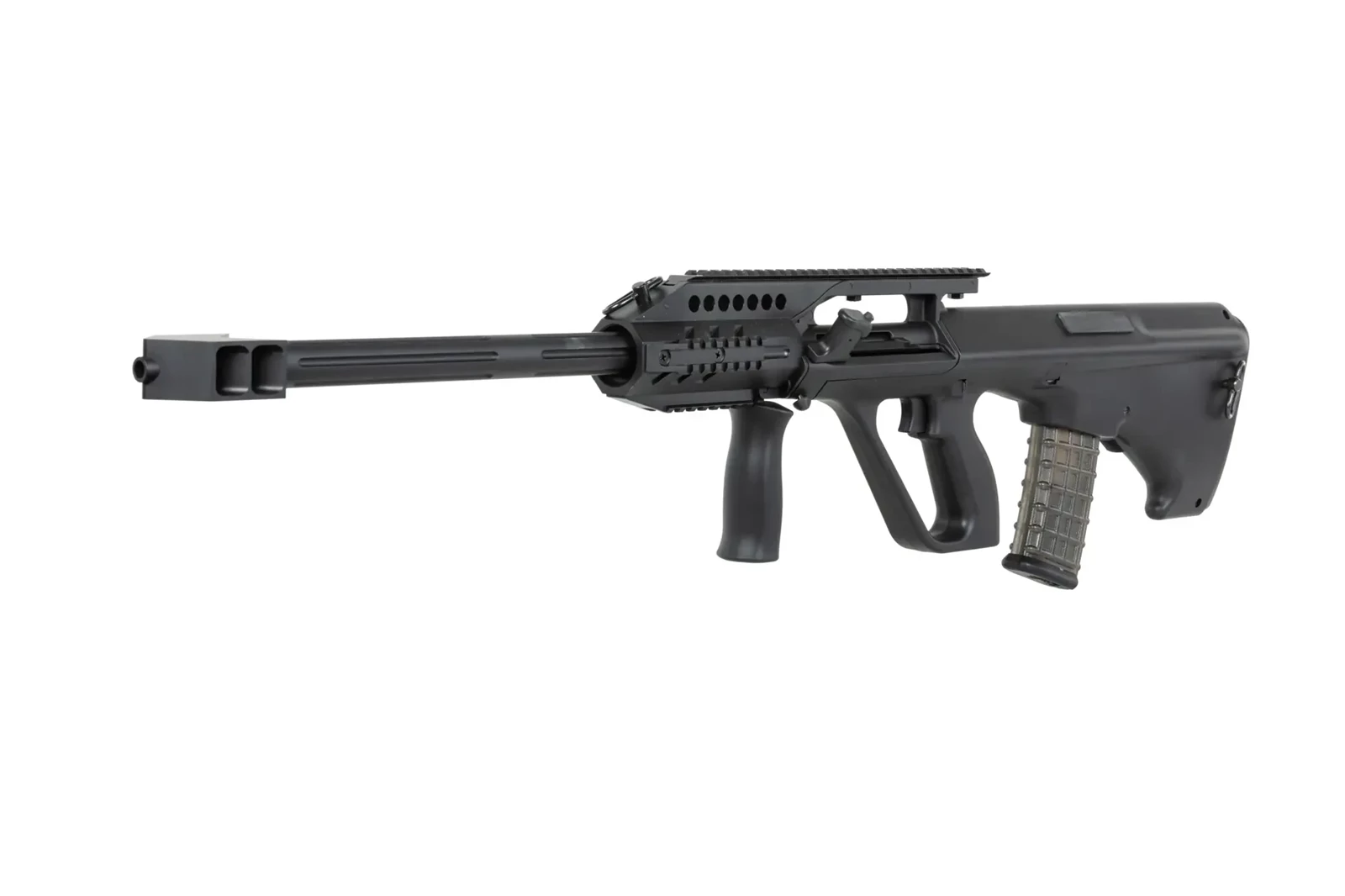 są po prostu charakterystyczne i nie sposób ich pomylić z niczym innym. Replika została wykonana przy wykorzystaniu m.in. metalu - mowa tu o bardzo długiej lufie zewnętrznej, zakończonej charakterystycznym kompensatorem, który zwykle można widzieć w karabinach snajperskich. Dodatkowo z metalu wykonano grzbietową szynę, która umożliwi mocowanie dodatkowych akcesoriów oraz dodatkowe szyny (boczne oraz dolną) na łożu - który również jest metalowy. Z metalu (stali) wykonano śruby oraz piny wraz z uszami zawieszenia taktycznego (zarówno frontowe jak i przy kolbie).