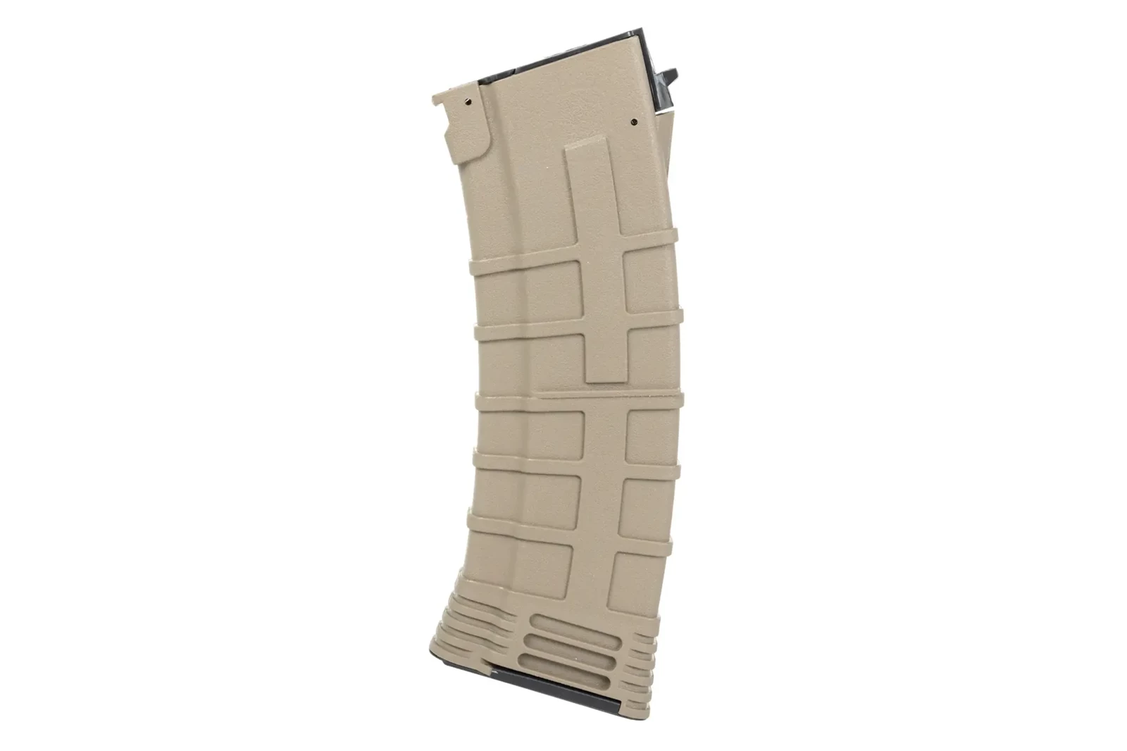 Model został wykonany z wytrzymałego tworzywa, przeznaczony jest do elektrycznych replik typu AK. Pomieści 500 kulek, korpus magazynka posiada ergonomiczną powierzchnie, która ułatwi manipulowanie oraz obsługę magazynka nawet, gdy użytkownik nosi grube rękawiczki.