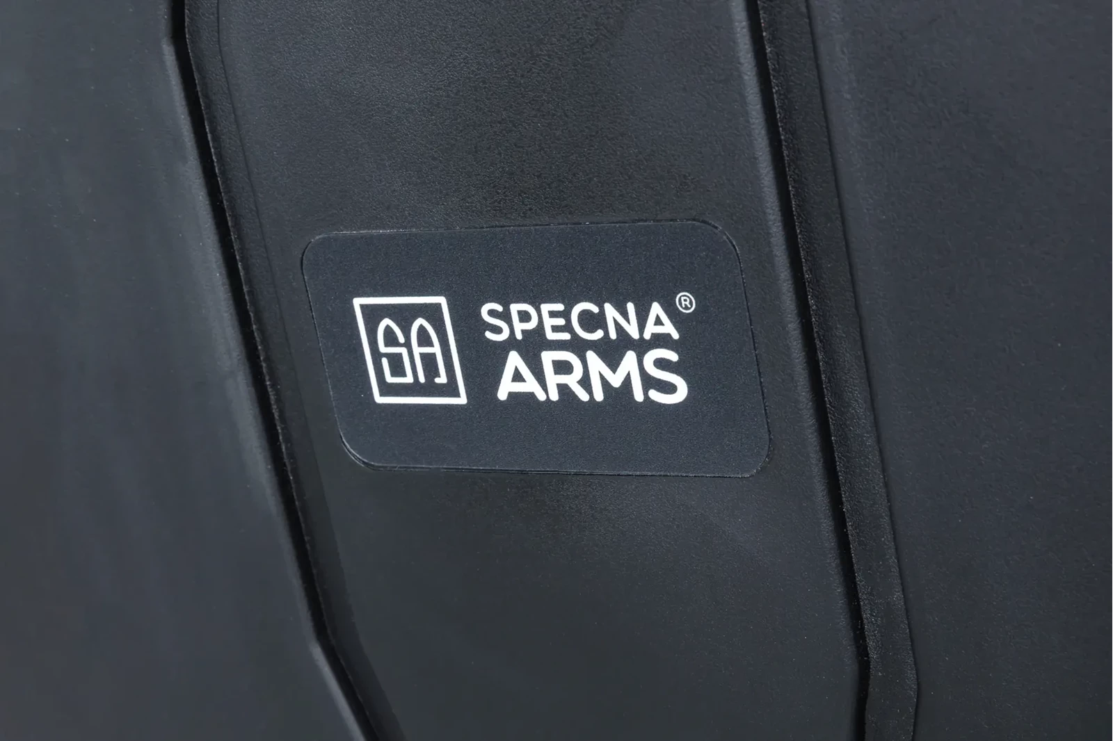 Wewnątrz znajdziemy gumowe uszczelki, które będą chronić przed zapyleniem lub wilgocią (IP67). Skrzynia posiada żebrowania, które umożliwią piętrowanie większej ilości modeli. Na klapie znajduje się eleganckie logo Specna Arms.
