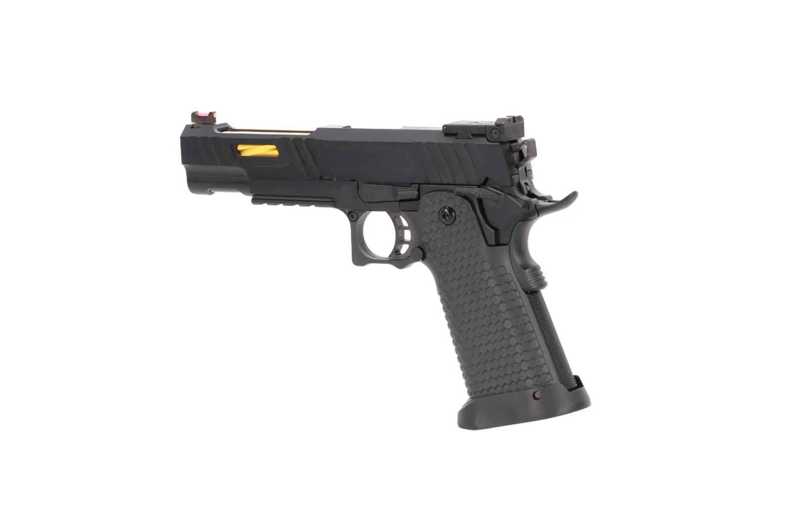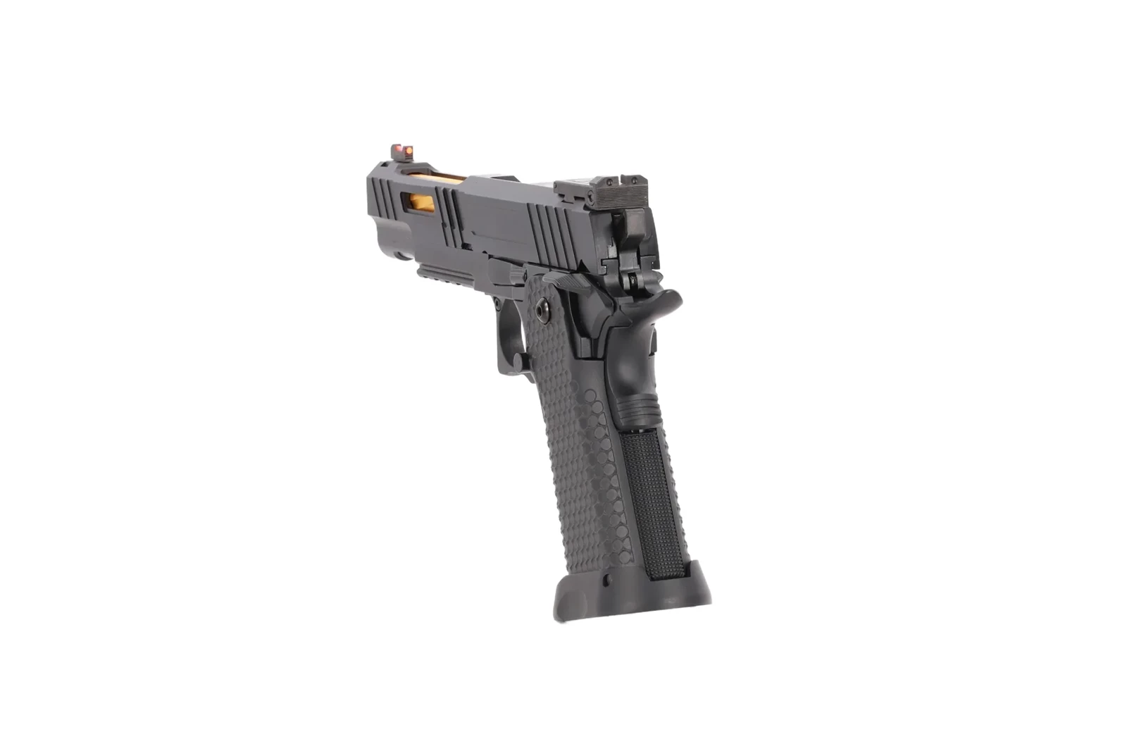 Model wyposażony został w światłowodową muszkę oraz szczerbinkę, która posiada prostą regulację góra-dół, prawo-lewo. W celu uzyskania przewagi nad przeciwnikiem, pod lufą znajduje się szyna pozwalająca zamocować laser lub latarkę a na zamku znajdują się żebrowania, które ułatwią przeładowanie. Zostając przy zamku, należy zwrócić uwagę na wycięcia na nim - umożliwia to podgląd na złotą lufę zewnętrzną. Całość przykuwa uwagę ze względu na niecodzienny i elegancki design, który dodaje produktowi charakteru.