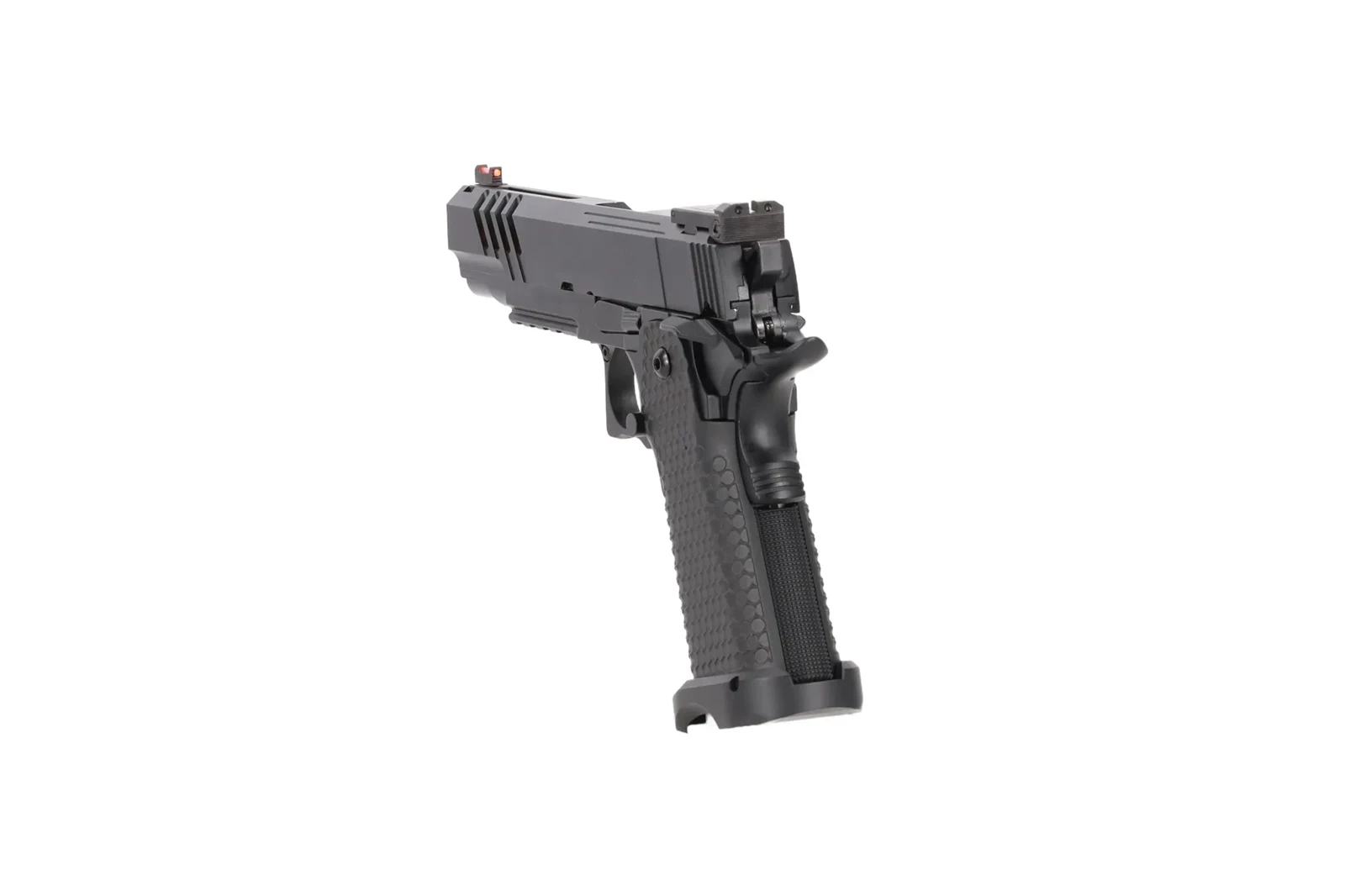 Chropowata rękojeść wykonana z tworzywa zapewnia pewny, antypoślizgowy chwyt podczas dynamicznych manewrów a powiększony lejek ułatwi przeładowanie.