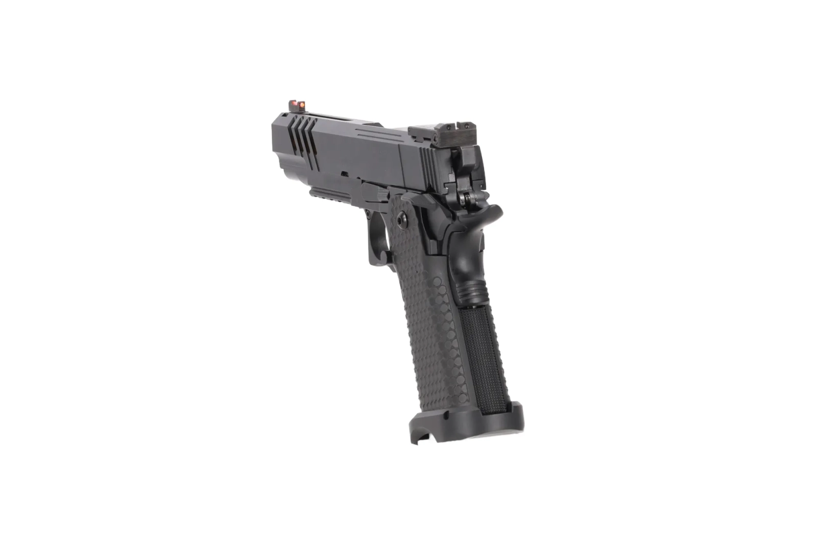 Chropowata rękojeść wykonana z tworzywa zapewnia pewny, antypoślizgowy chwyt podczas dynamicznych manewrów a powiększony lejek ułatwi przeładowanie.