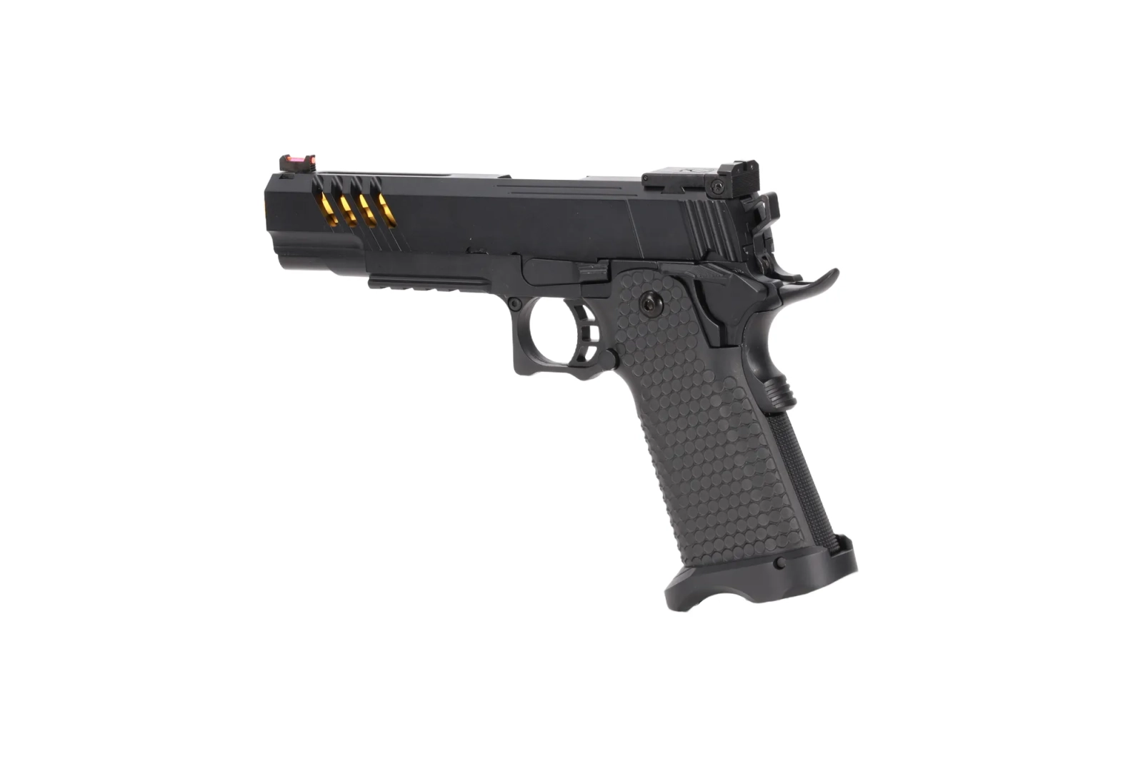Model wyposażony został w światłowodową muszkę oraz szczerbinkę, która posiada prostą regulację góra-dół, prawo-lewo. W celu uzyskania przewagi nad przeciwnikiem, pod lufą znajduje się szyna pozwalająca zamocować laser lub latarkę a na zamku znajdują się żebrowania, które ułatwią przeładowanie. Zostając przy zamku, należy zwrócić uwagę na wycięcia na nim - umożliwia to podgląd na złotą lufę zewnętrzną. Całość przykuwa uwagę ze względu na niecodzienny i elegancki design, który dodaje produktowi charakteru.