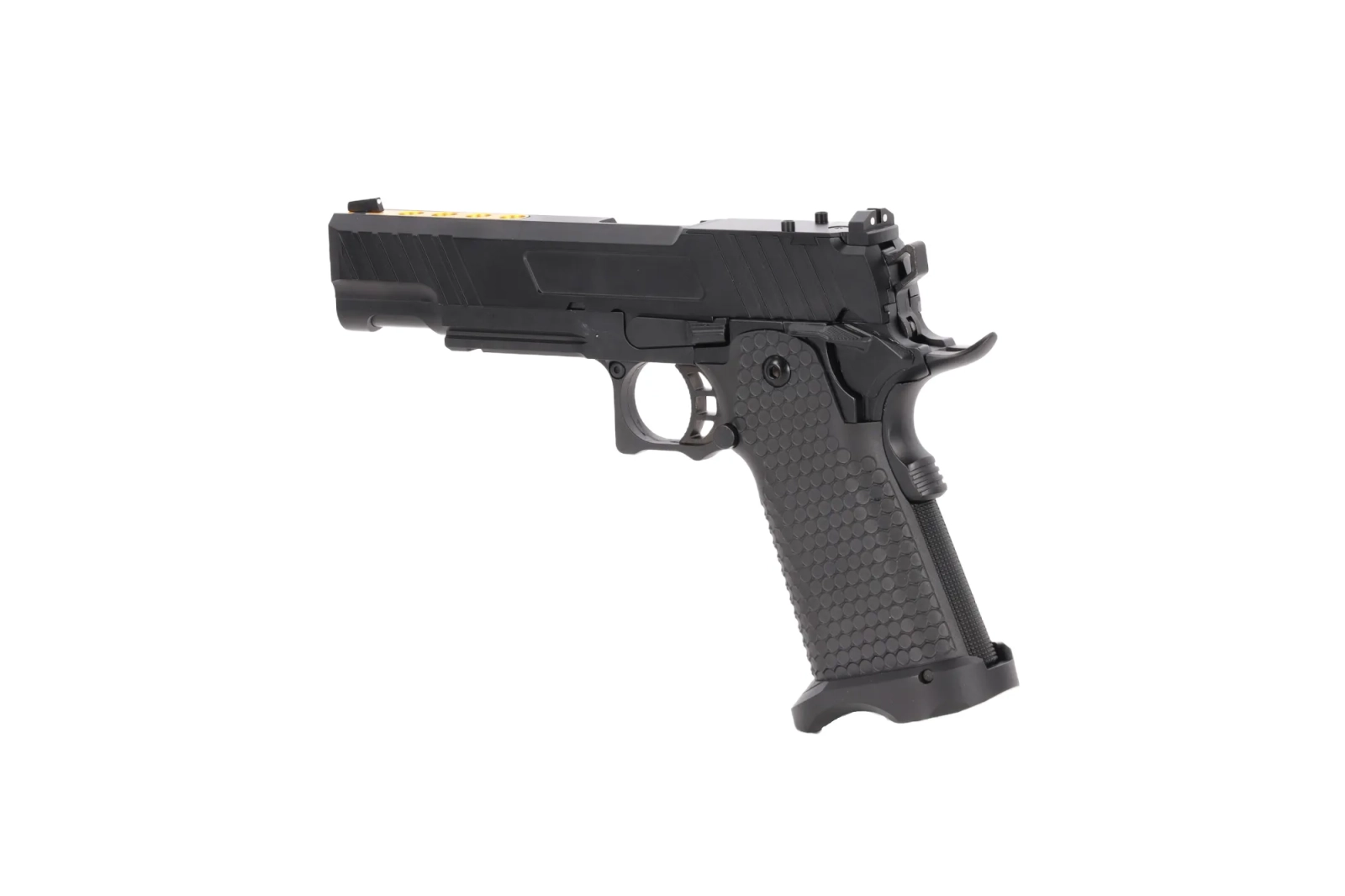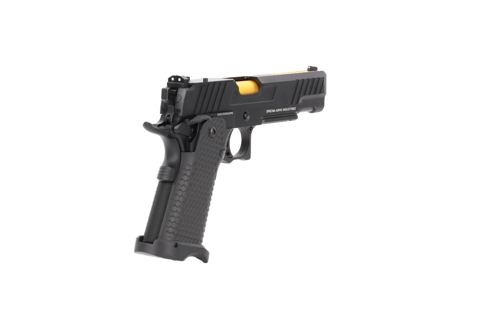 Pistolet SA-VGP19 VAPOR™ od producenta Specna Arms to pistolet zasilany green gasem, który został zaprojektowany zarówno dla początkujących jak i bardziej doświadczonych graczy, którzy oczekują wysokiej jakości wykonania i kultury pracy, dobrej ergonomii - wszystkiego, co pozwoli zdominować airsoftowe pole podczas rozgrywek CQB. Wykonany został przede wszystkim z metalu (ze stali wykonano język spustowy oraz kurek), z tworzywa wykonano jedynie okładziny na rękojeści i kabłąk.