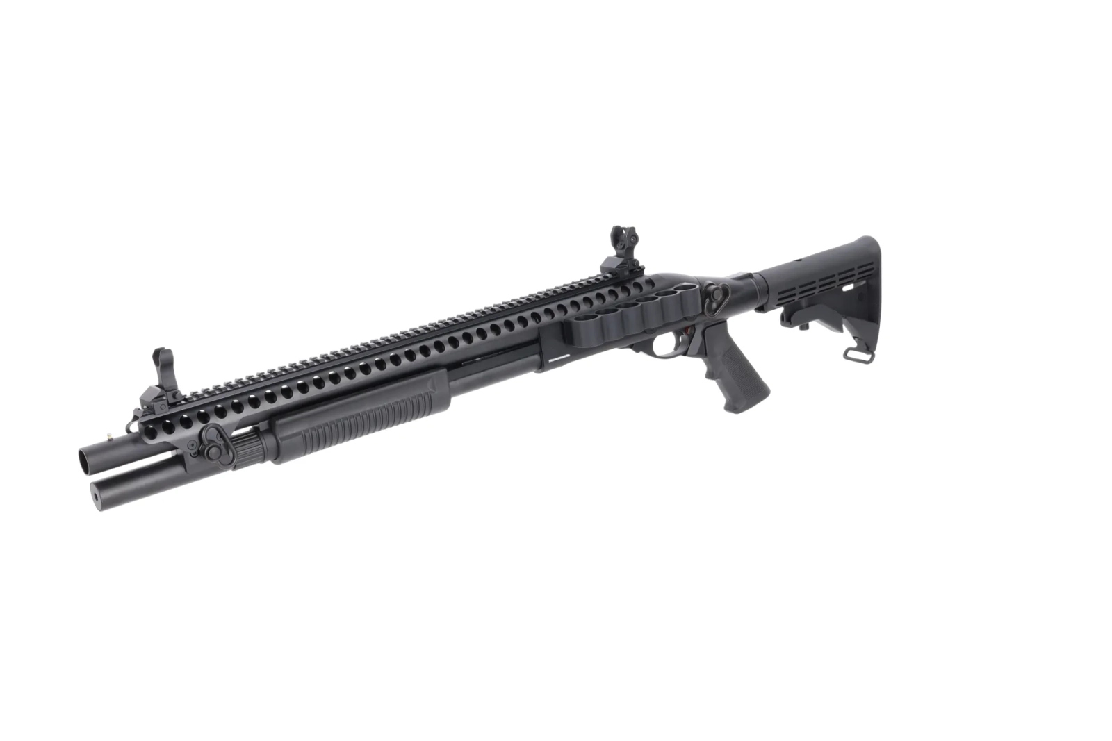 Replika posiada zintegrowany zbiornik na green gas oraz wzmocnioną dyszę, co przekłada się na niezawodną pracę mechanizmu oraz zwiększoną trwałość układu gazowego. Przeładowując replikę i odciągając czółenko do tyłu, użytkownik uzyskuje dostęp do przełącznika trybu ognia – możliwy jest wybór między trybem strzelania 3 lub 6 kulkami na raz, w zależności od potrzeb sytuacyjnych. Dodatkowo przy kabłąku spustowym umieszczono bezpiecznik zapobiegający przypadkowemu oddaniu strzału oraz przycisk blokujący klapkę gniazda na shellsy.