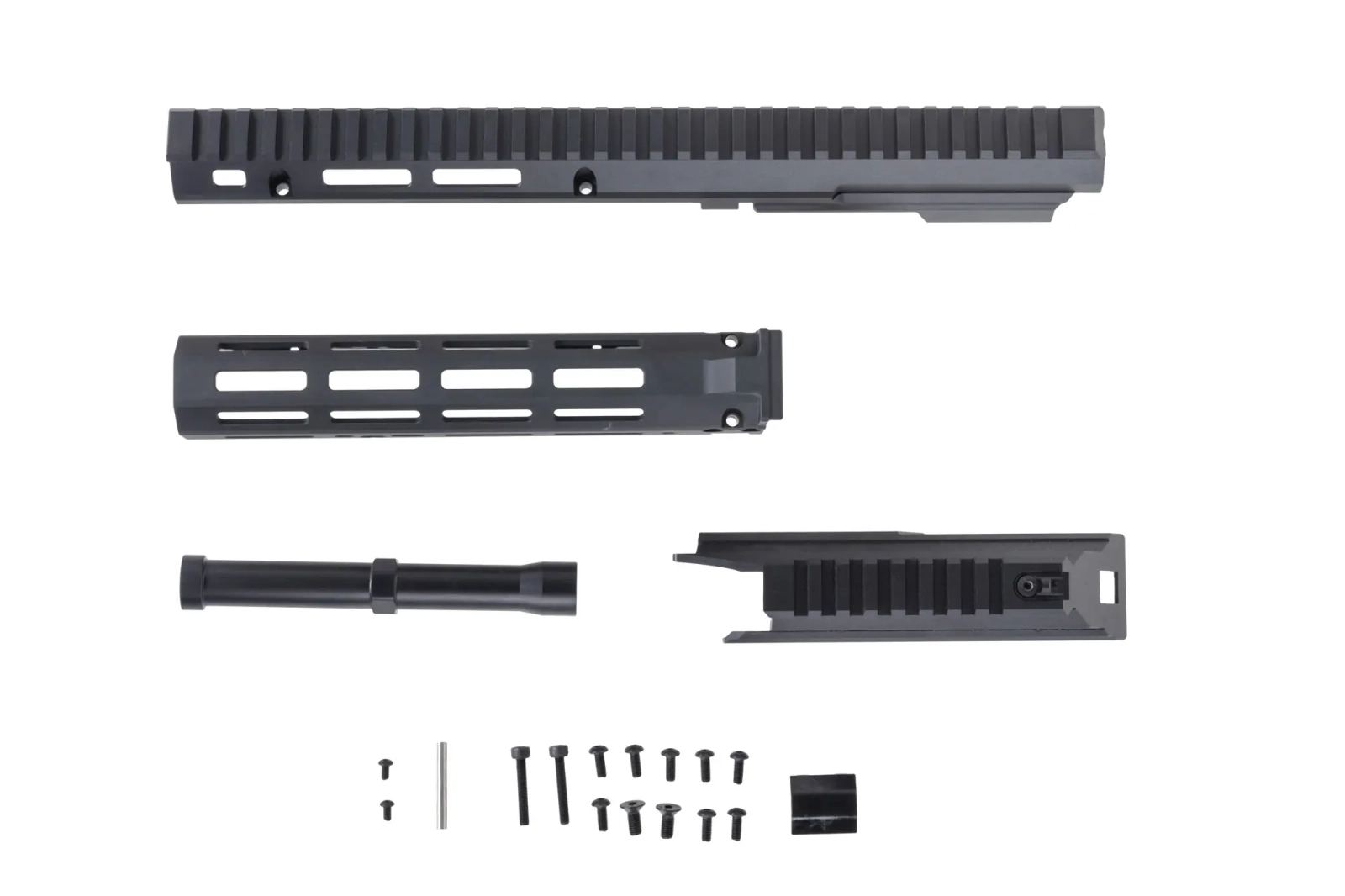 Produkt został stworzony przy wykorzystaniu maszyn CNC, posiada mocowania Picatinny 20 mm, które pozwolą na montaż wszelkich akcesoriów pokroju optyki, puszek PEQ itp. Dodatkowo warto zwrócić uwagę na mocowania M-LOK, które pozwolą wyposażyć replikę w latarki czy chwyty pionowe.