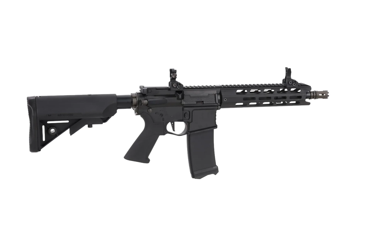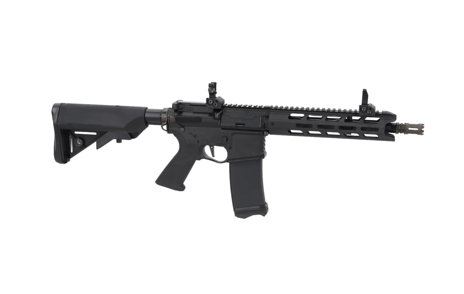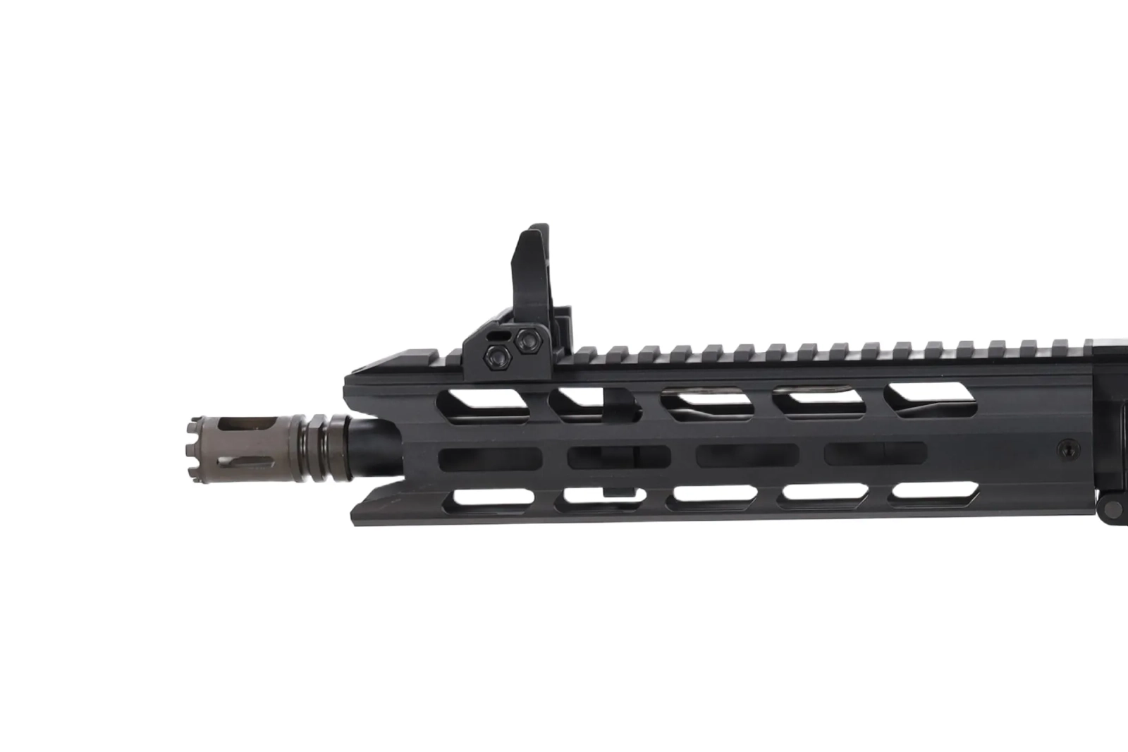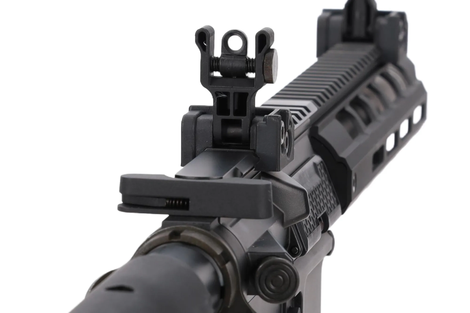 Model posiada łoże M-LOK na szczycie którego znajduje się szyna RIS - całość umożliwi montaż wszelkiej maści dodatków takich jak kolimatory, lasery, chwyty, latarki itp. Na szynie mamy uprzednio zamontowane przyrządy mechaniczne typu flip-up.