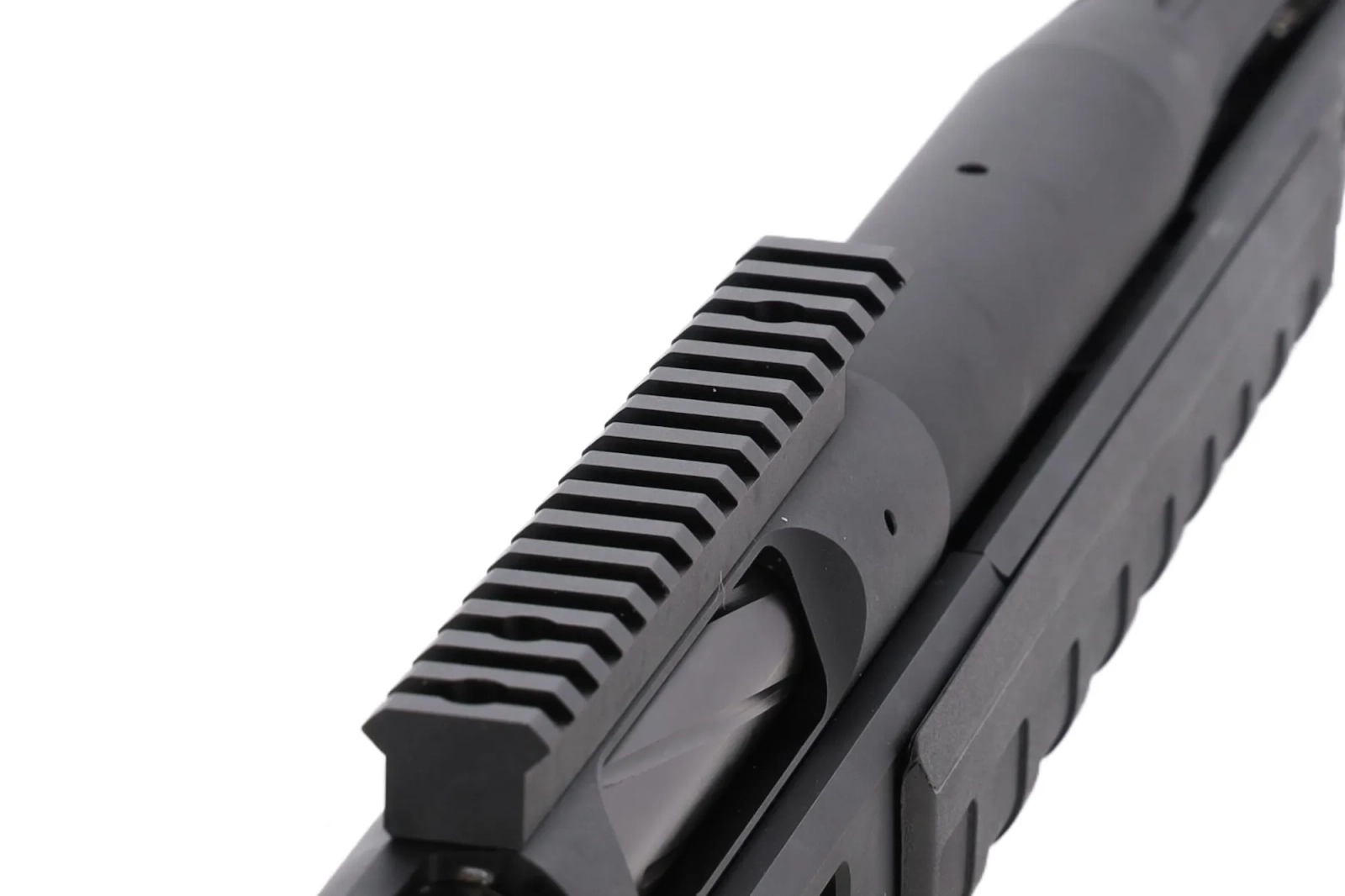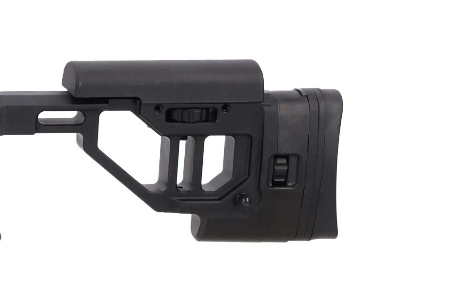 W wytrzymałego polimeru wykonano łoże karabinu, ergonomiczny chwyt pistoletowy (bardzo wygodny kąt!), magazynek oraz regulowaną, składaną kolbę (sam zespół kolby jest aluminiowy - CNC)