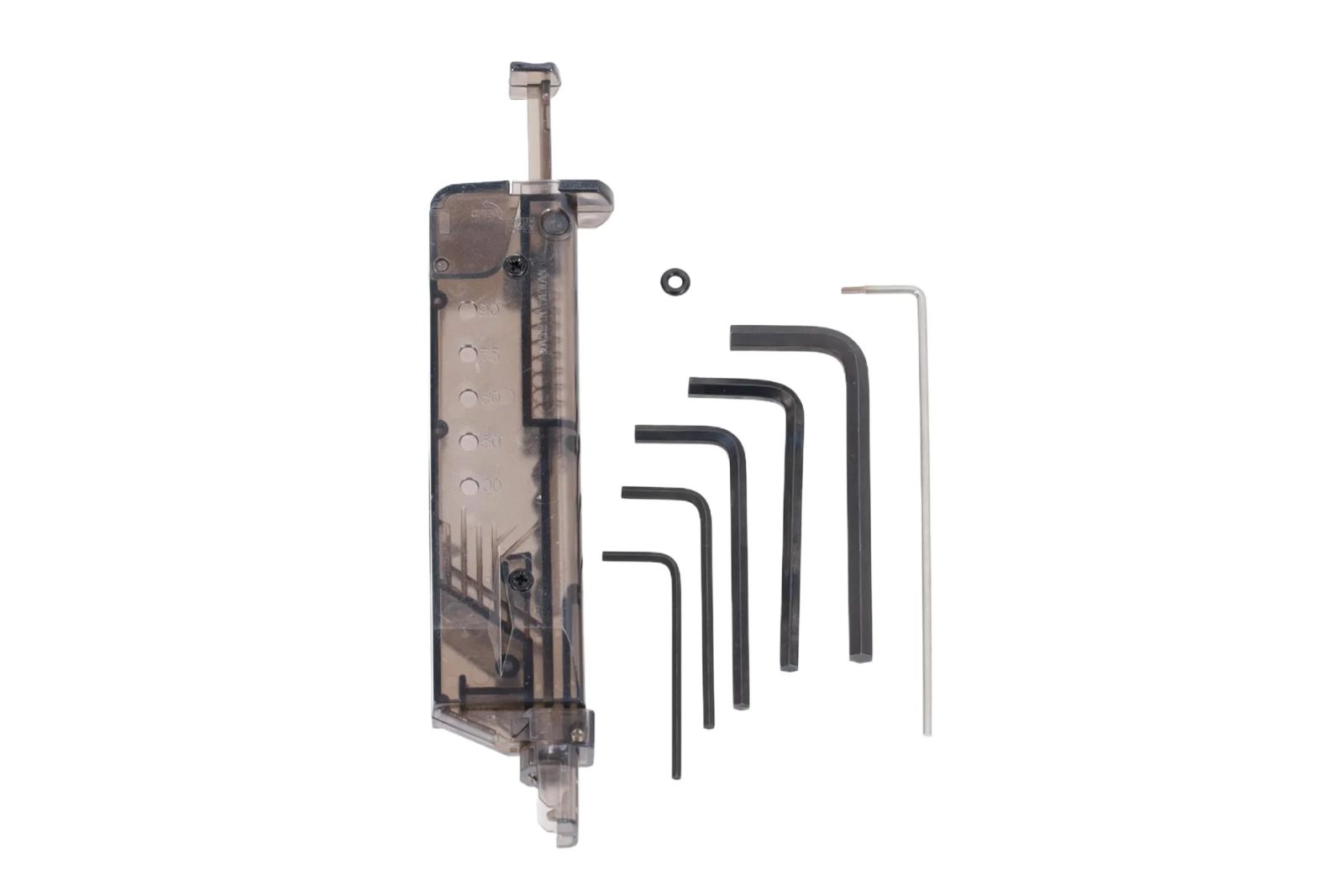 Wewnątrz repliki znajdziemy m.in. stalowy cylinder 37cc, aluminiową komorę hop-up TDC. Co ważne, za wyjątkiem spustu oraz bezpiecznika, części wewnętrzne są w standardzie VSR, co w przypadku chęci tuningu, będzie oznaczać, że części będą łatwo dostępne na rynku.