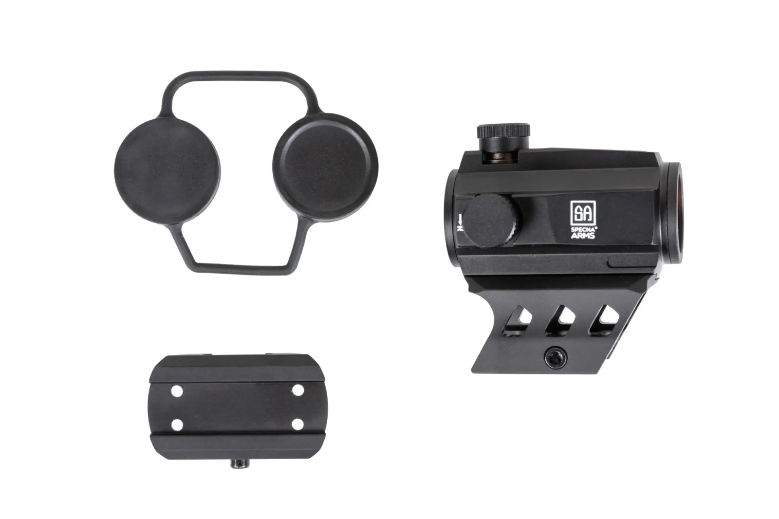 Kolimator ASG od producenta Specna Arms cechuje się wysoką wytrzymałością, niewielkimi rozmiarami oraz panelem solarnym, który pozwoli na zwiększenie żywotności baterii (Nawet do 50 tyś. godzin pracy na jednej baterii). Model wyświetla kropkę w kolorze czerwonym, a jej jasność można wyregulować dzięki gumowym guzikom, które są umiejscowione z boku modelu. Zastosowanie kolimatora pozwala na błyskawiczne i precyzyjne celowanie podczas wszelkiego rodzaju walk airsoftowych - zarówno w lesie jak i w ciasnych korytarzach. Kolimator jest odporny na ciężkie warunki pogodowe - IPX7 (deszcz, śnieg) oraz zabezpieczony przed nadmiernym parowaniem szkieł. W zestawie otrzymujemy 2 montaże na szyny RIS. Wysoki oraz niski