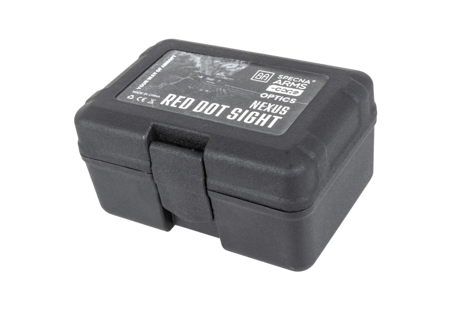 Celownik kolimatorowy Specna Arms CORE™ Nexus  to lekki, kompaktowy model, który pozwoli na szybkie, dokładne celowanie w każdych warunkach. Produkt ma możliwość wyświetlenia czerwonej kropki - 8 poziomów jasności oraz prostą, aczkolwiek skuteczną regulację pion-poziom (1 klik = 1 MOA). W zestawie otrzymamy zarówno wysoki montaż, który będzie można zamontować bez dodatkowych narzędzi, jak i niski.