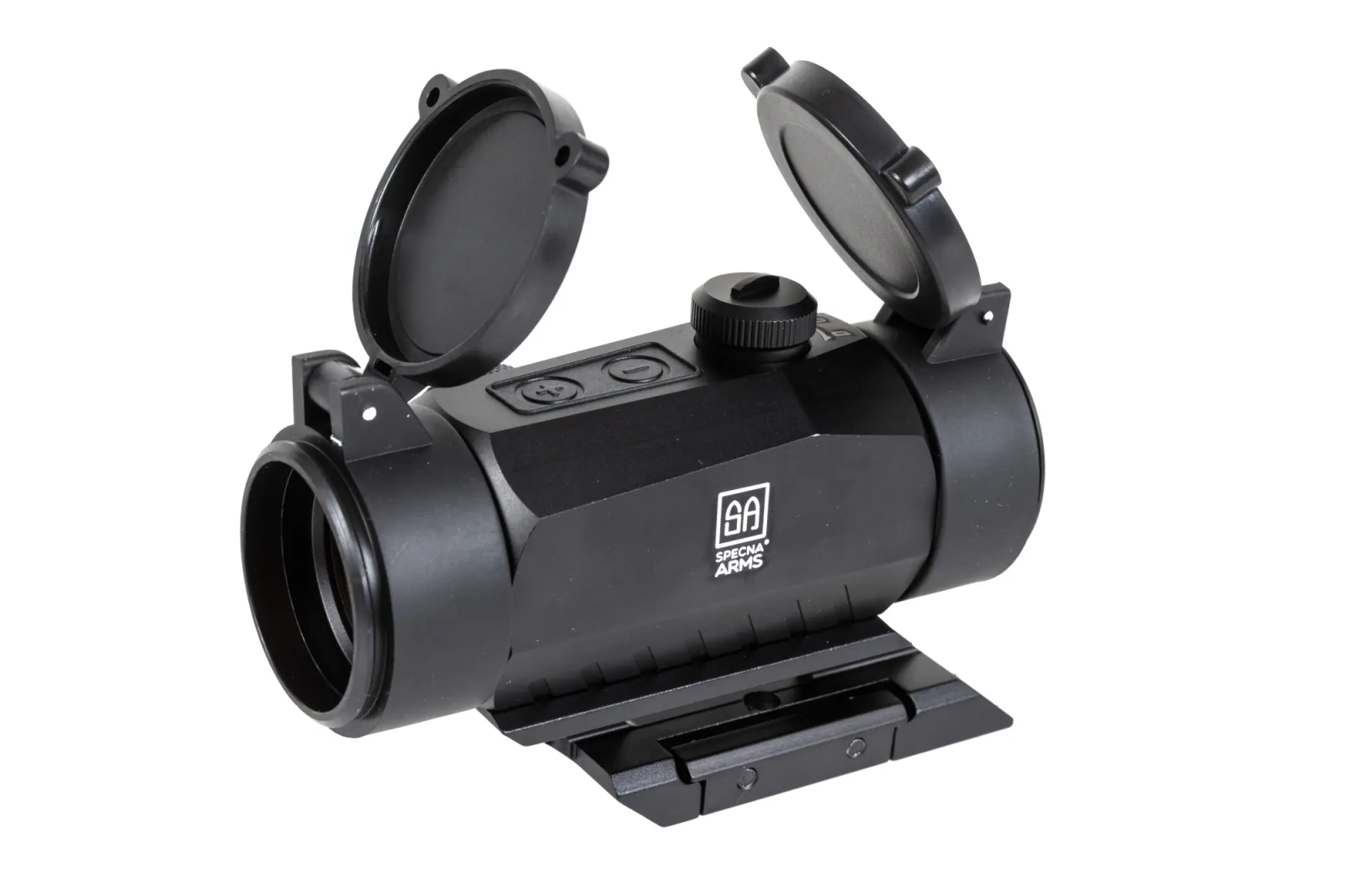 Kolimator od producenta Specna Arms to wykonany głównie z wysokiej jakości aluminium model, który posiada możliwość wyświetlenia czerwonej kropki o wielkości 2 MOA. Gumowe guziki znajdujące się na szczycie modelu pozwolą na sprawną regulację jasności kropki, a sam produkt posiada prostą, aczkolwiek skuteczną regulację pion-poziom (1 klik = 1MOA).